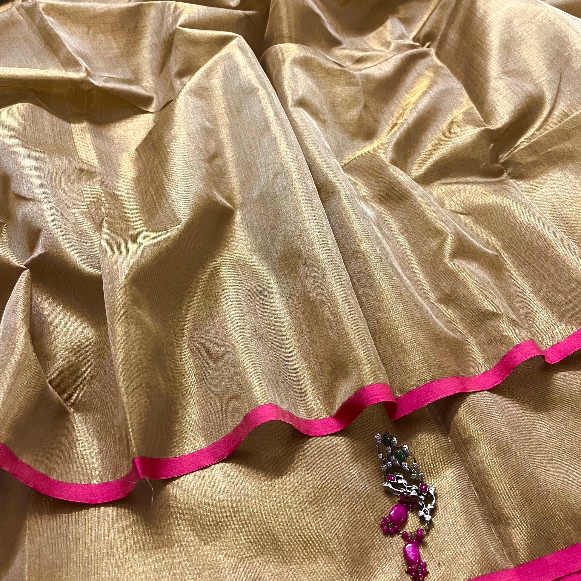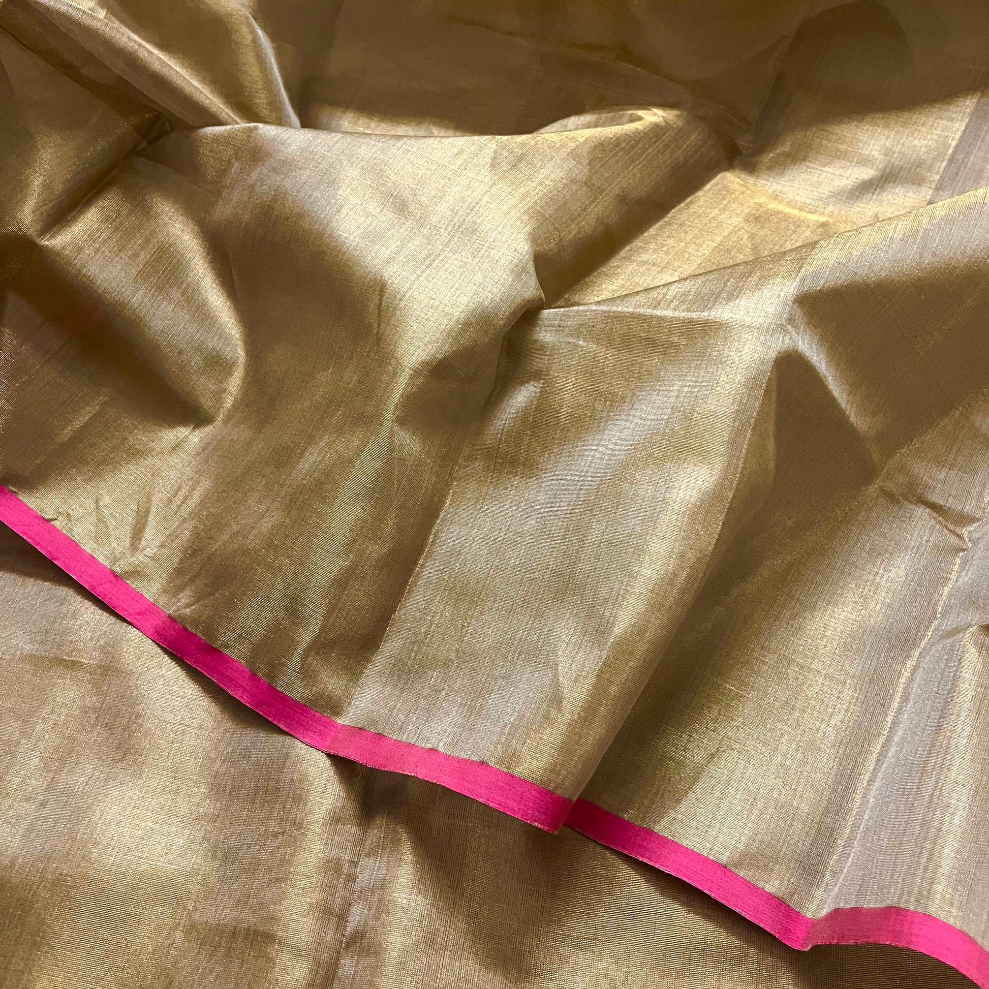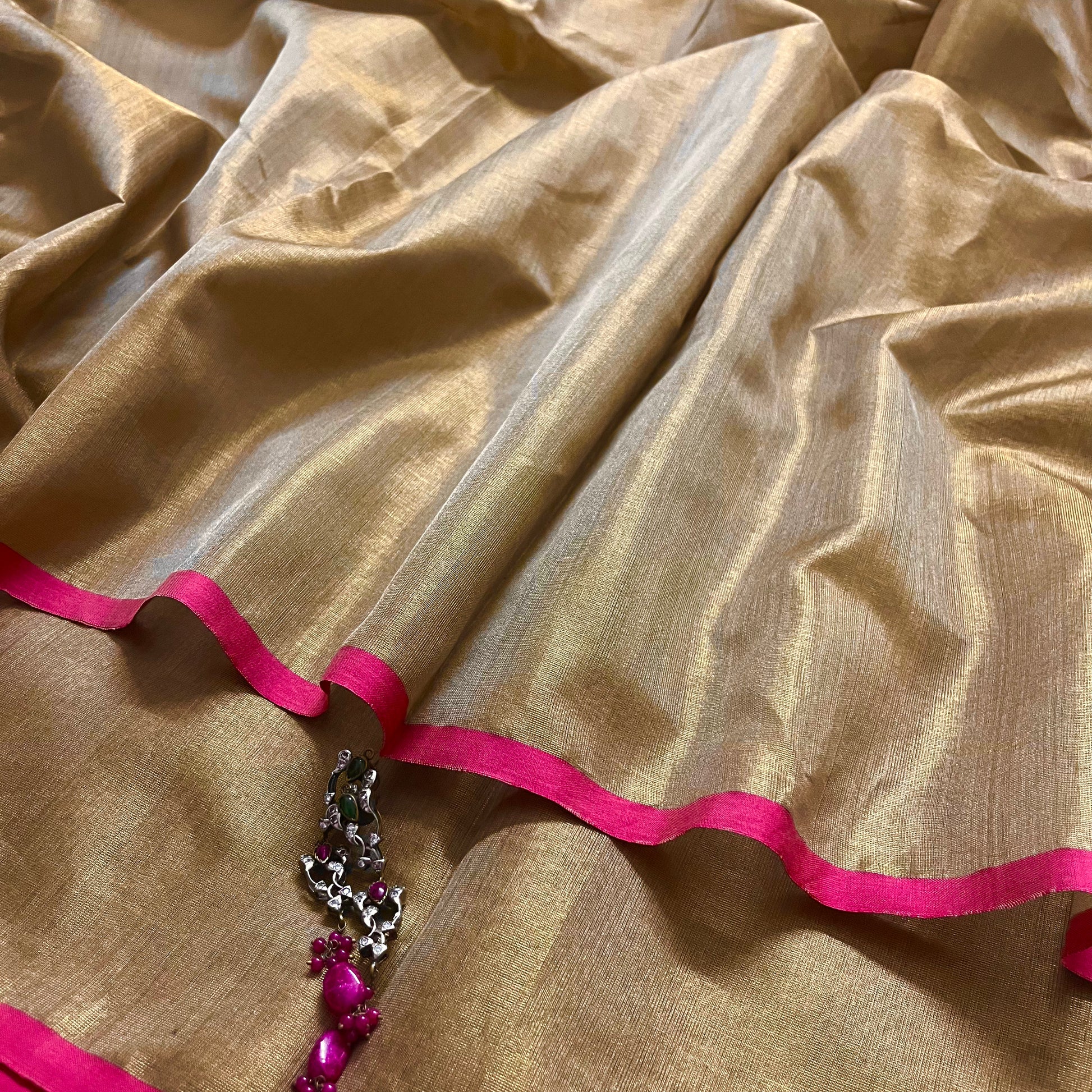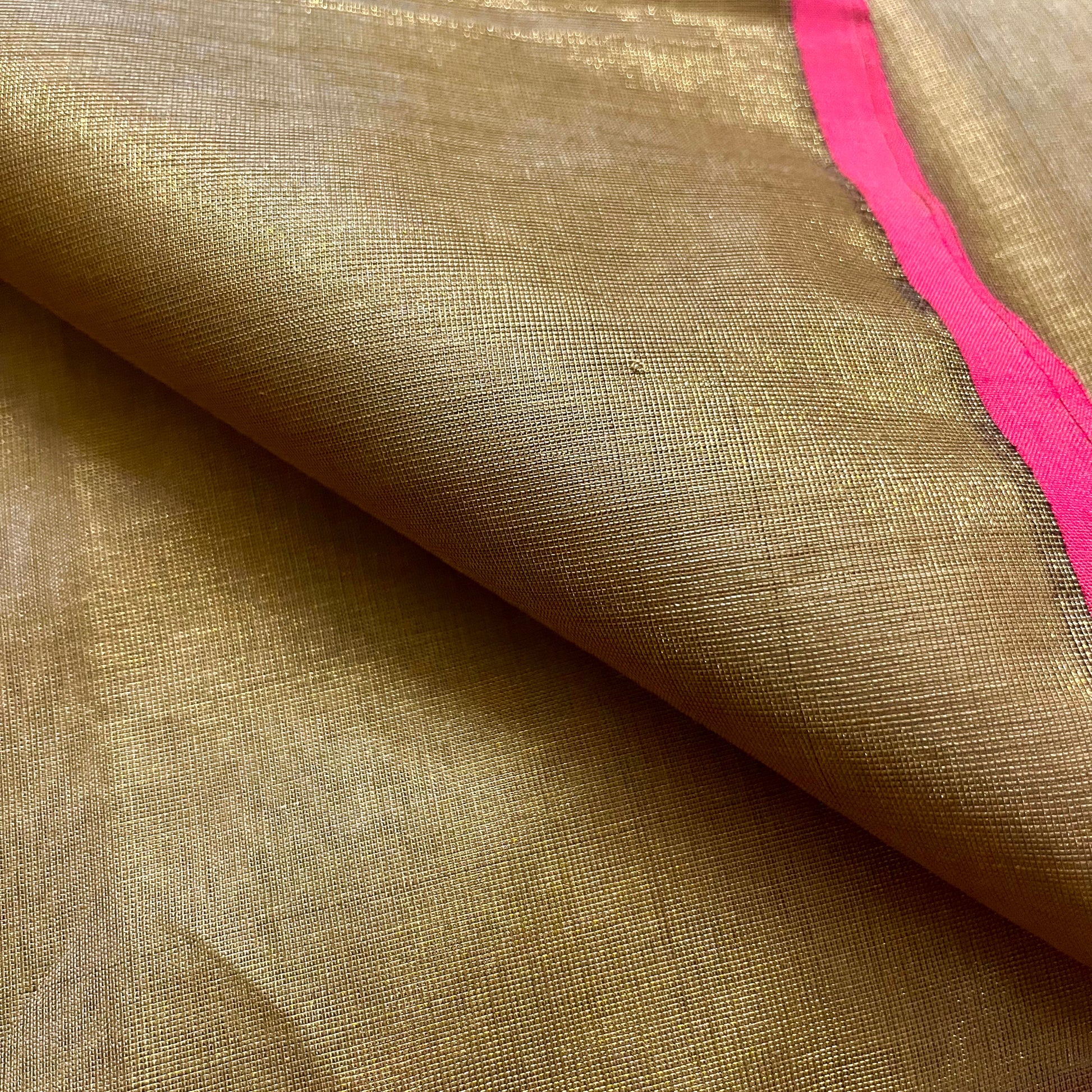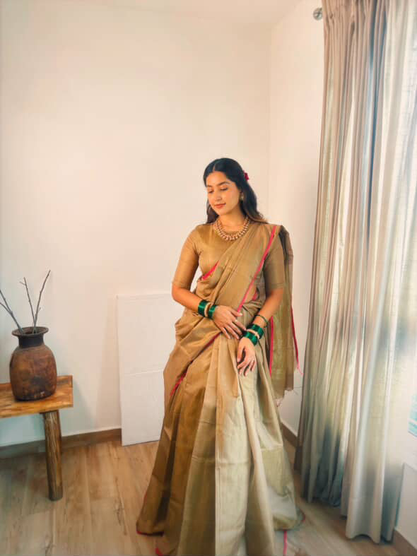 Antique gold & pink maheshwari tissue silk saree with zari lines on pallu