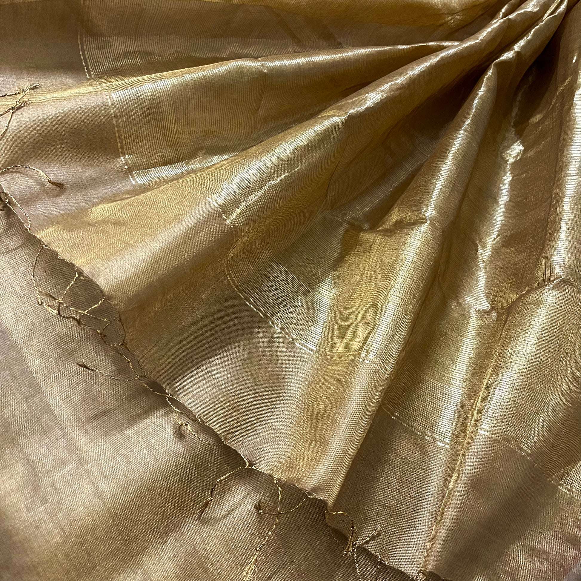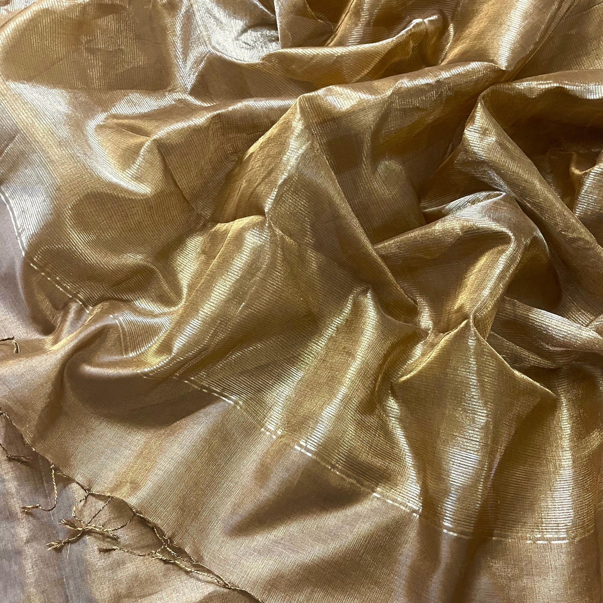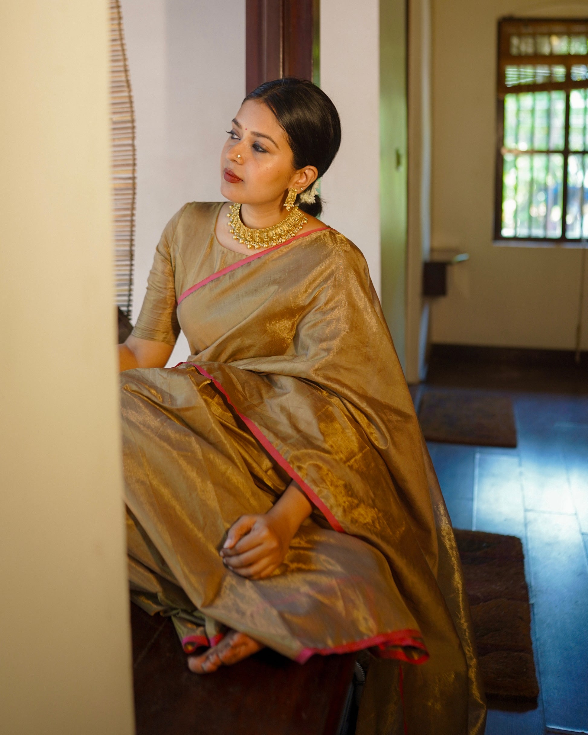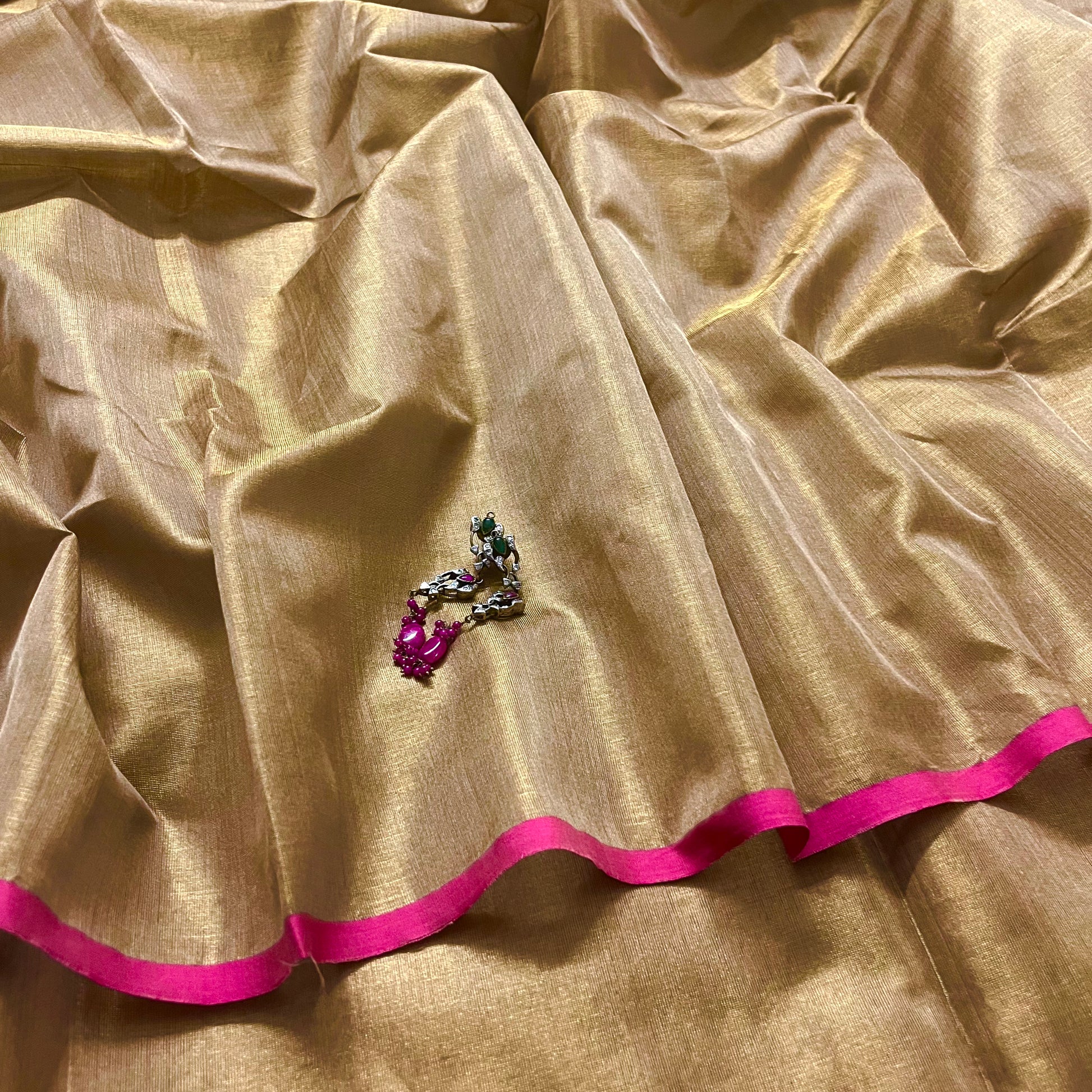 Antique gold & pink maheshwari tissue silk saree with zari lines on pallu