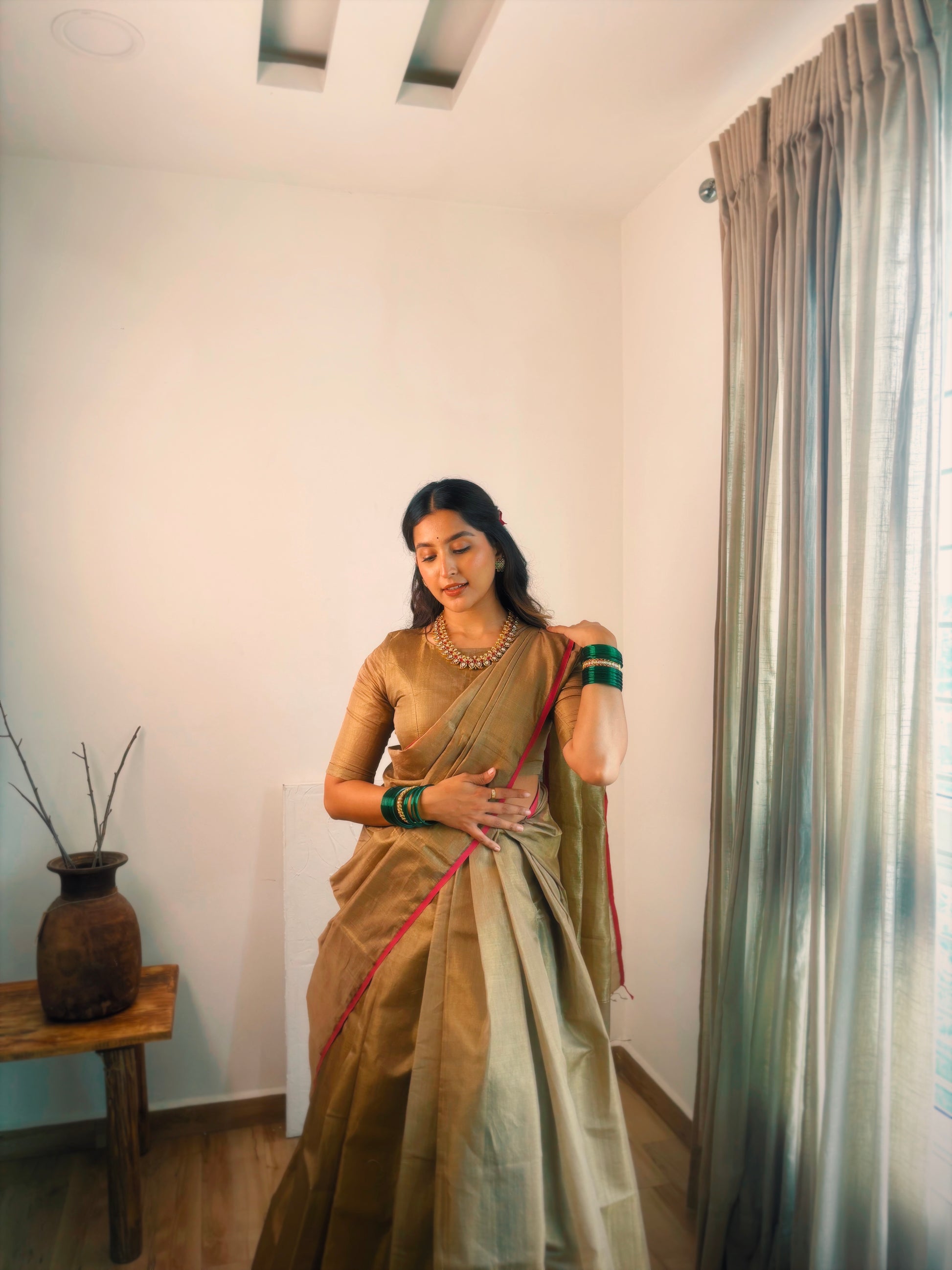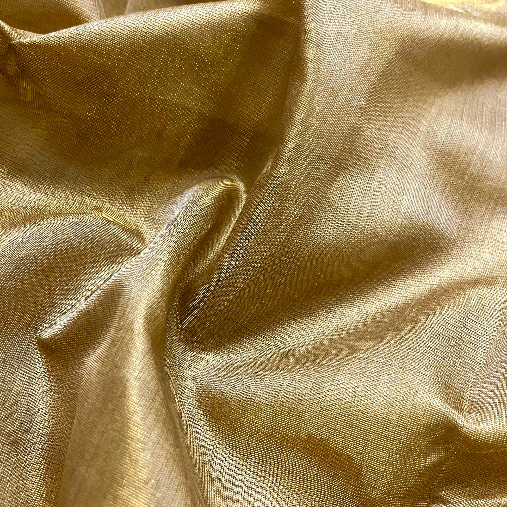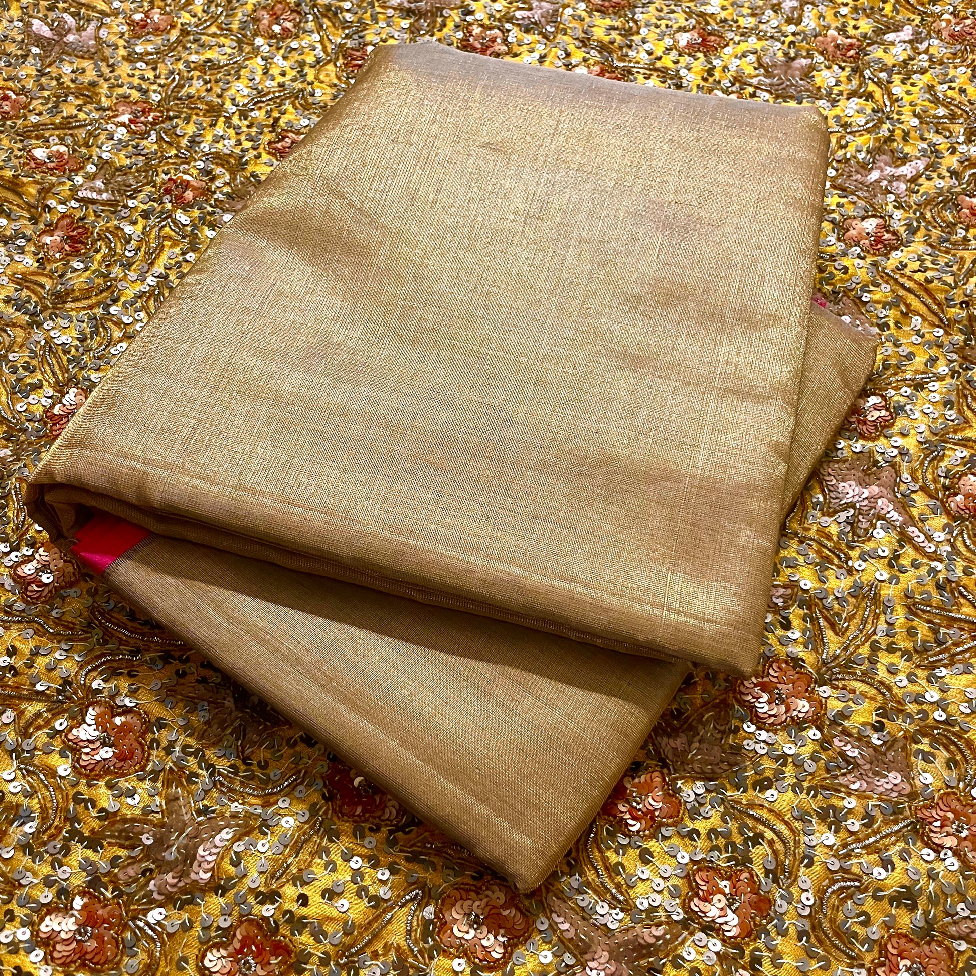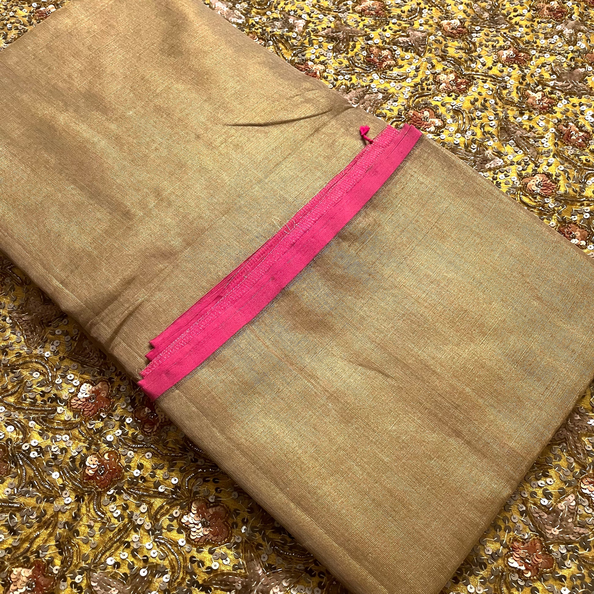 Antique gold & pink maheshwari tissue silk saree with zari lines on pallu