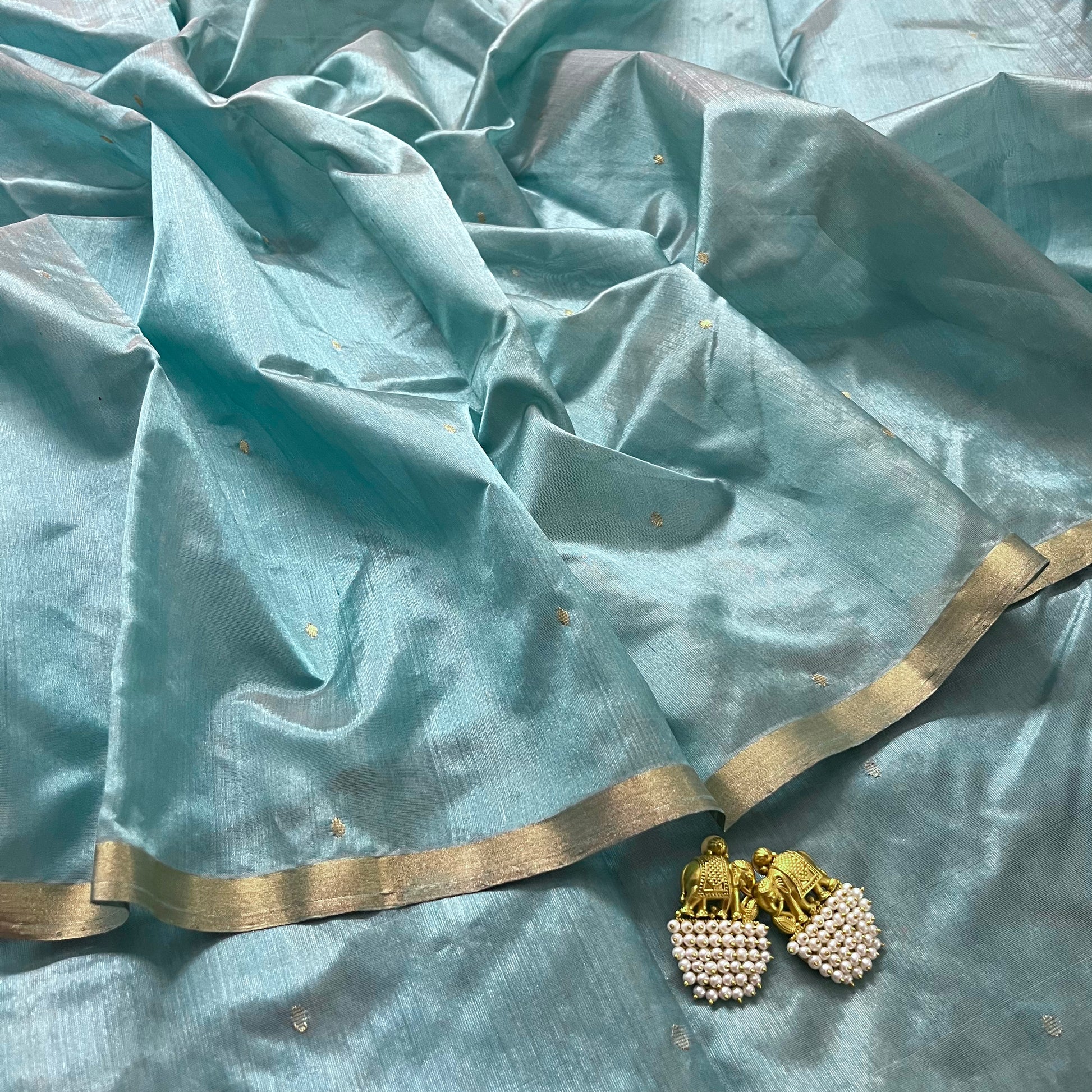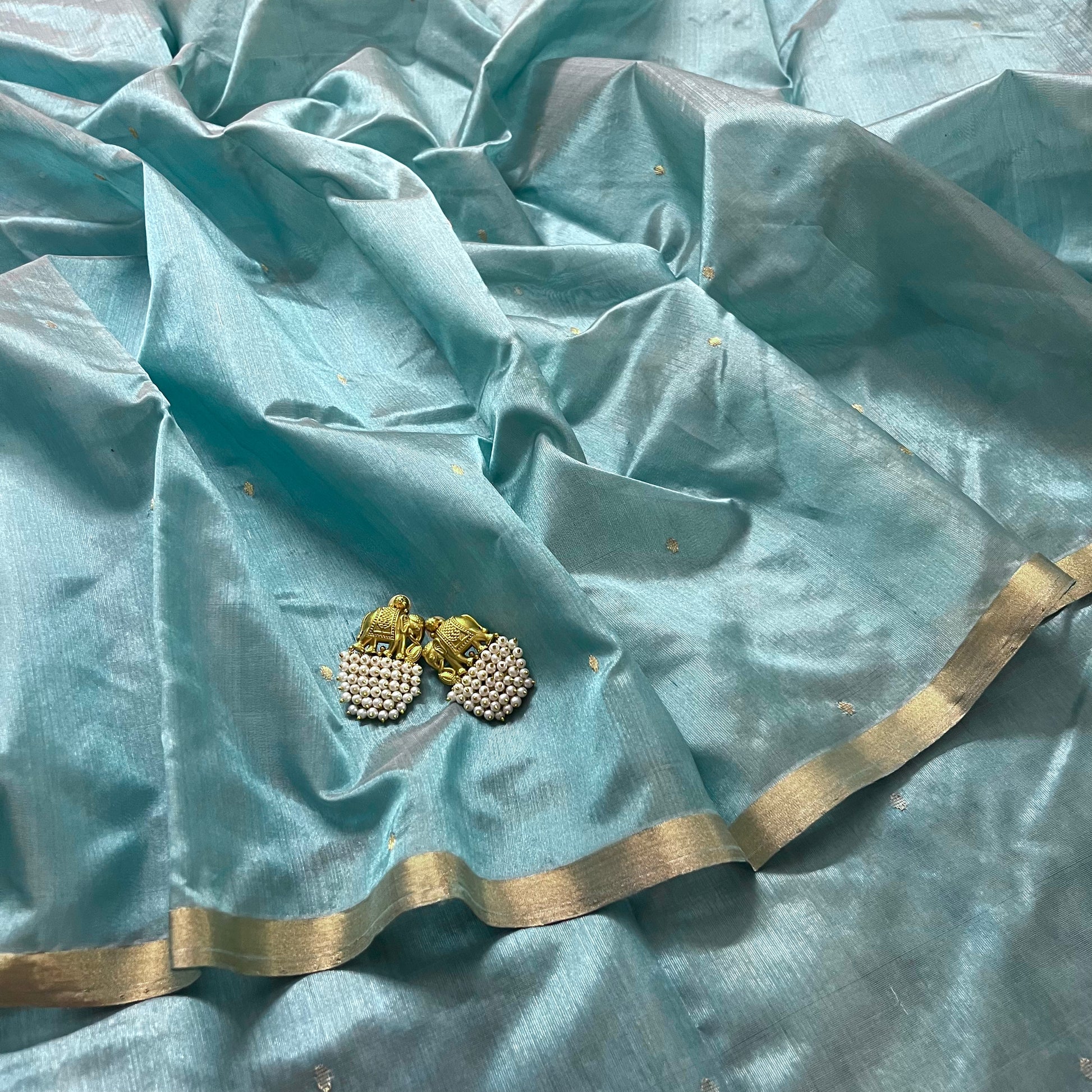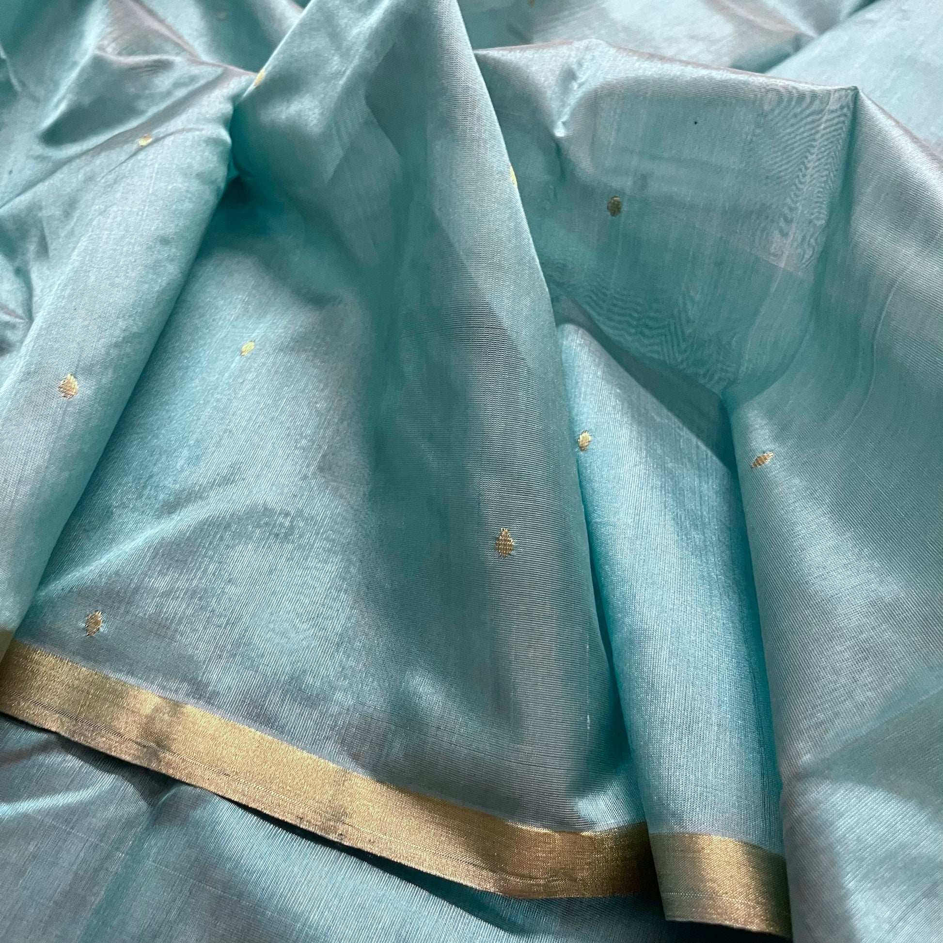 The saree has has zari border with zari bootis all over. It comes with a running blouse piece. Fabric of the saree is chanderi pattu silk