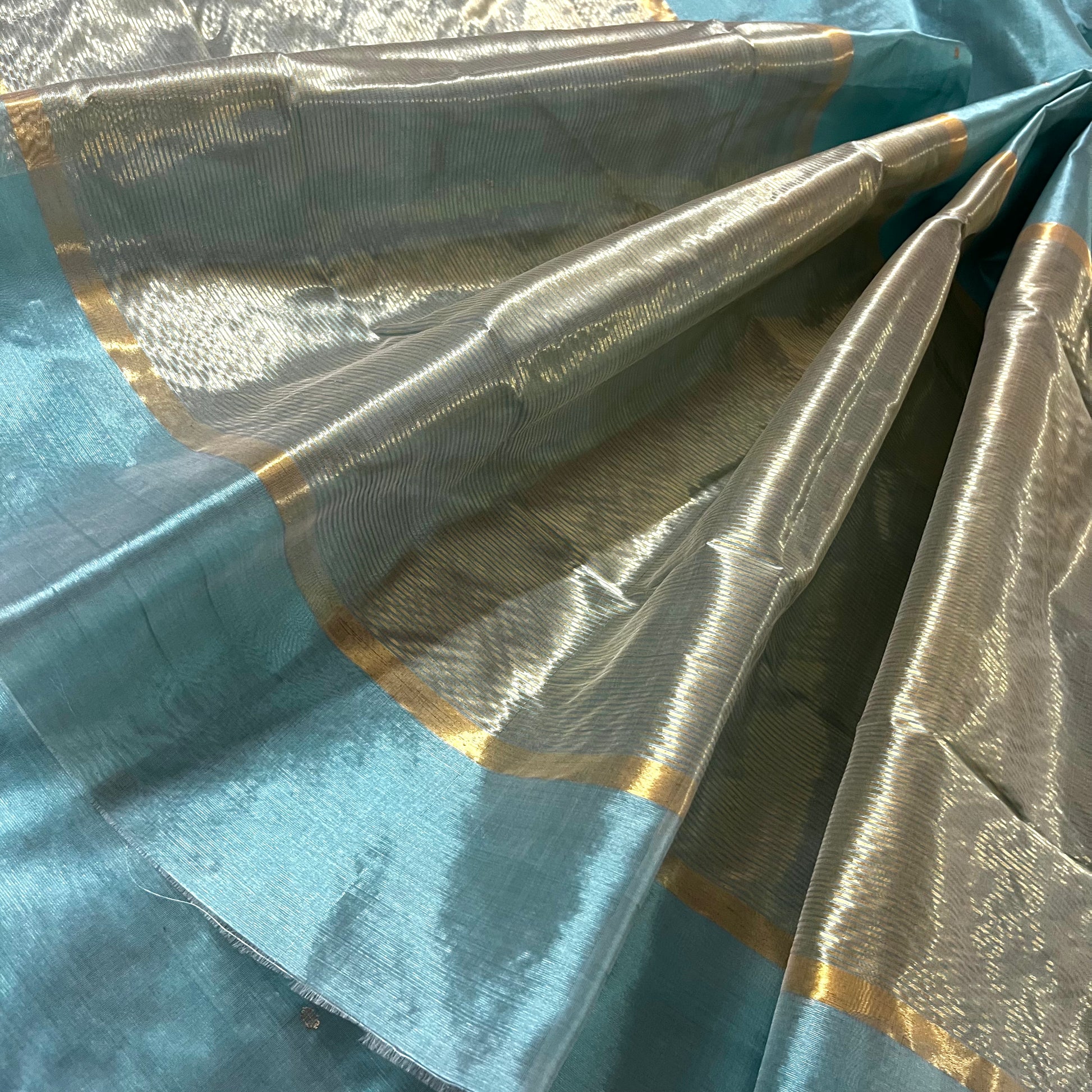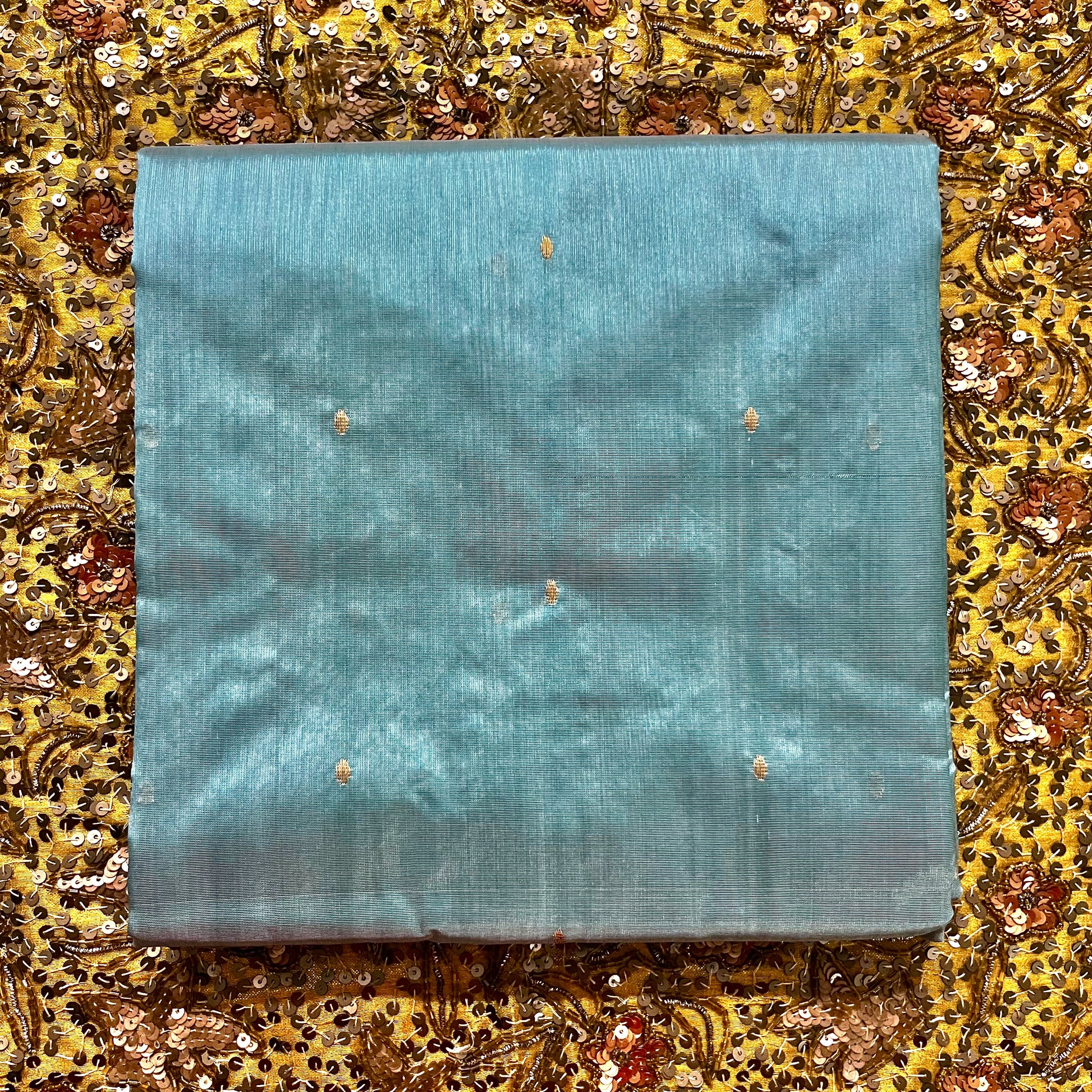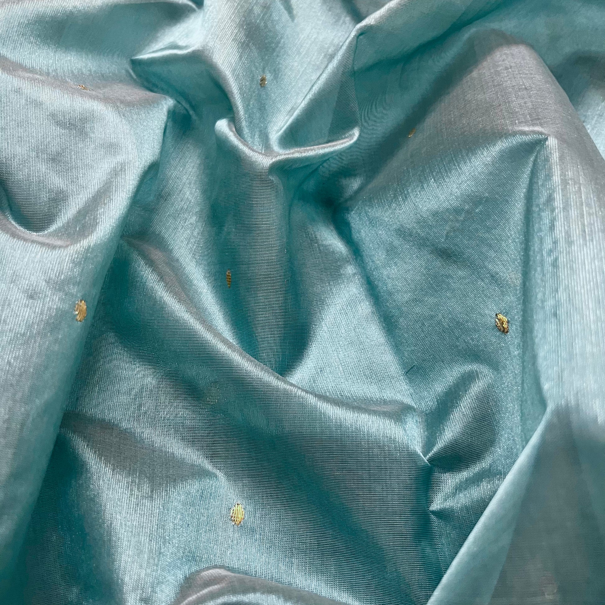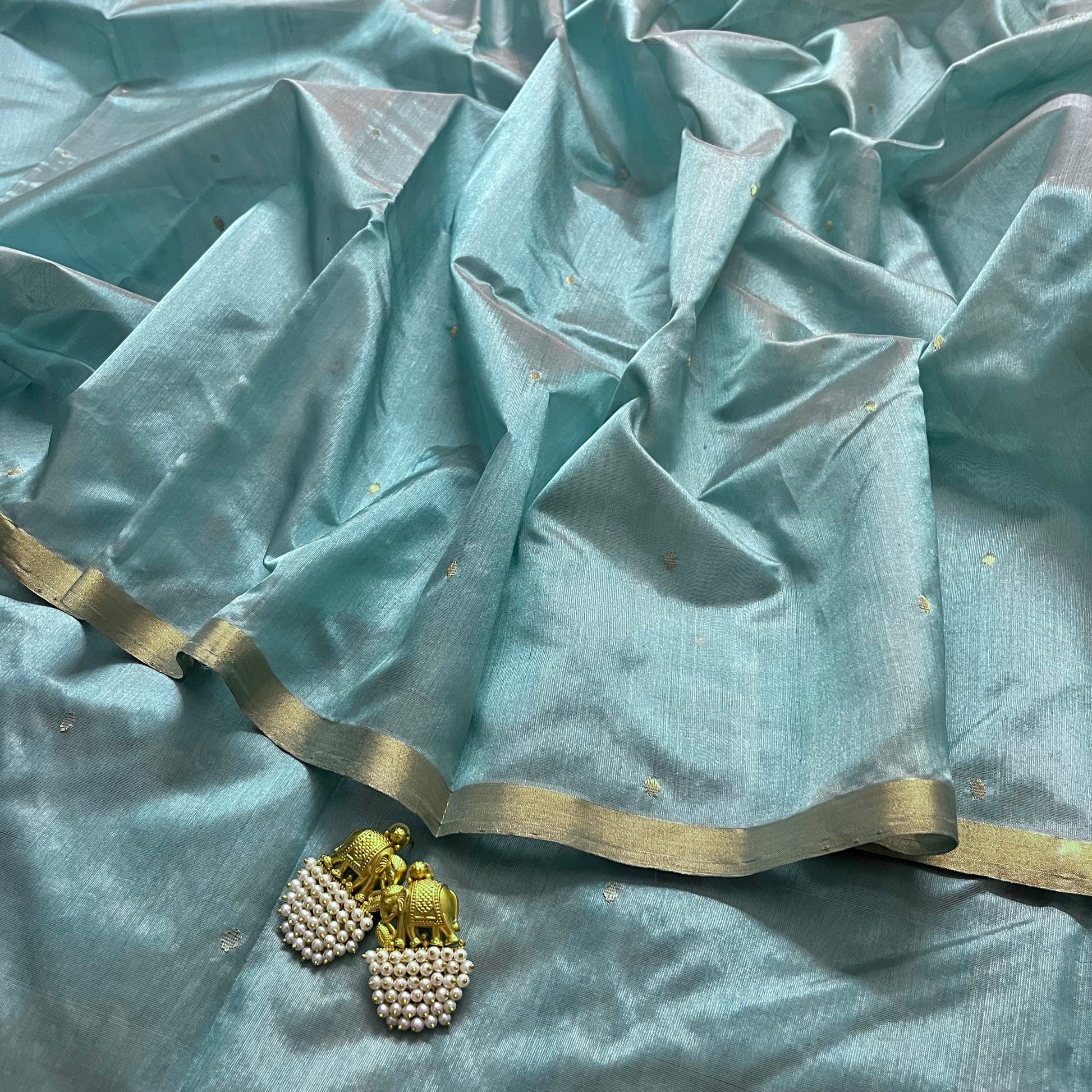 The saree has has zari border with zari bootis all over. It comes with a running blouse piece. Fabric of the saree is chanderi pattu silk