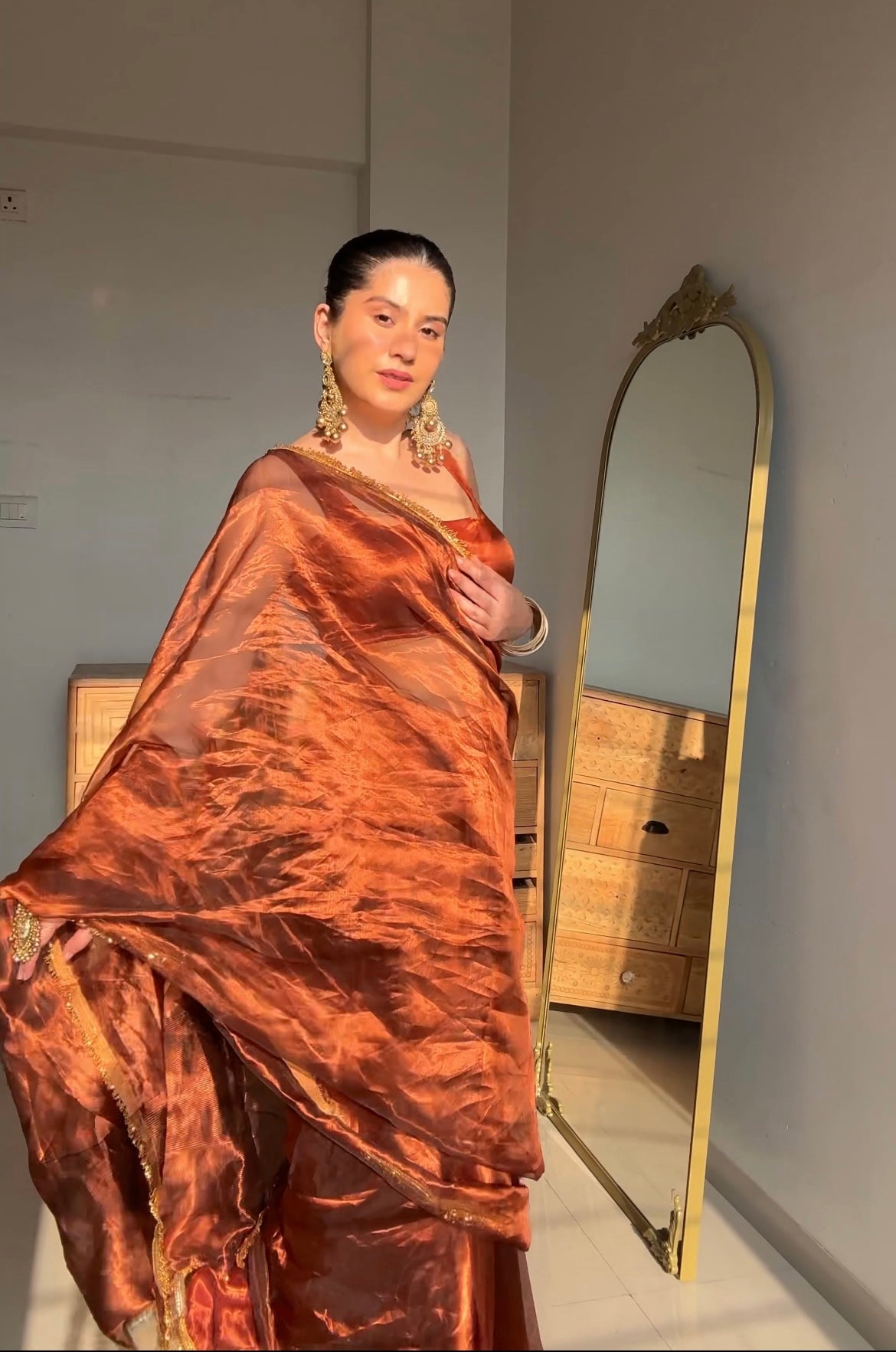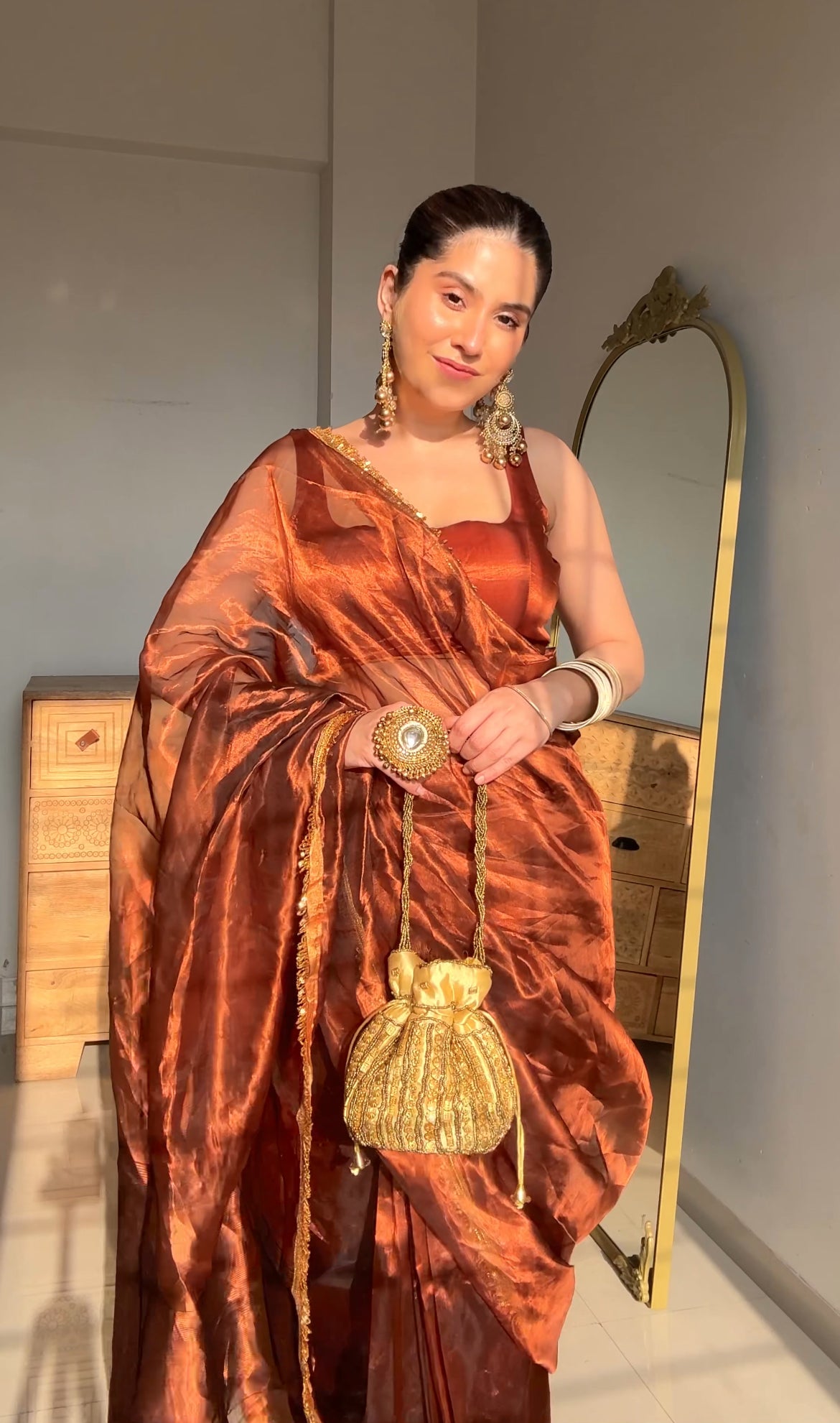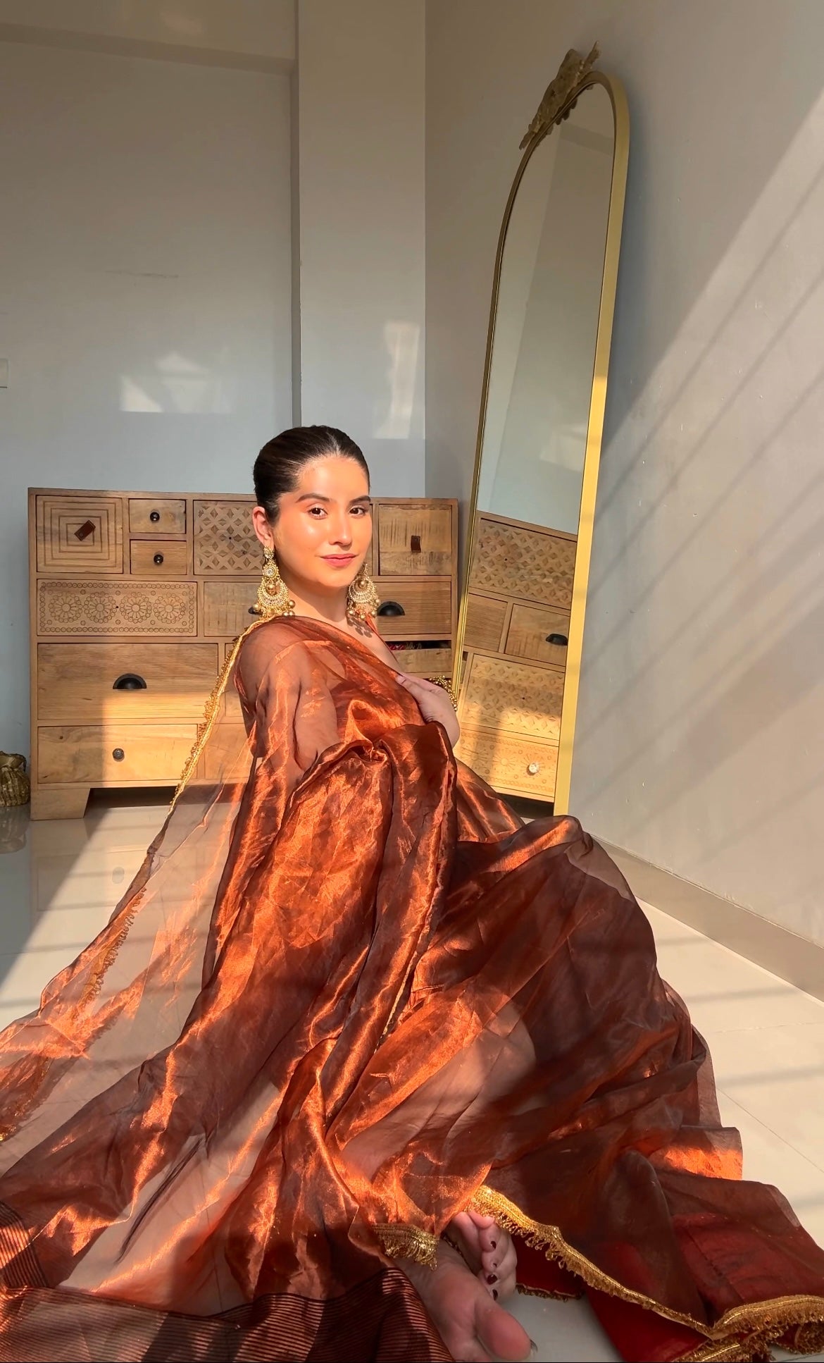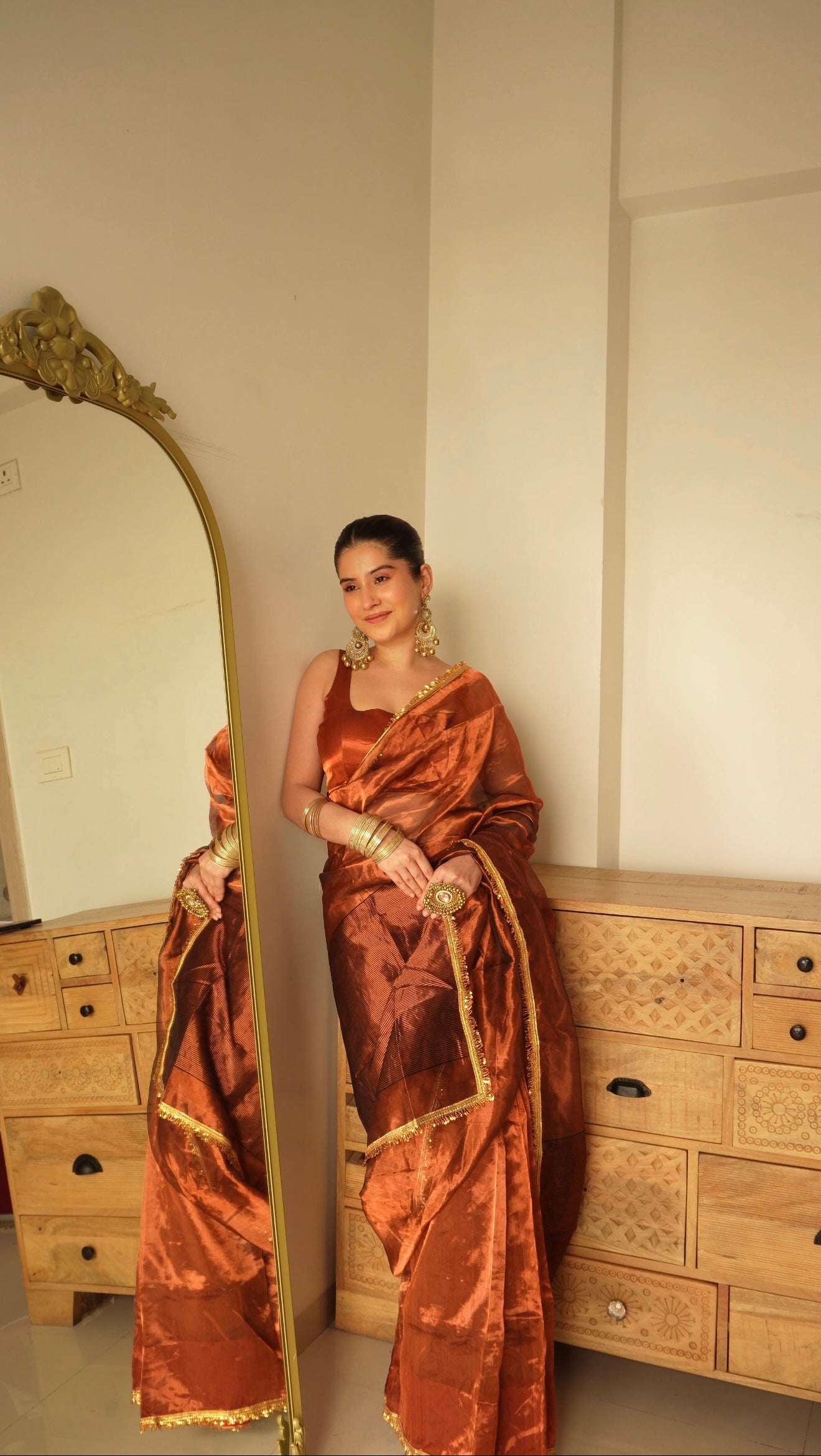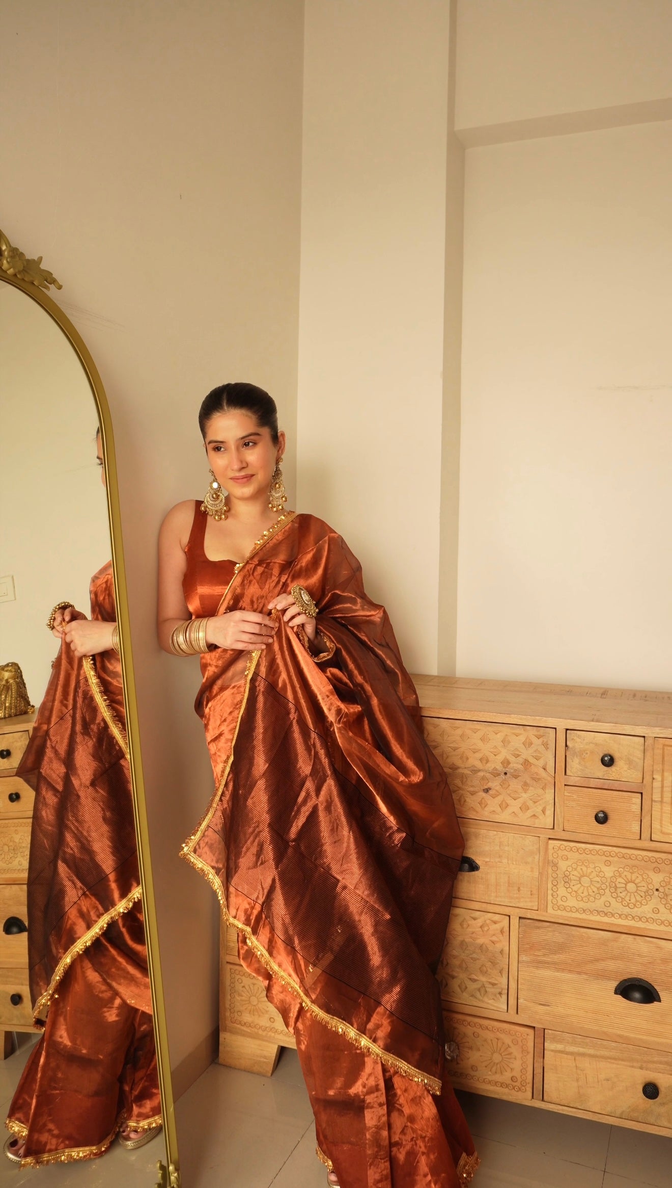 The saree has Zari border all over. It comes with a running blouse piece. Fabric of the saree is Chanderi tissue Silk