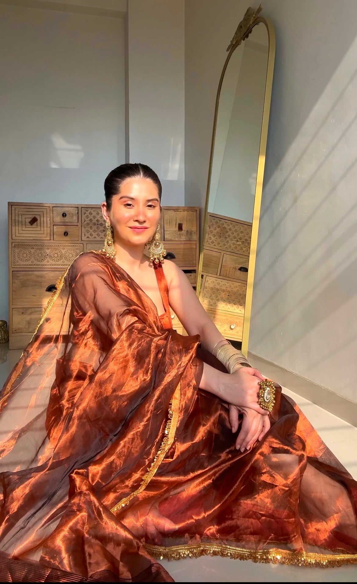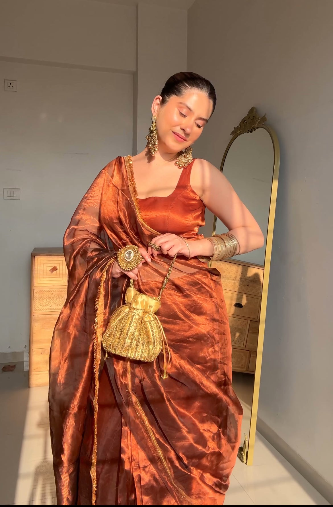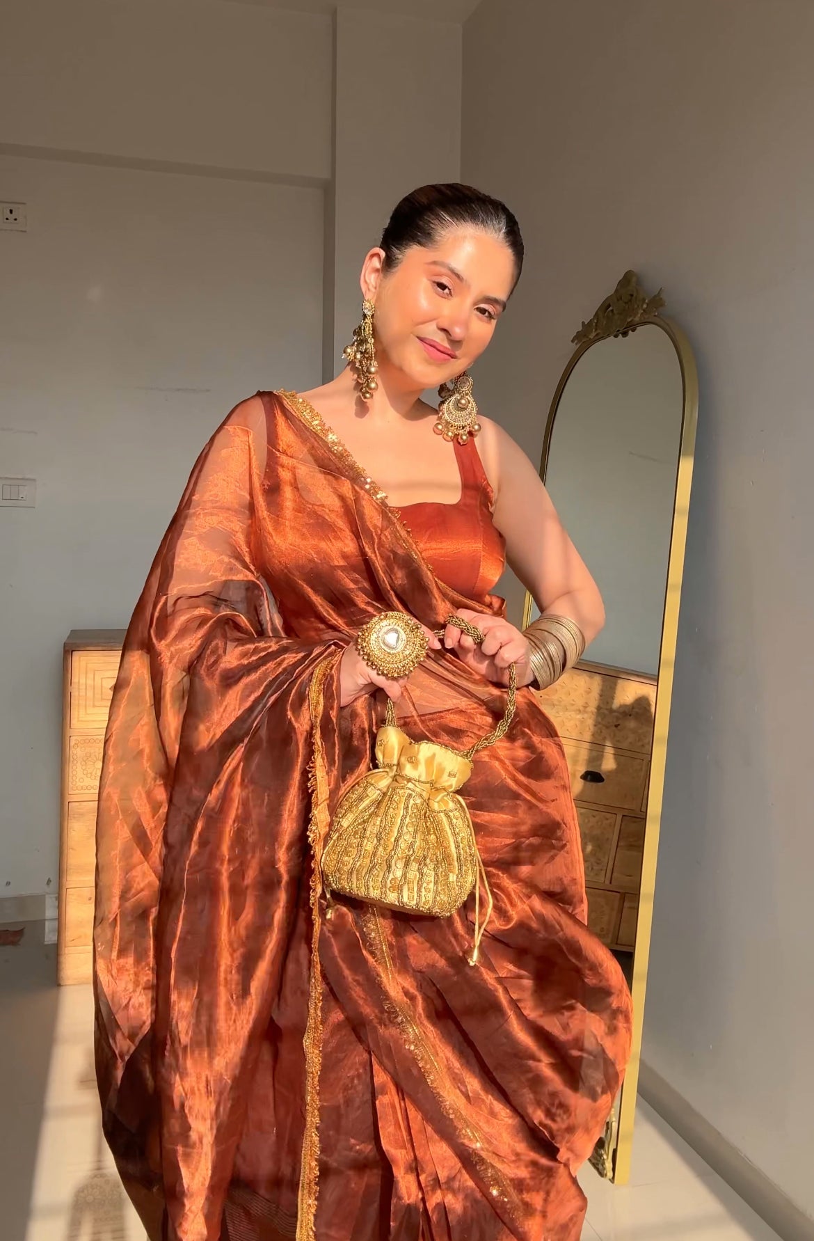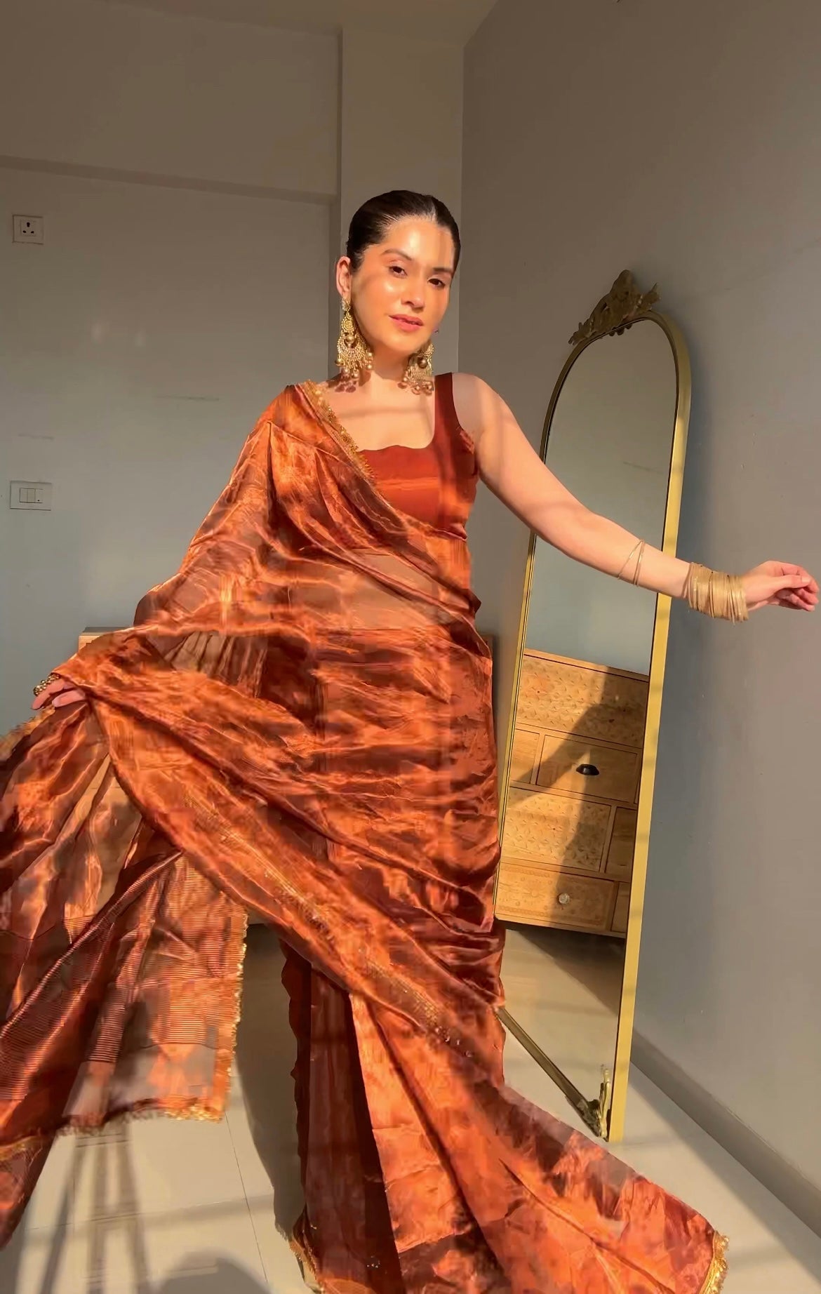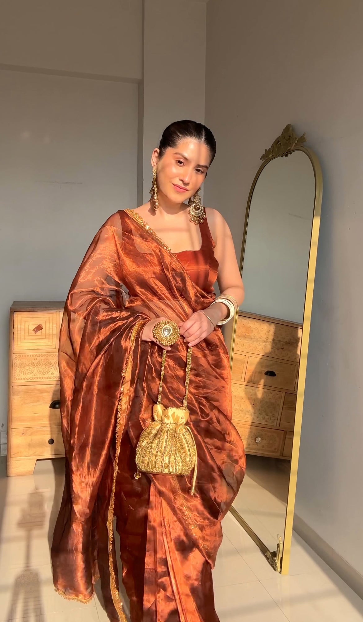 The saree has Zari border all over. It comes with a running blouse piece. Fabric of the saree is Chanderi tissue Silk