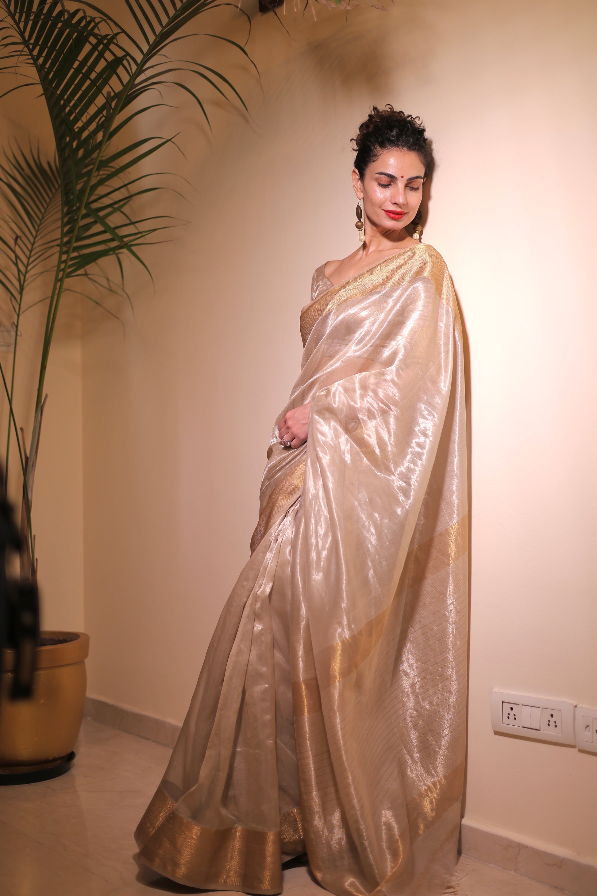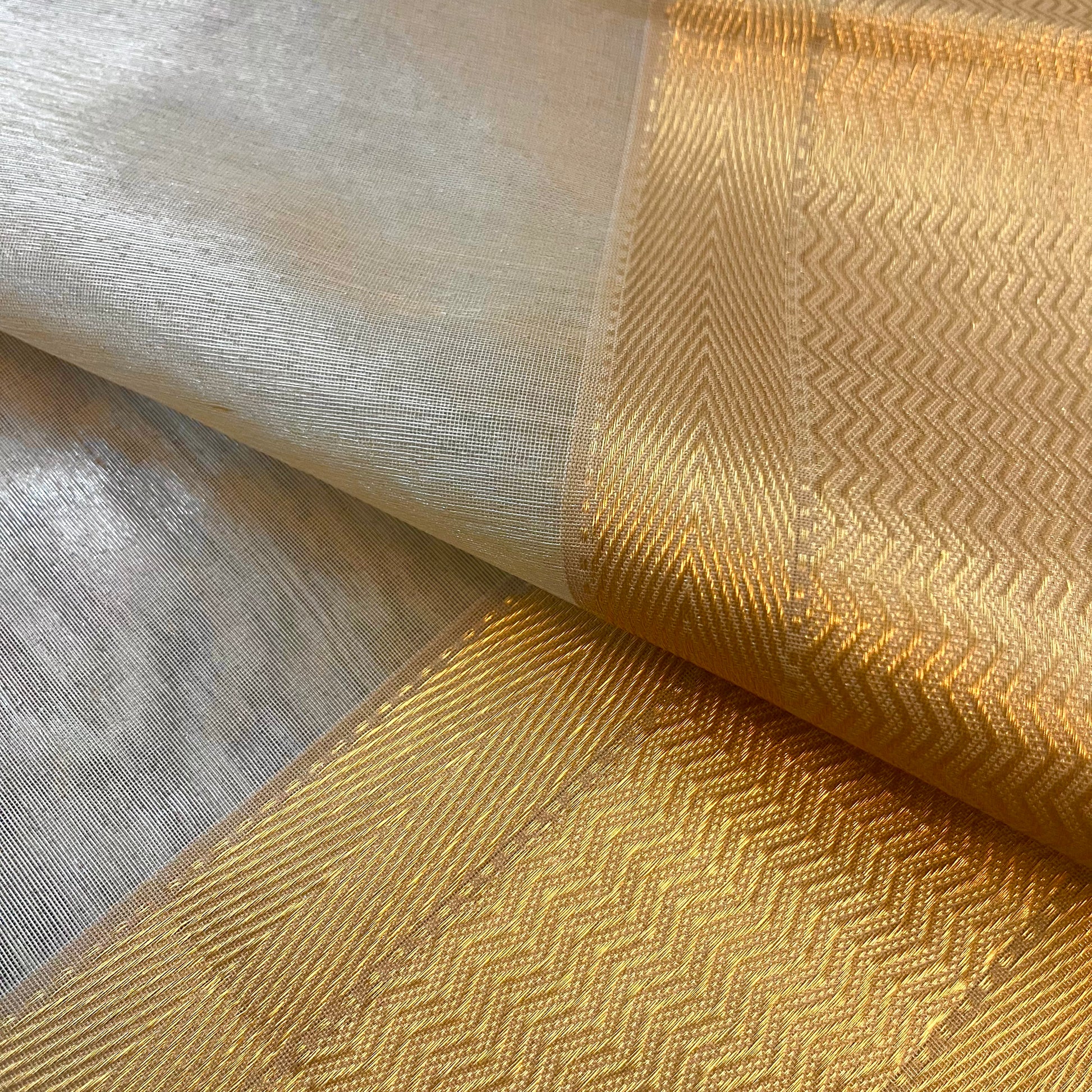 The saree has Zari border with Zari lines on Pallu . It comes with a running blouse piece. Fabric of the saree is Maheshwari Tissue Silk
