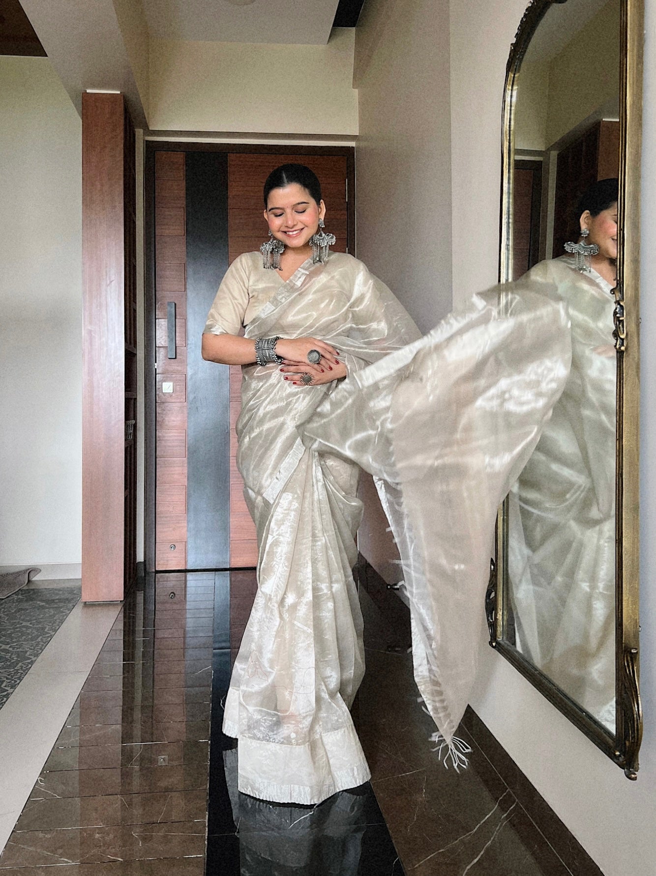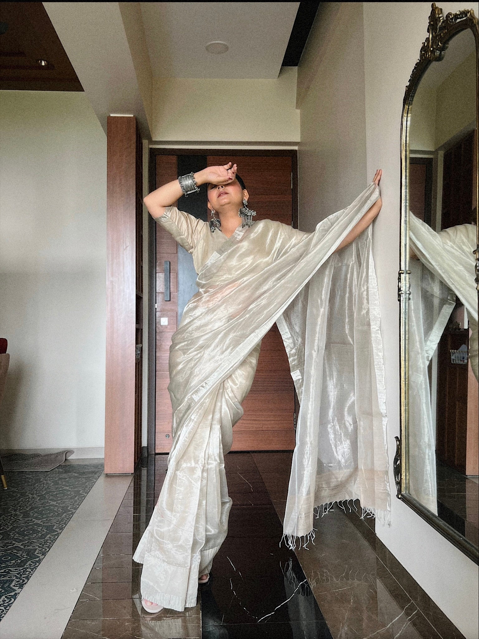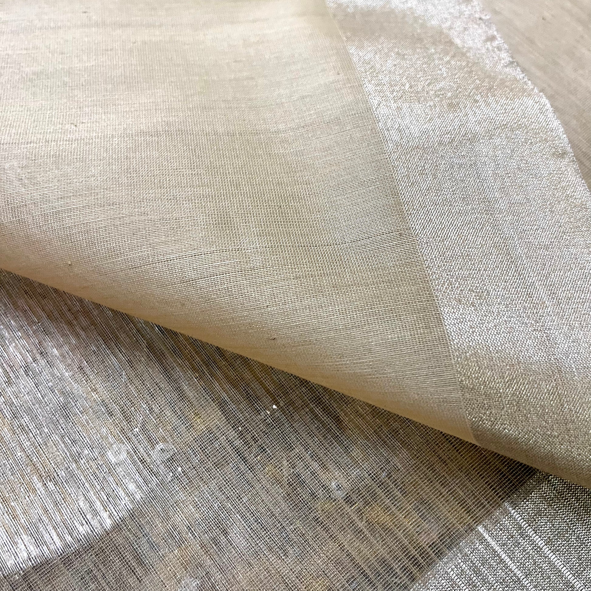 The saree has Zari border with Zari lines all over. It comes with a running blouse piece. Fabric of the saree is Maheshwari Cotton Silk