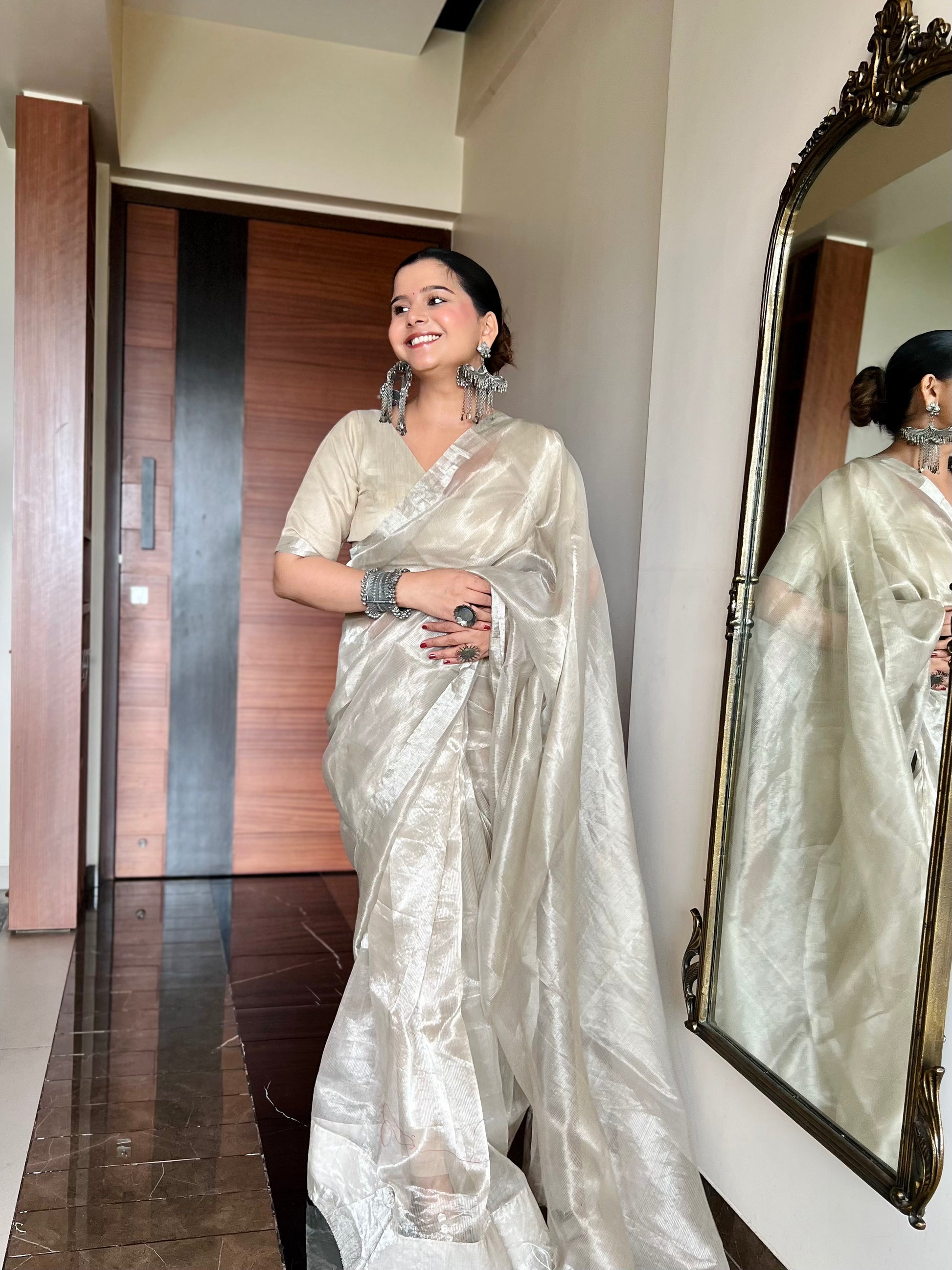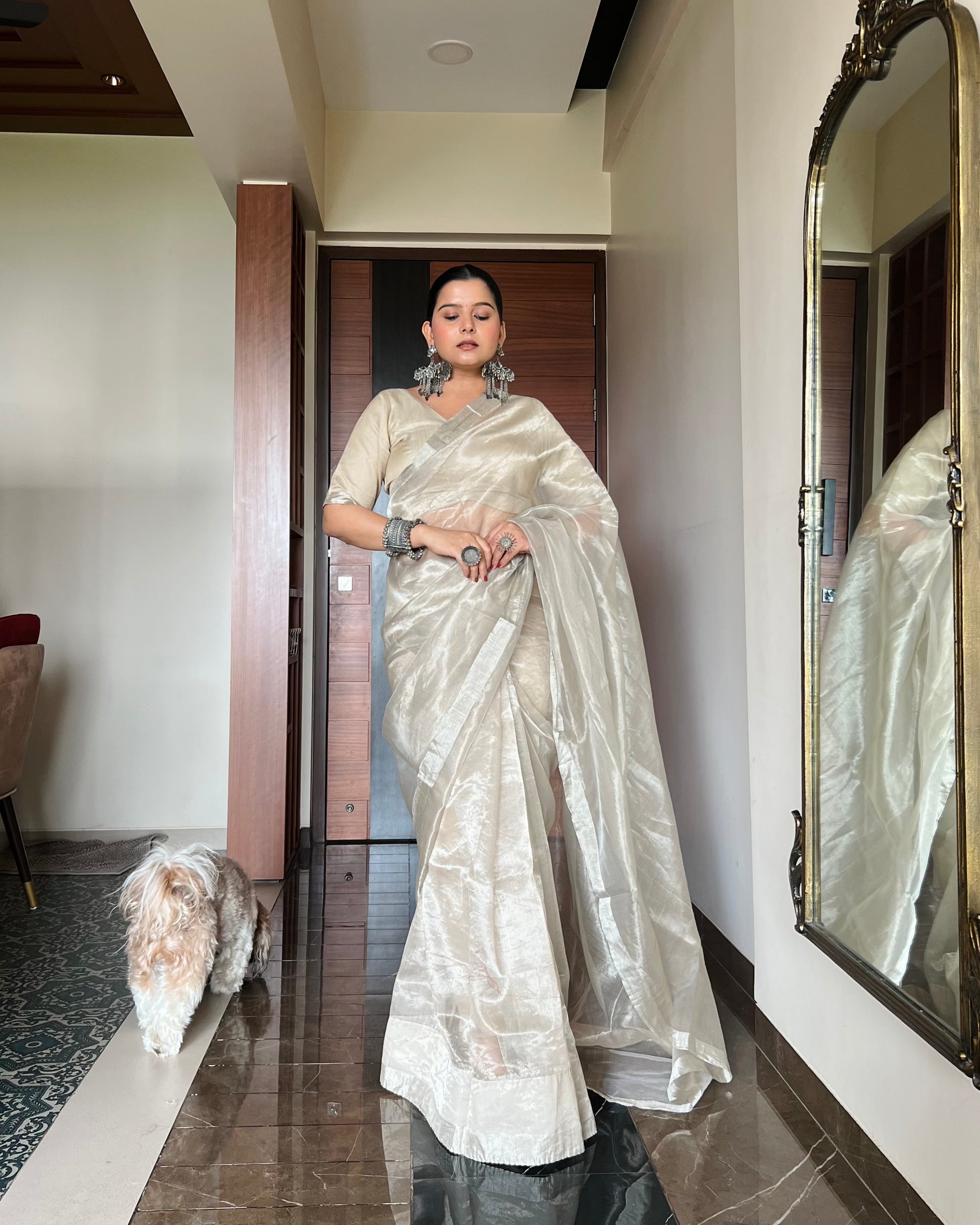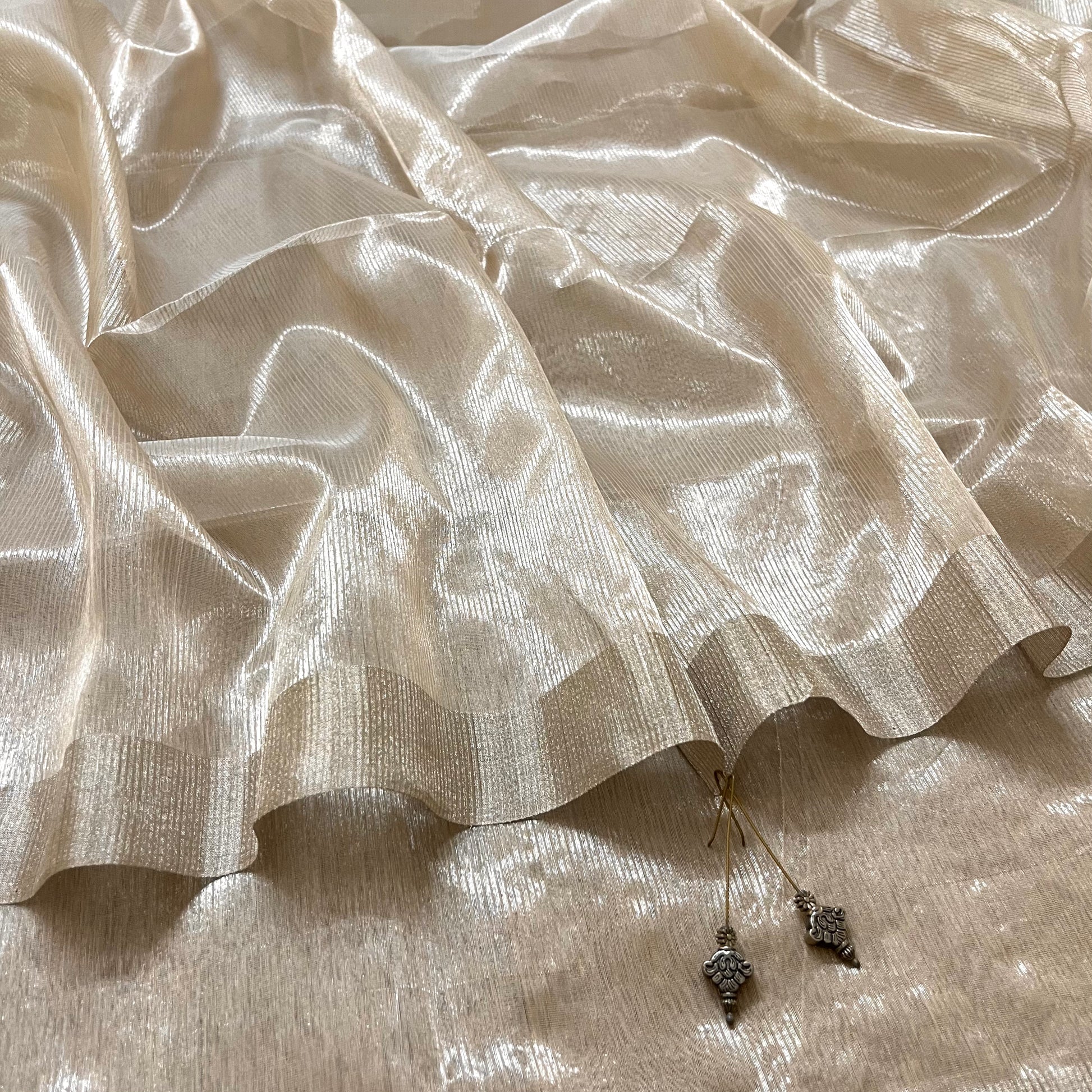 The saree has Zari border with Zari lines all over. It comes with a running blouse piece. Fabric of the saree is Maheshwari Cotton Silk