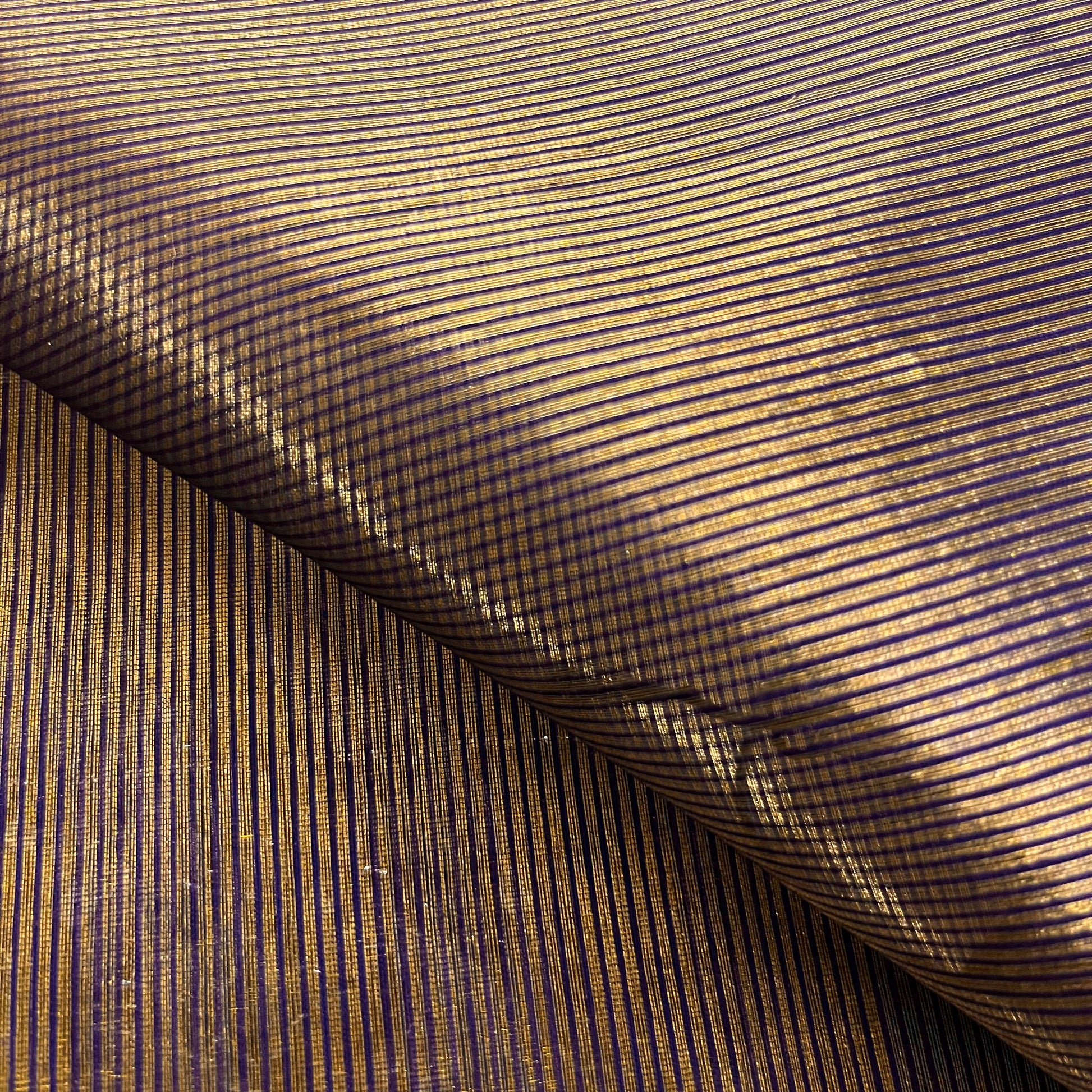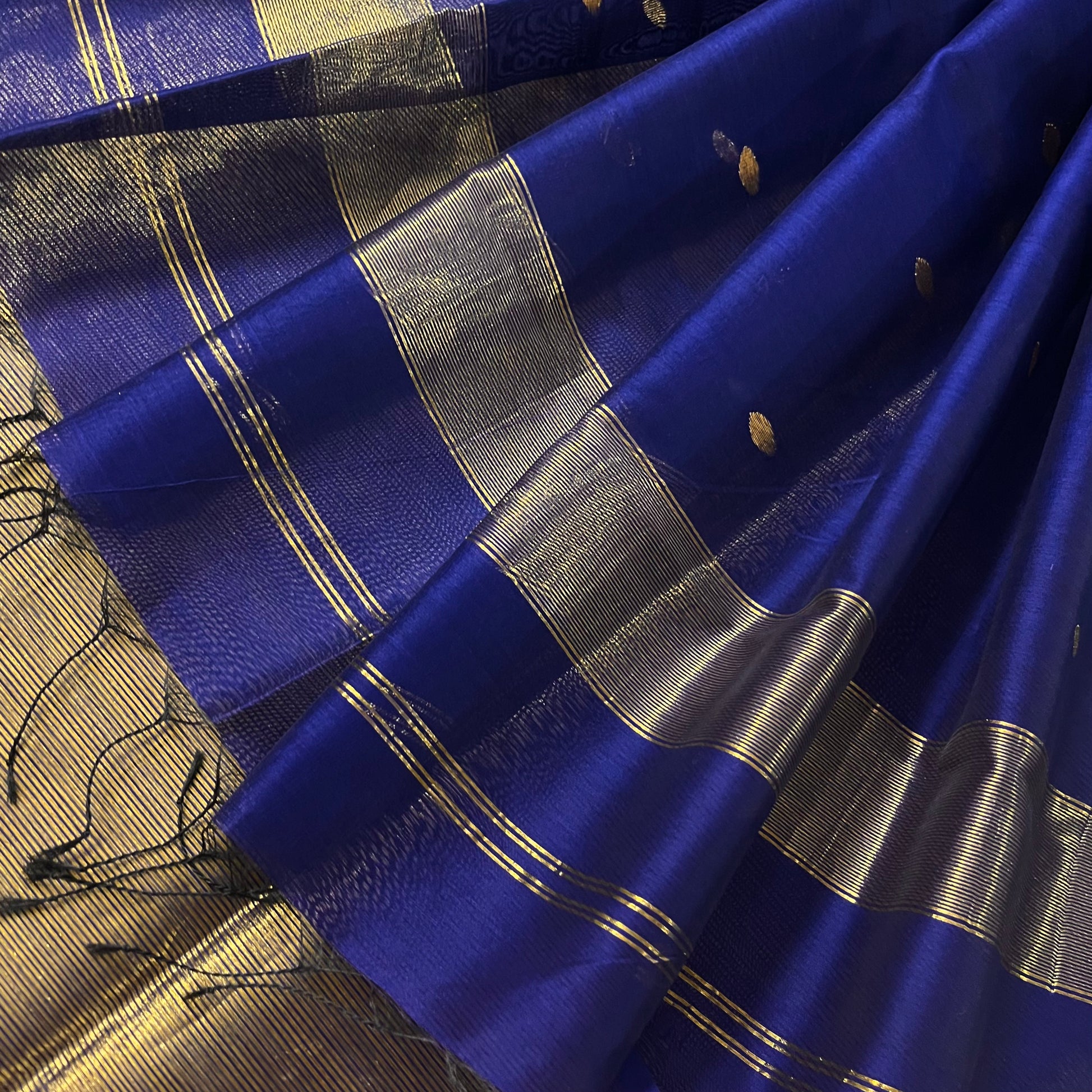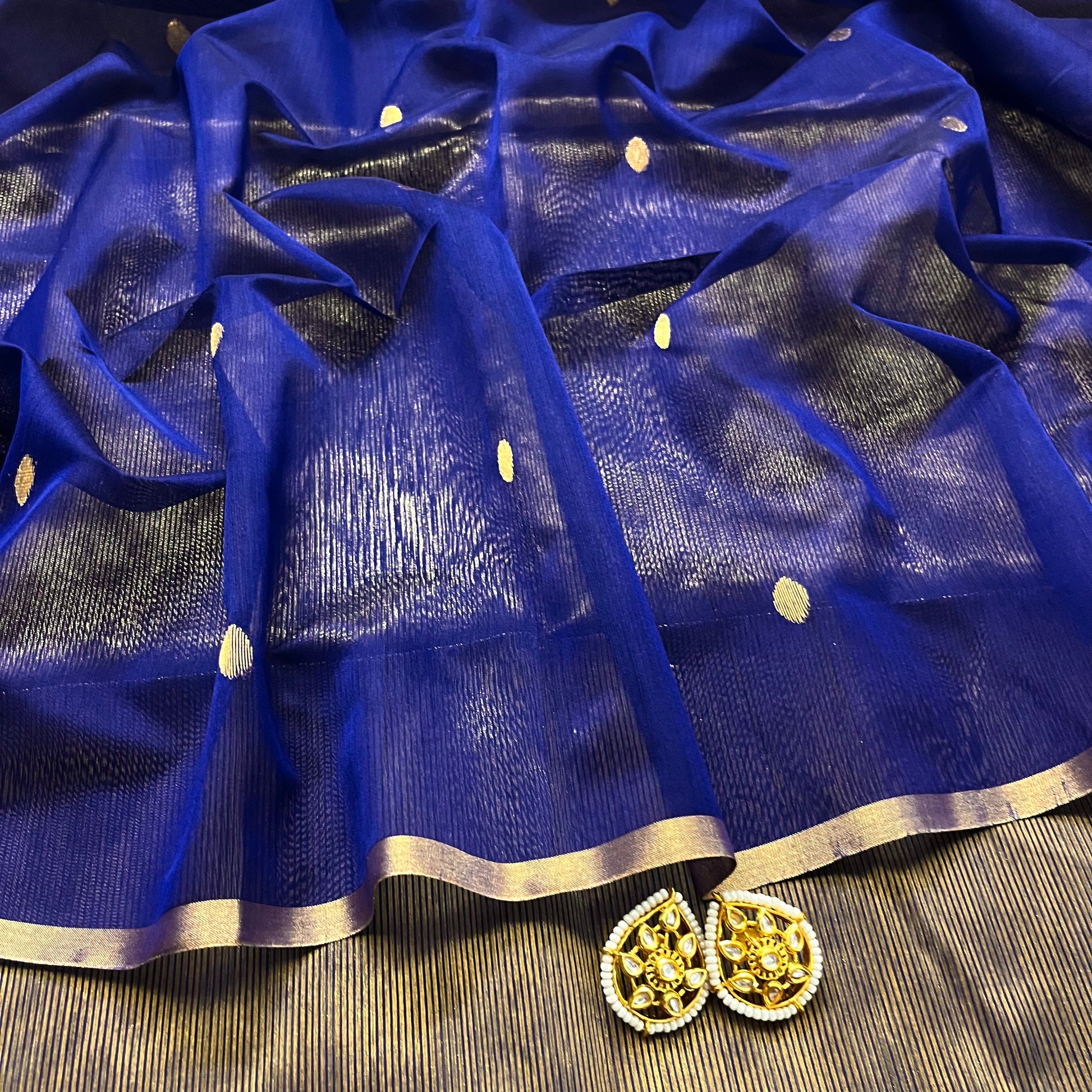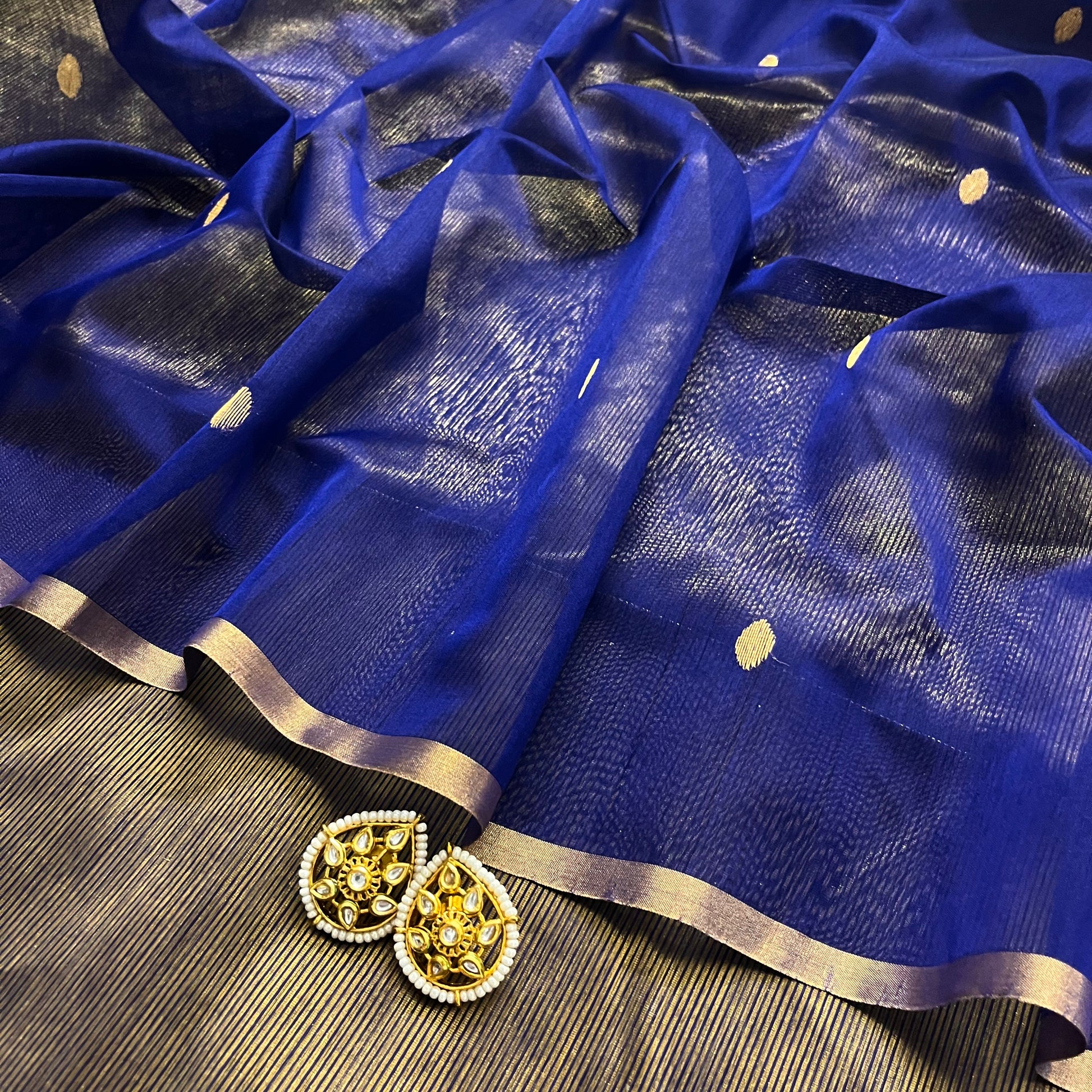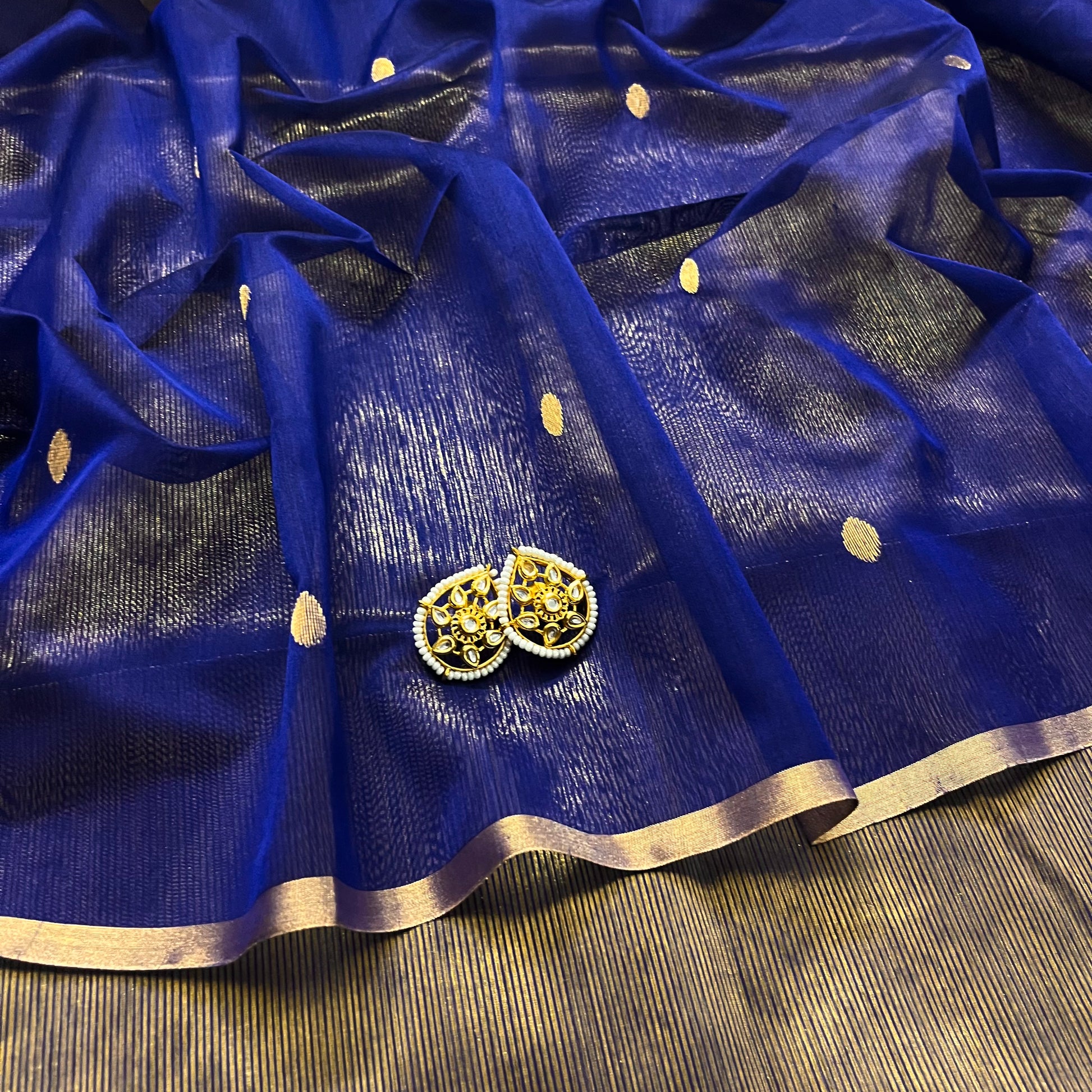 The saree has zari border with gold zari lines on the bottom half(pleats), and zari bootis on top half(chest and pallu) of the saree.It comes with a running blouse piece with zari lines on it. Fabric of the saree is maheshwari cotton silk
