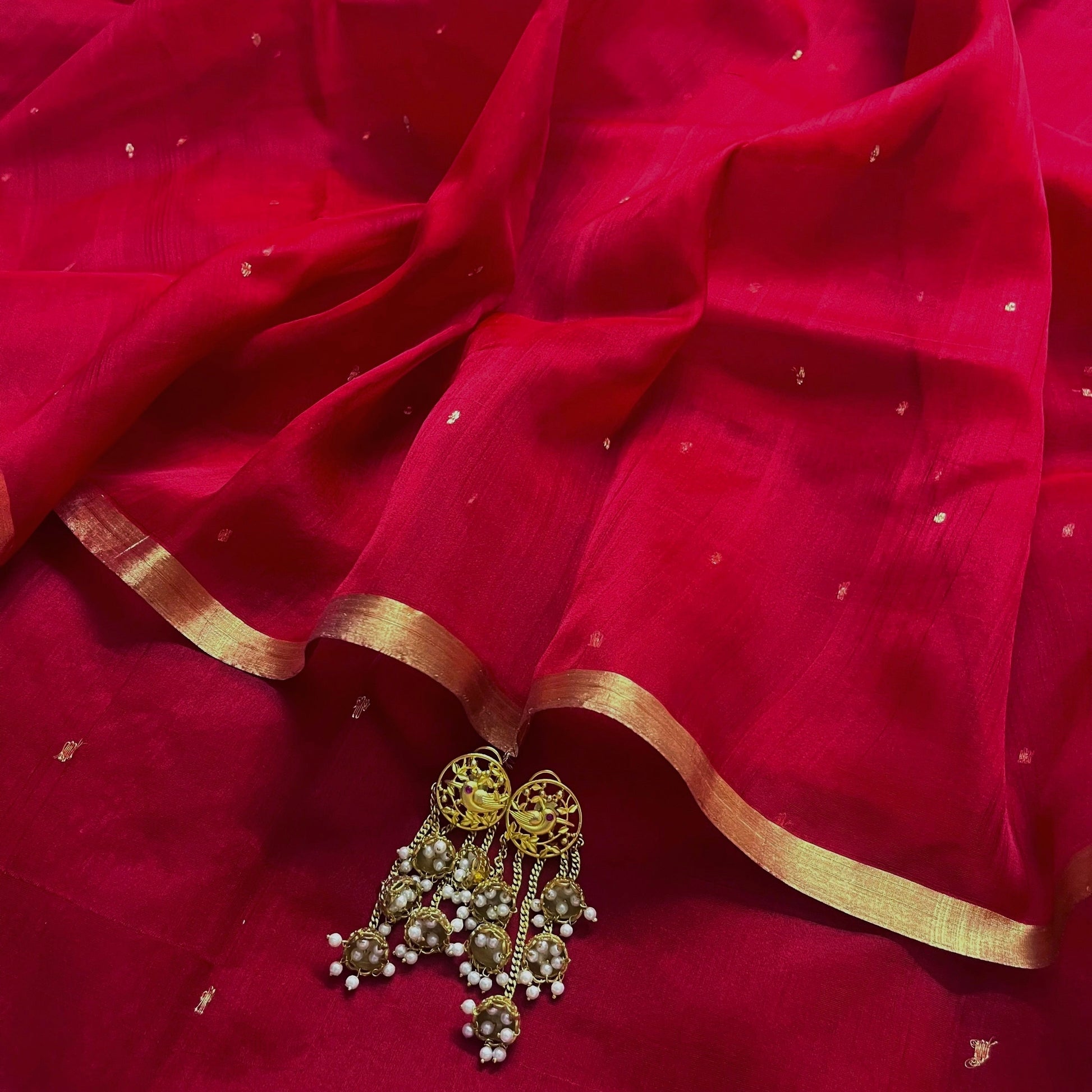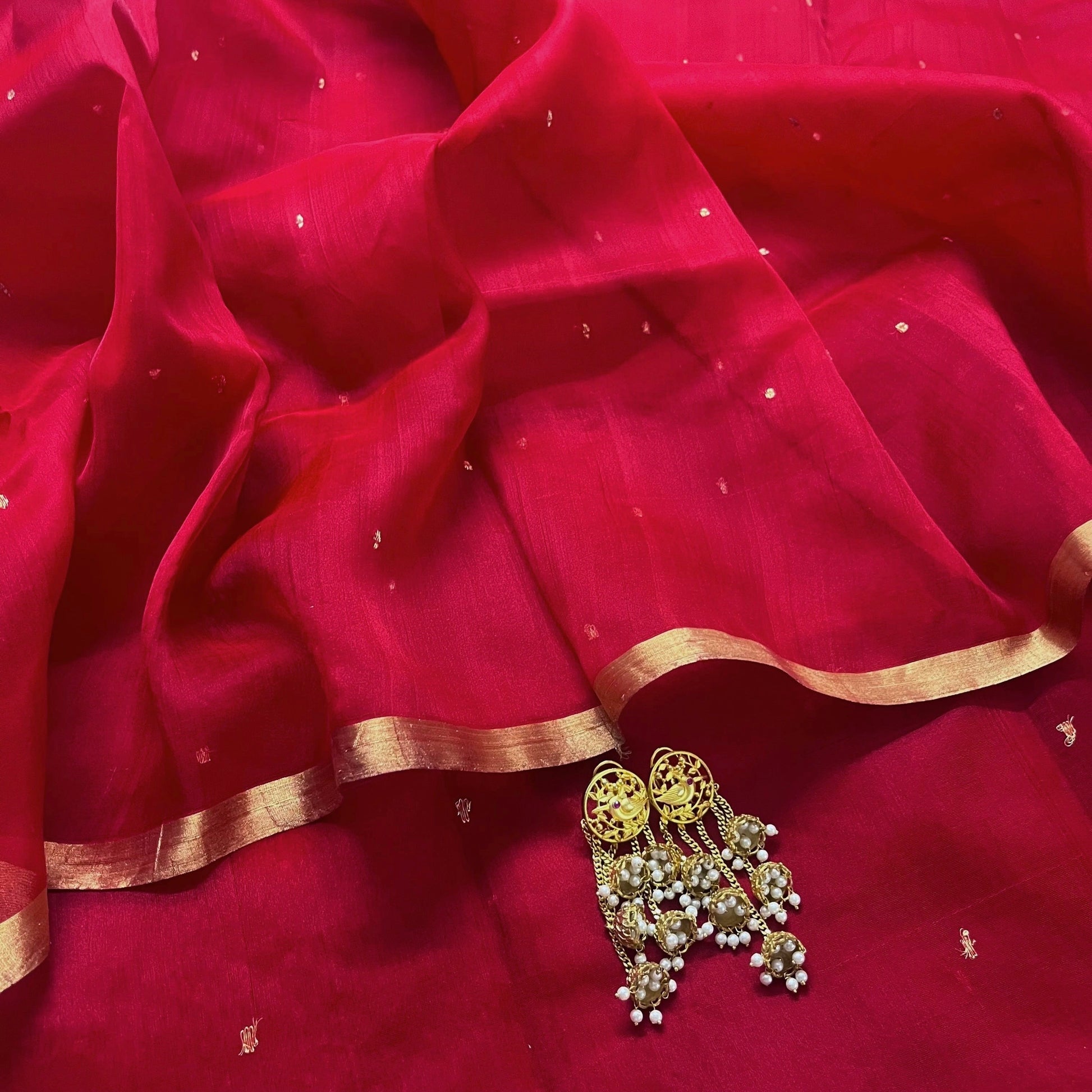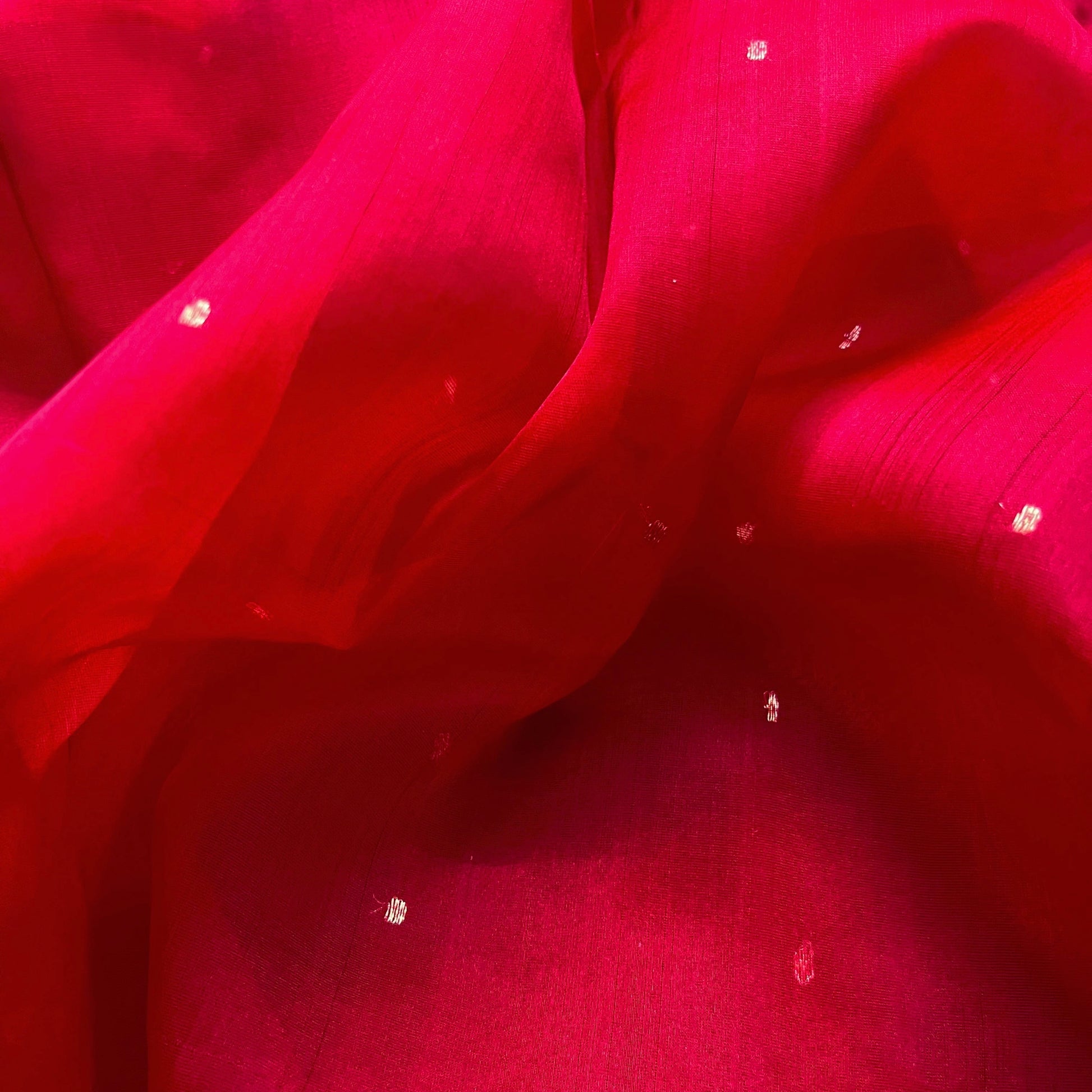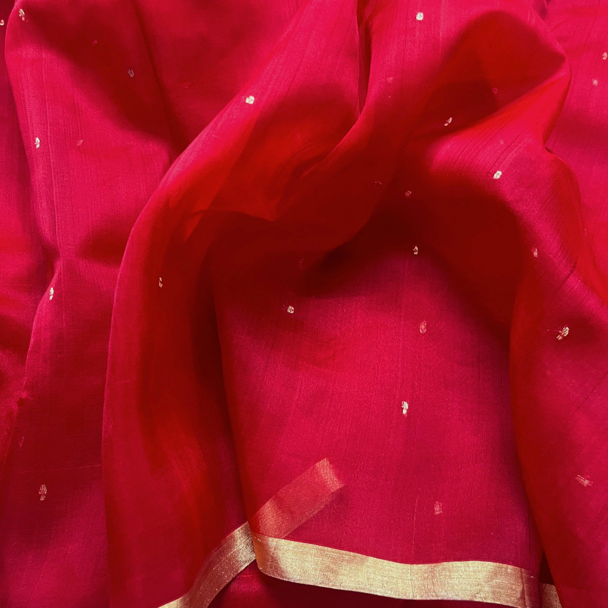 Deep red chanderi organza silk saree with zari bootis all over