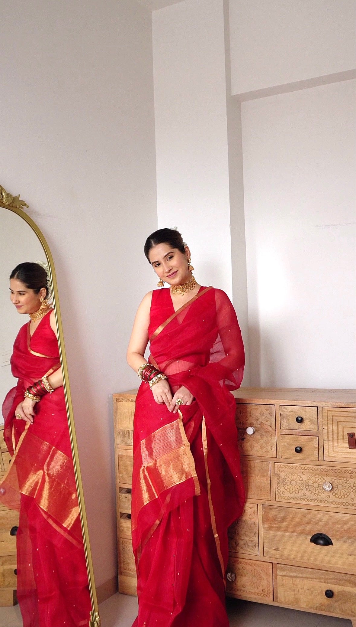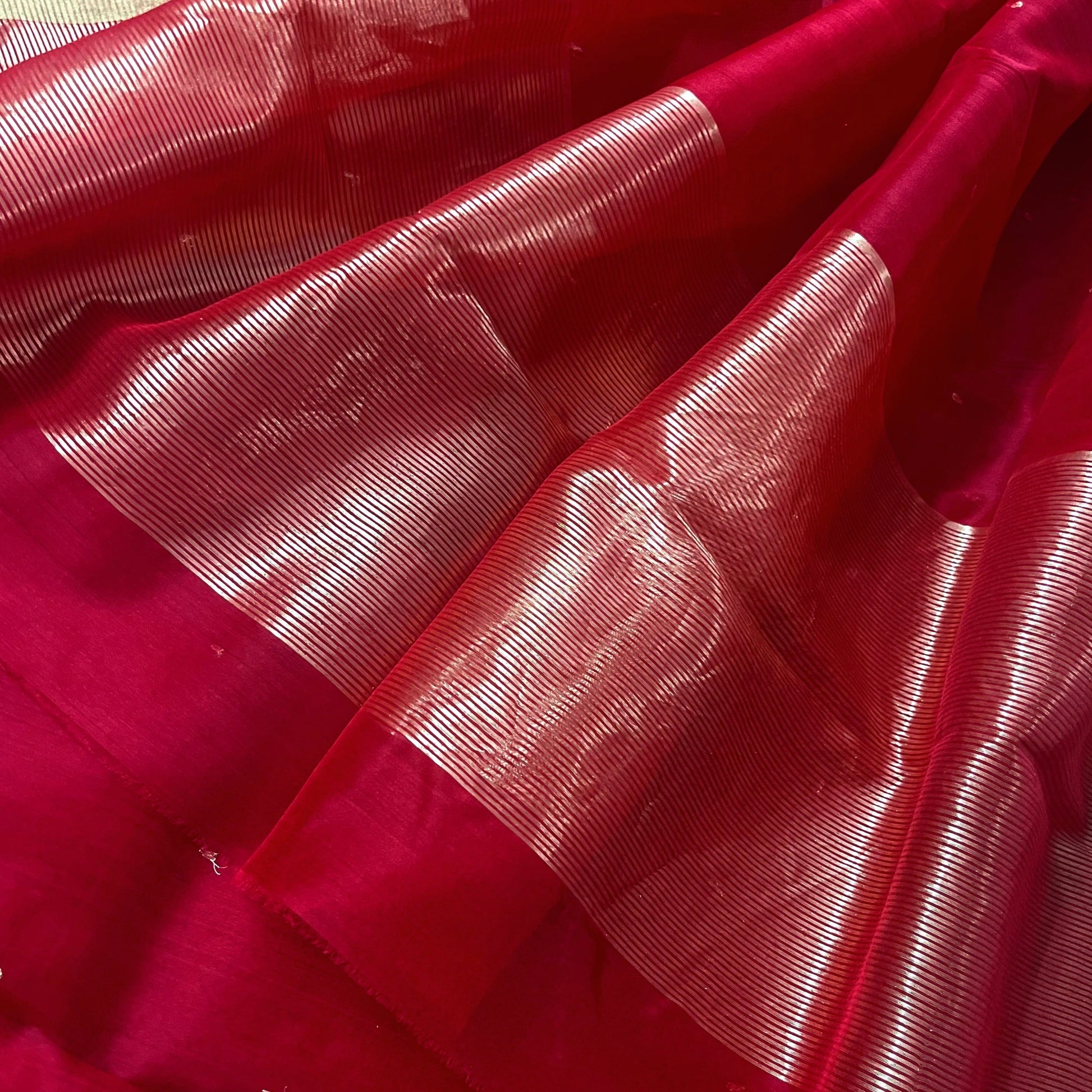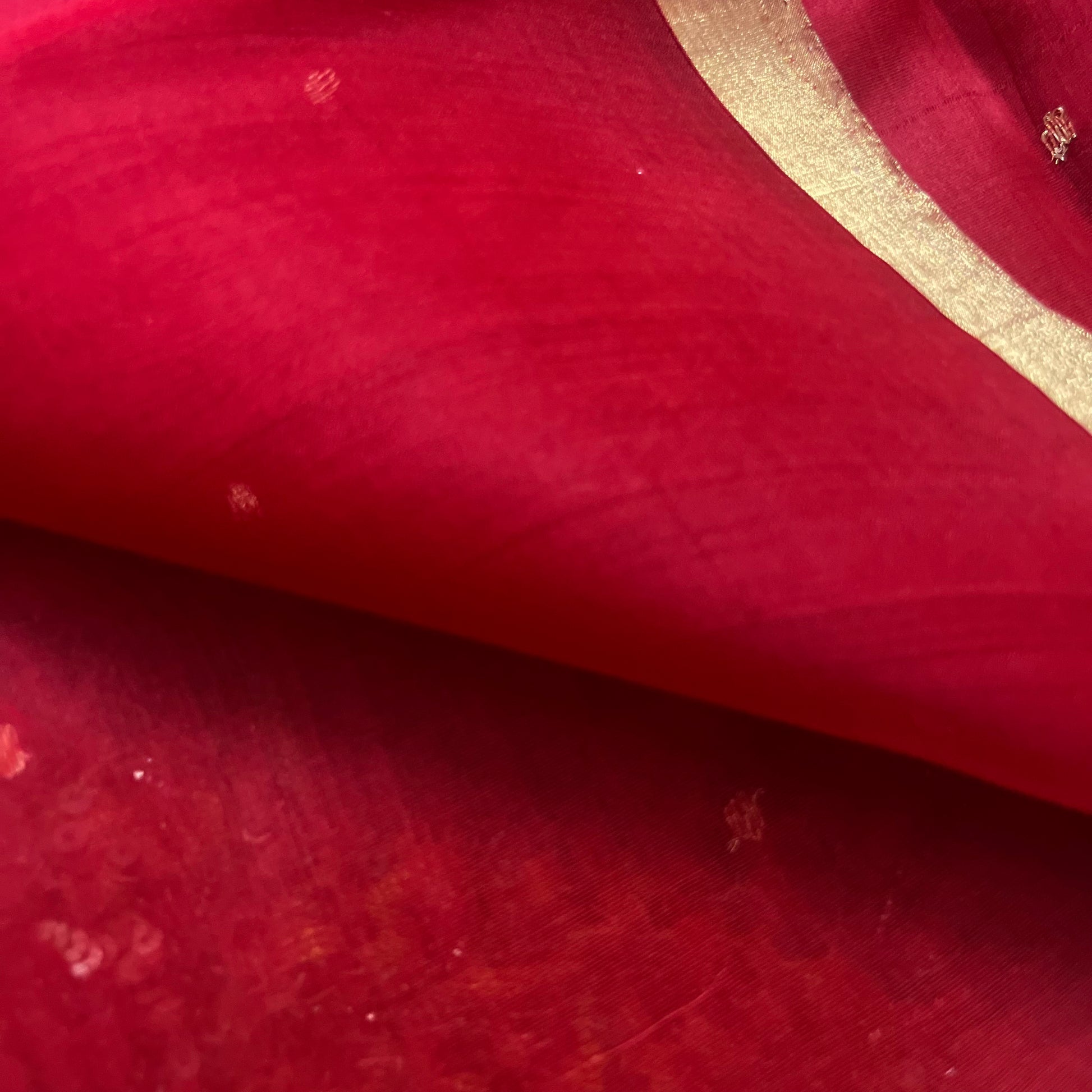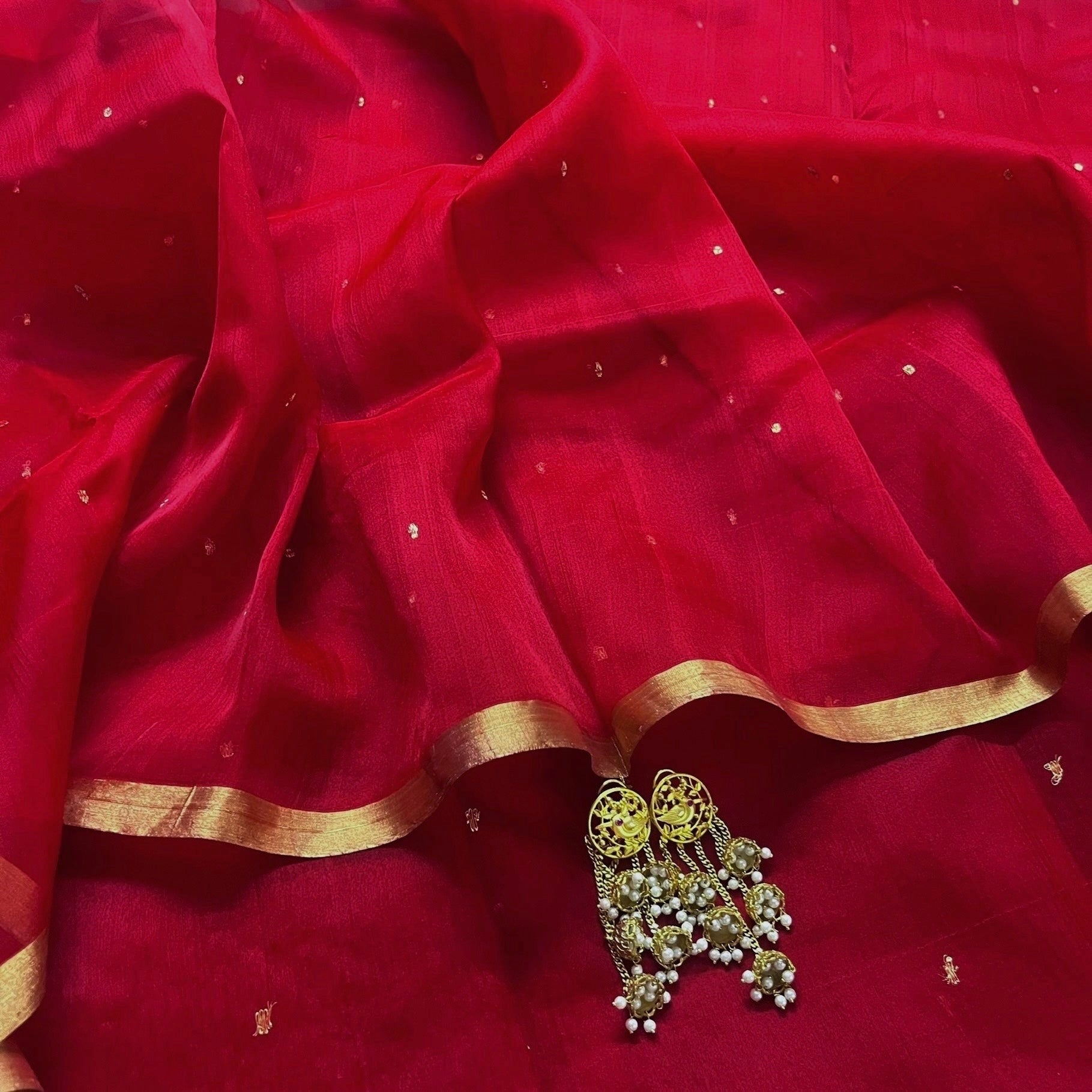 Deep red chanderi organza silk saree with zari bootis all over