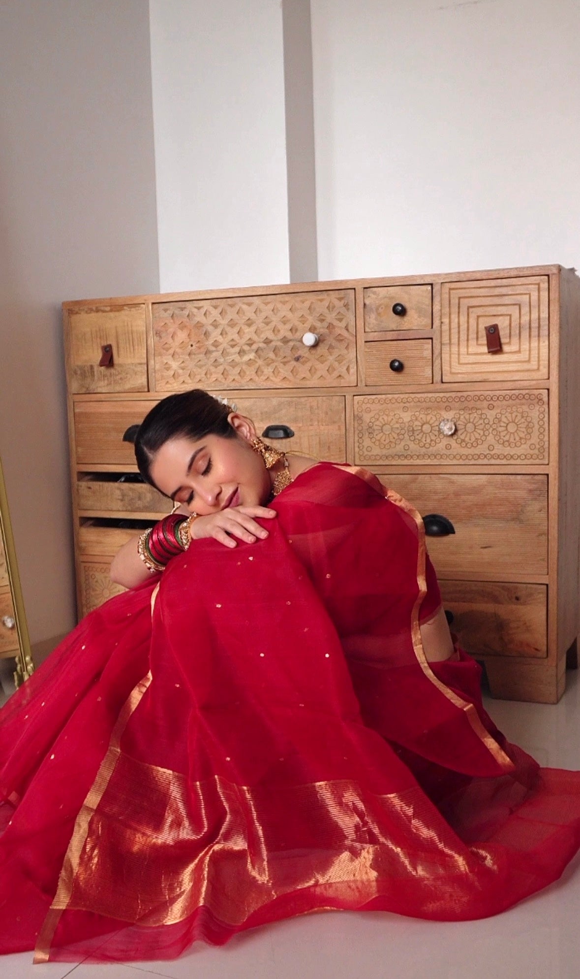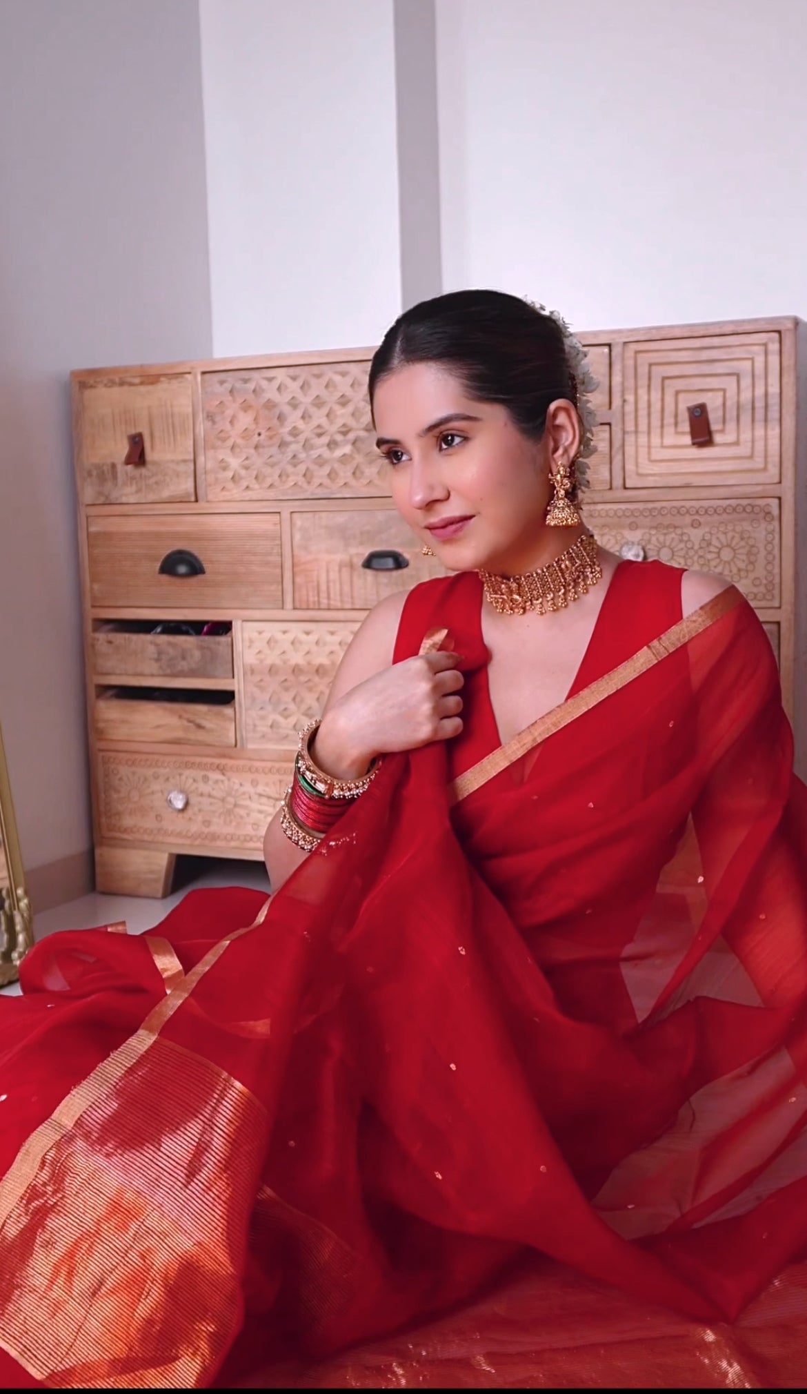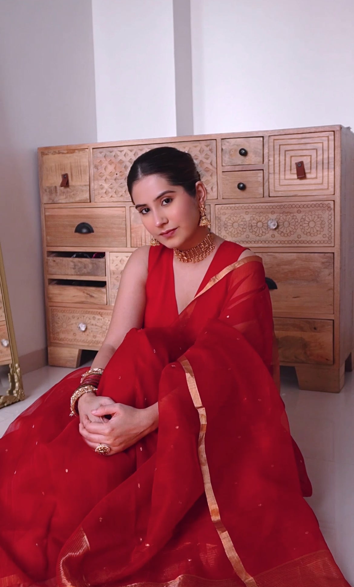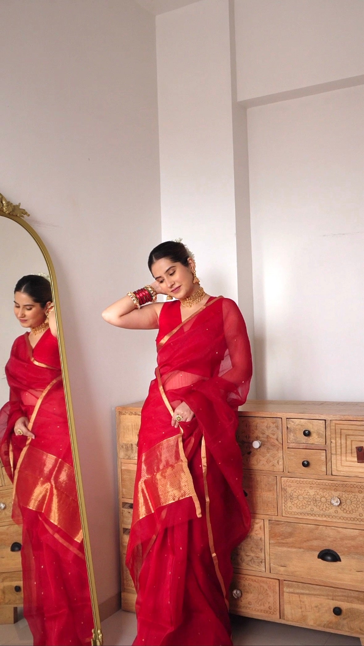 Deep red chanderi organza silk saree with zari bootis all over
