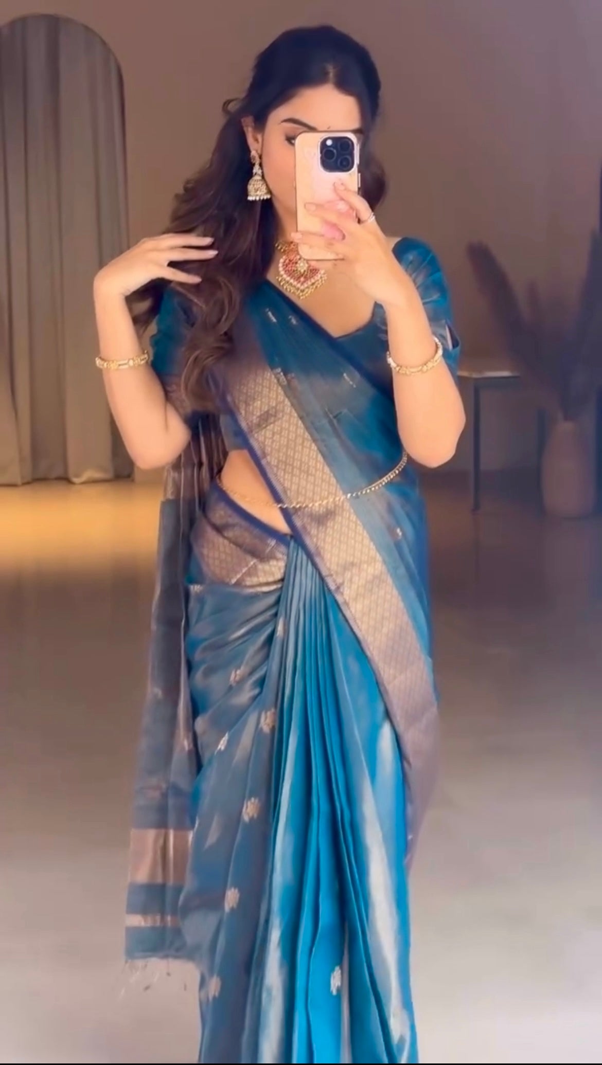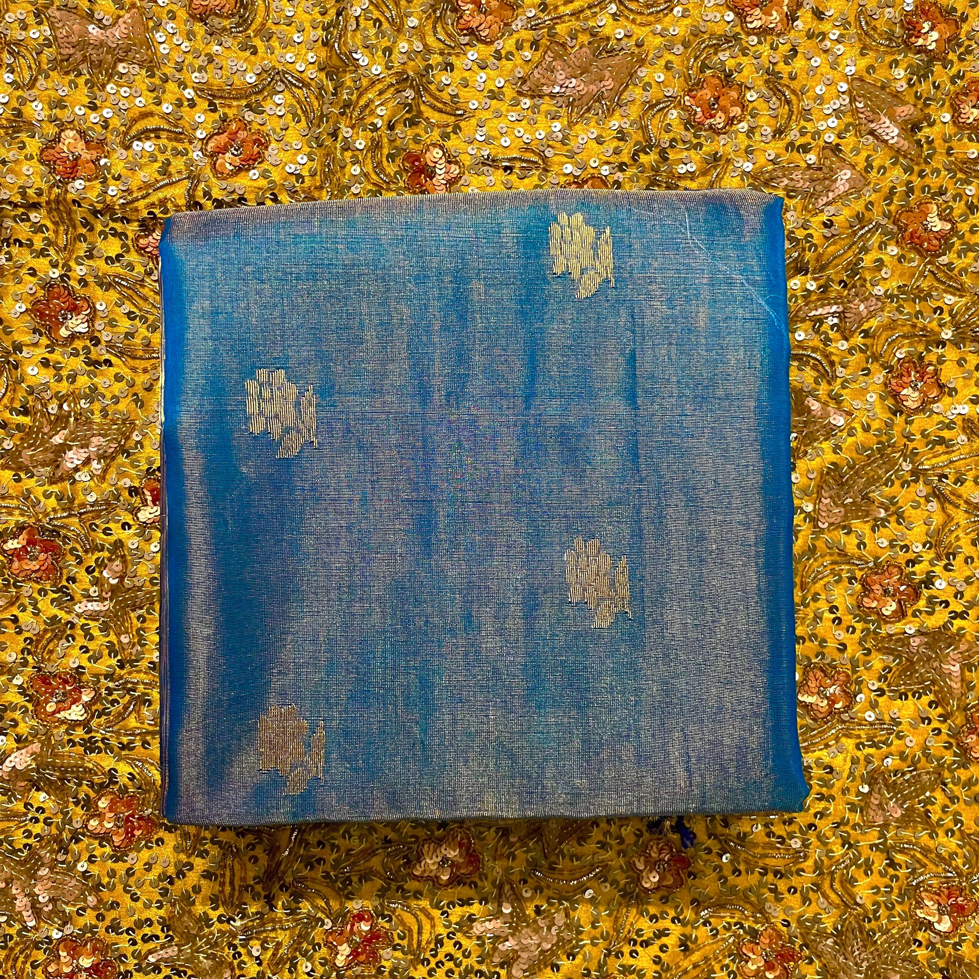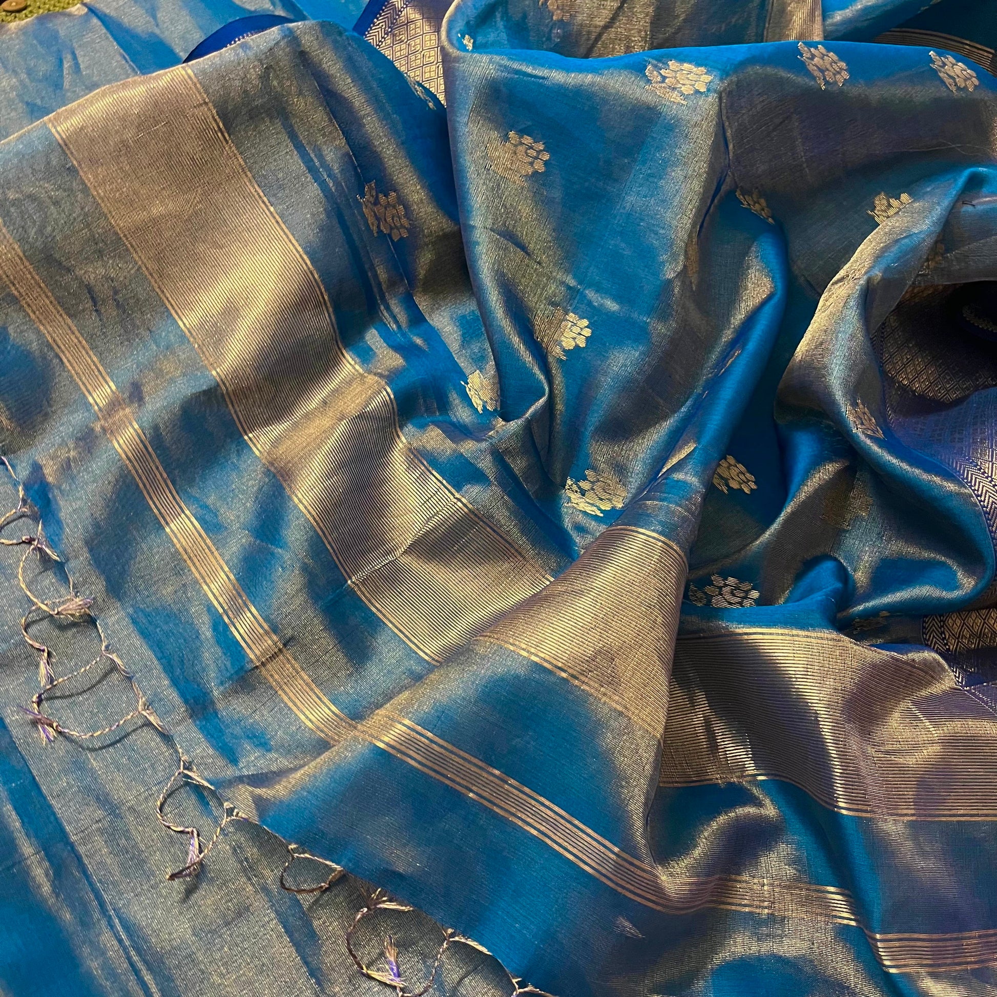 Peacock blue maheshwari tissue silk saree with flower motifs all over