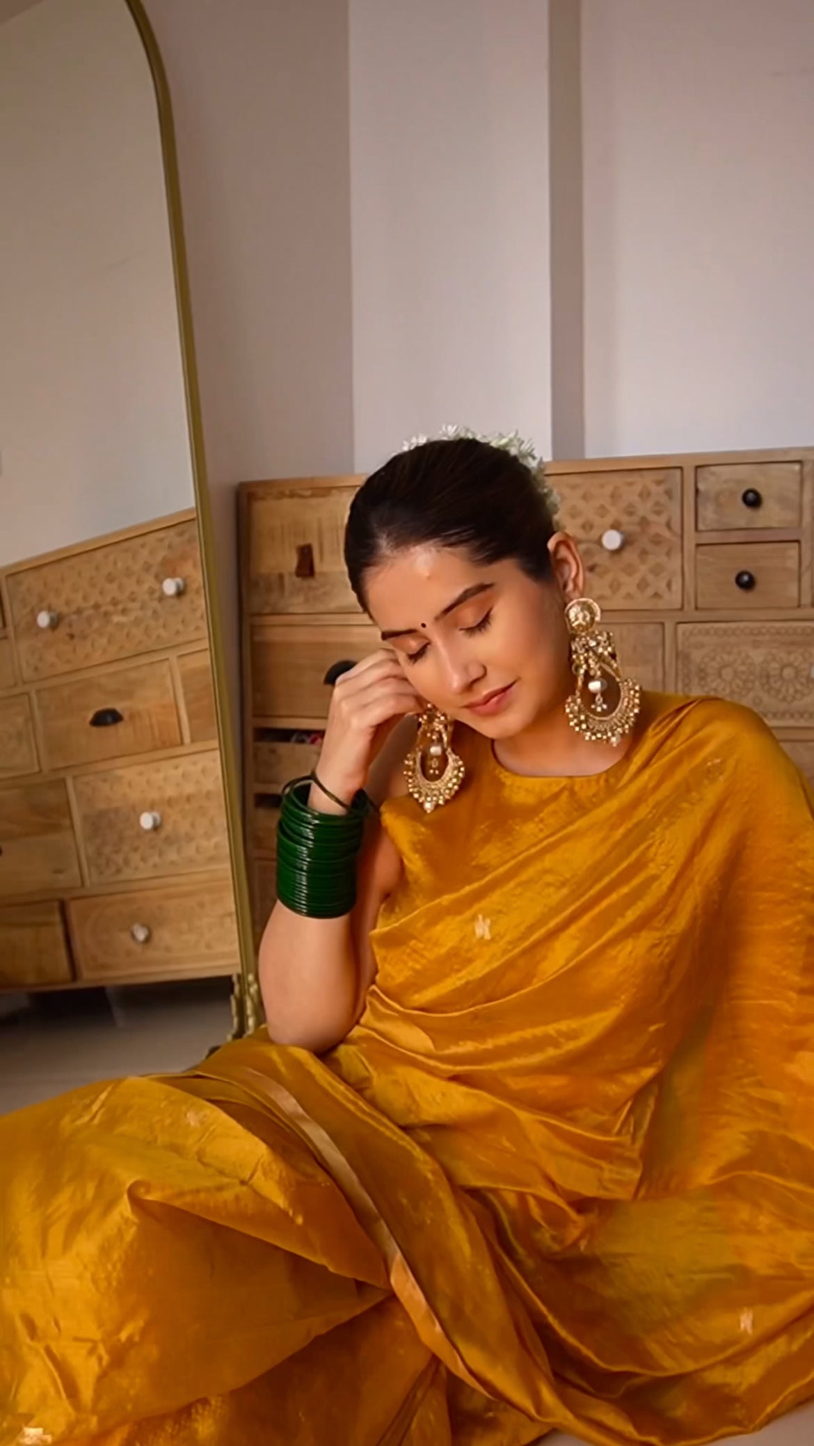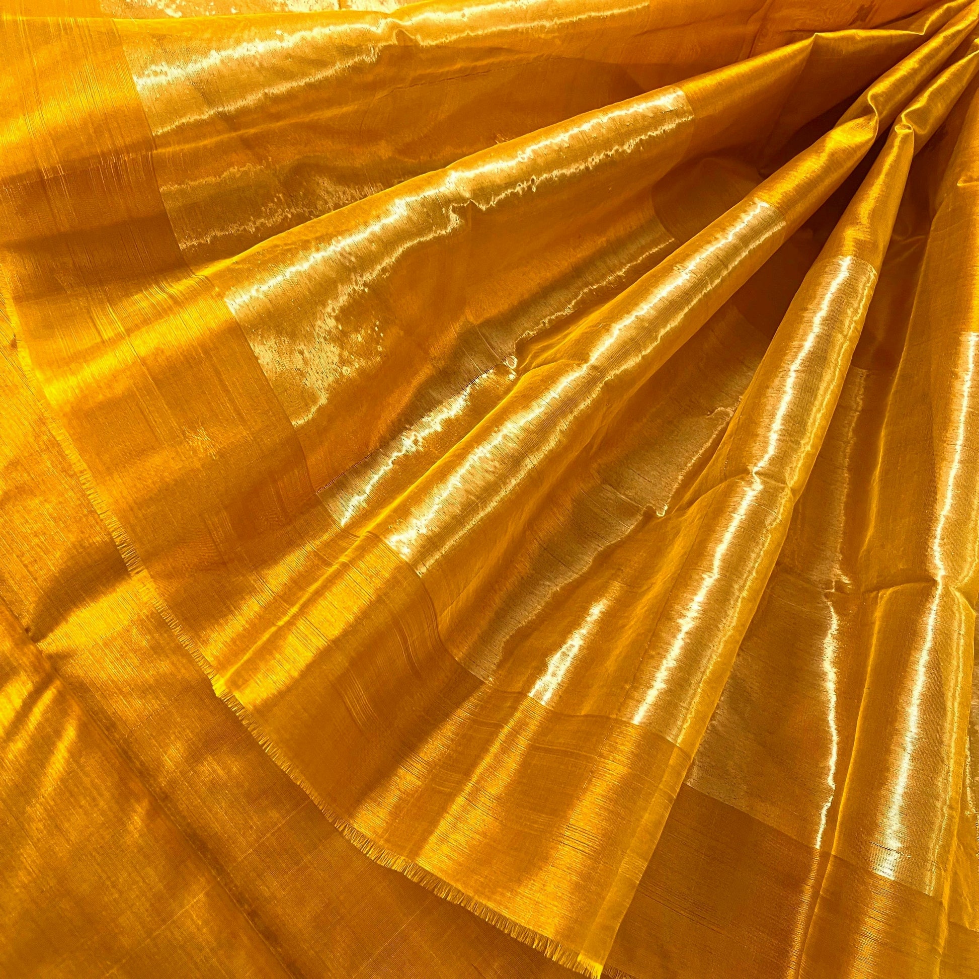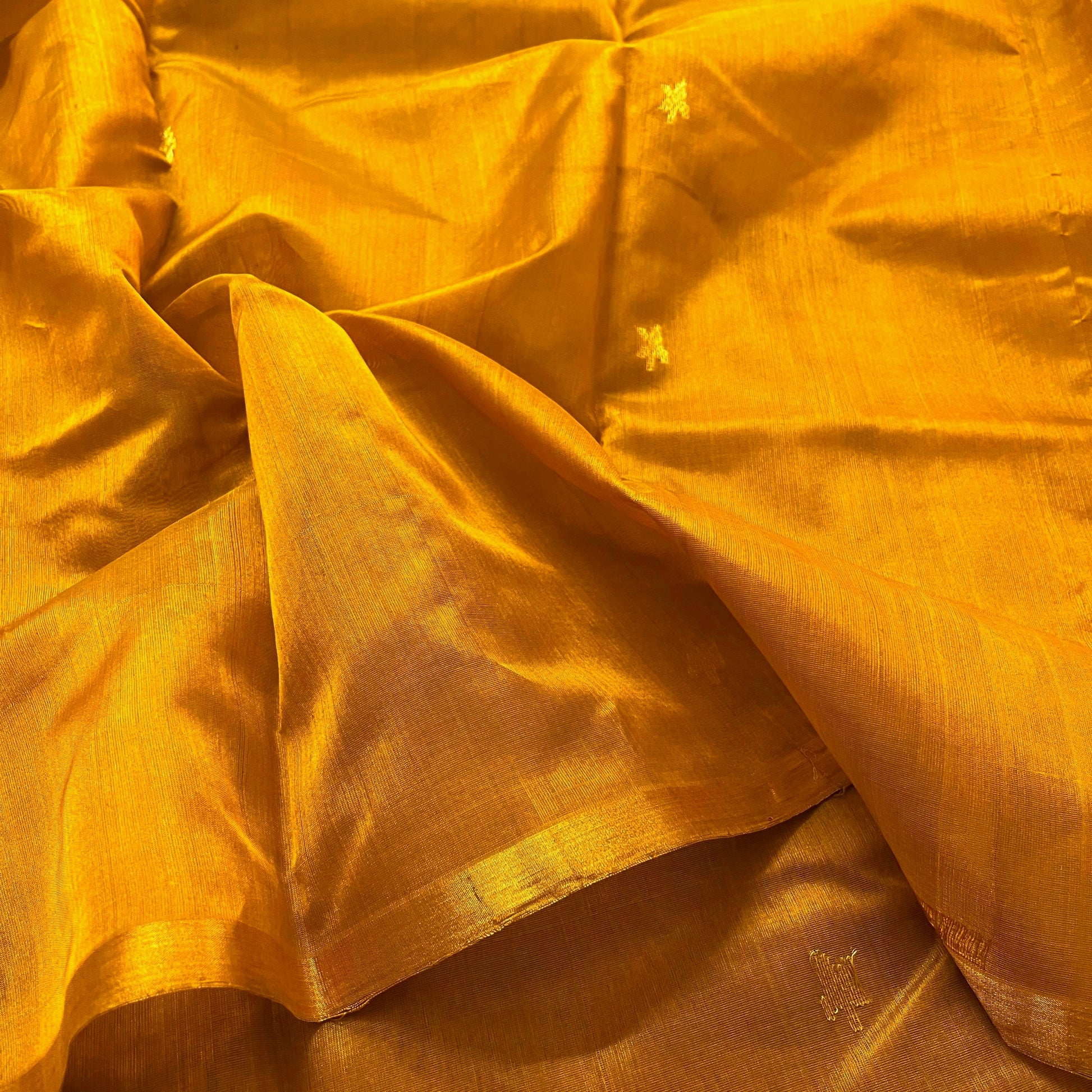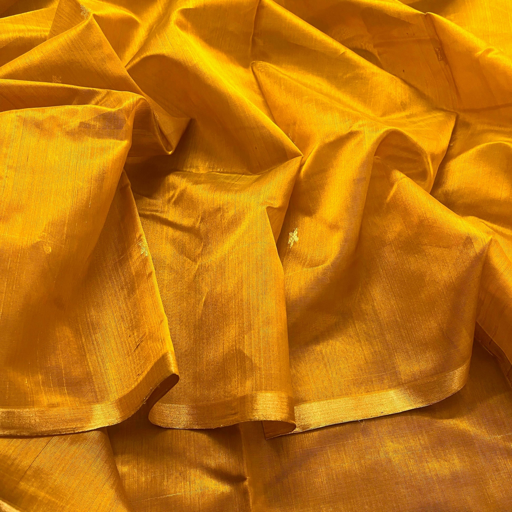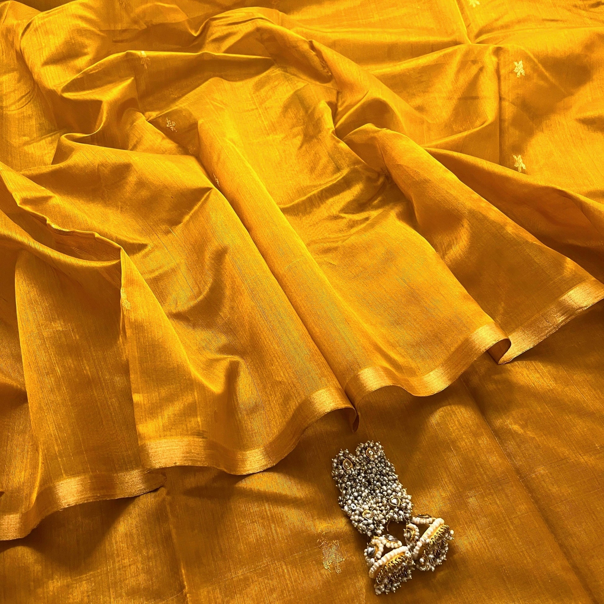 The saree has Zari border with flower bootis all over. It comes with a running blouse piece. Fabric of the saree is Chanderi pattu Silk