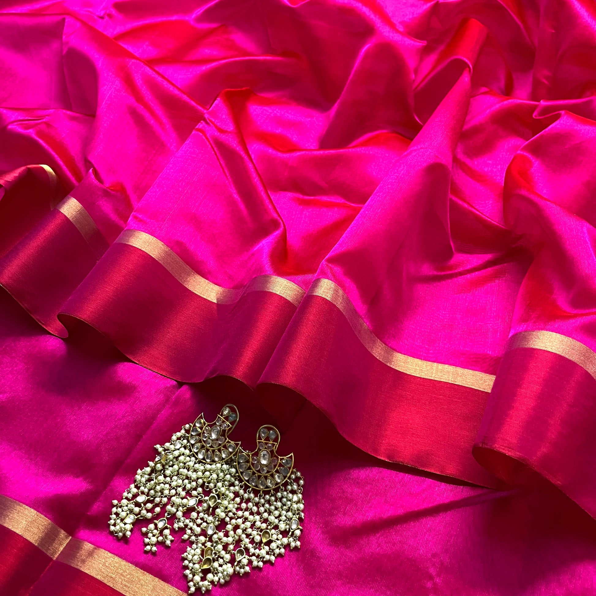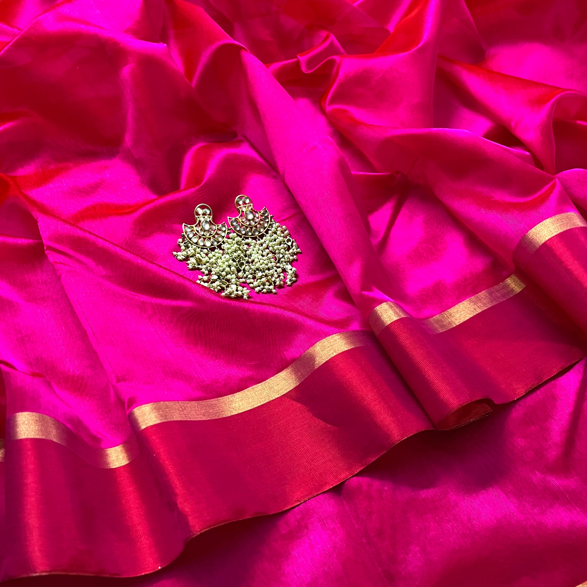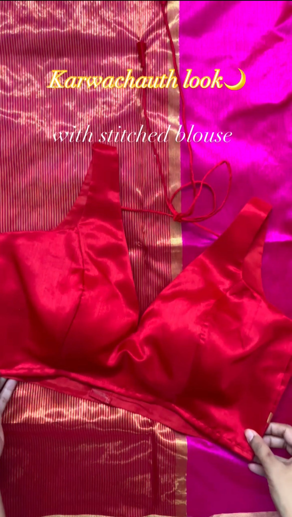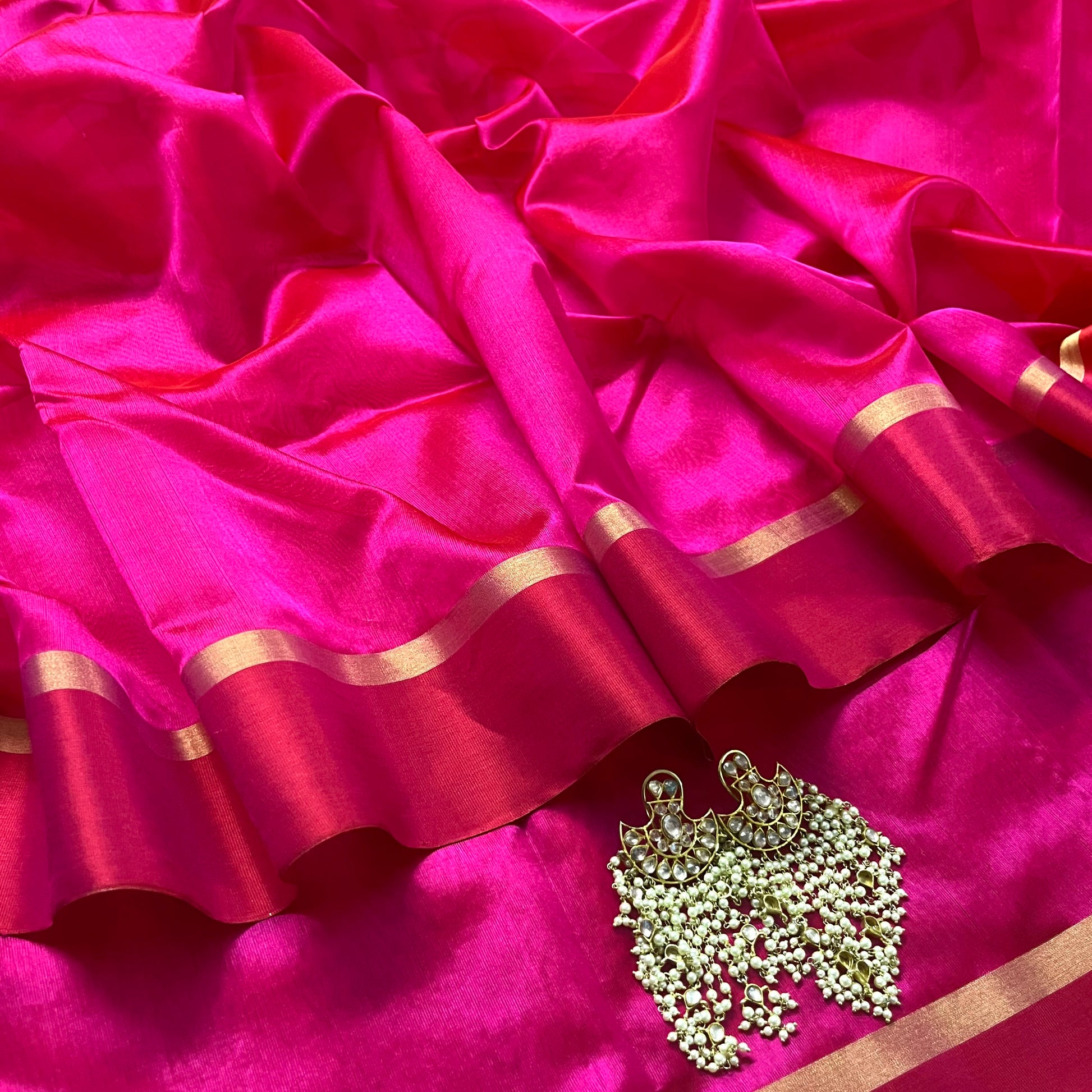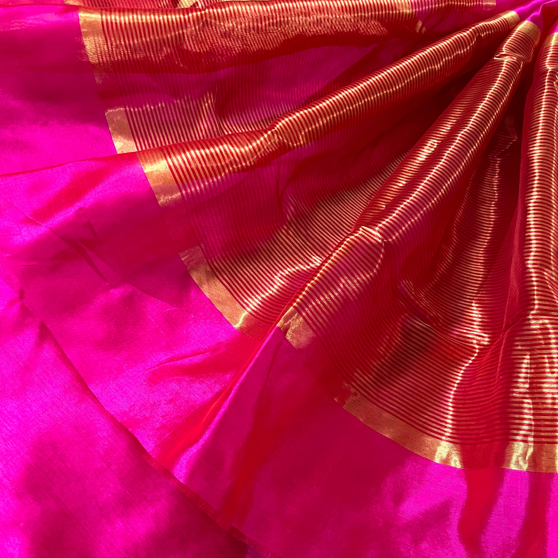 The saree has a silk border and zari lines on pallu. It comes with a contrast blouse piece in red. Fabric of the saree is chanderi pattu silk.