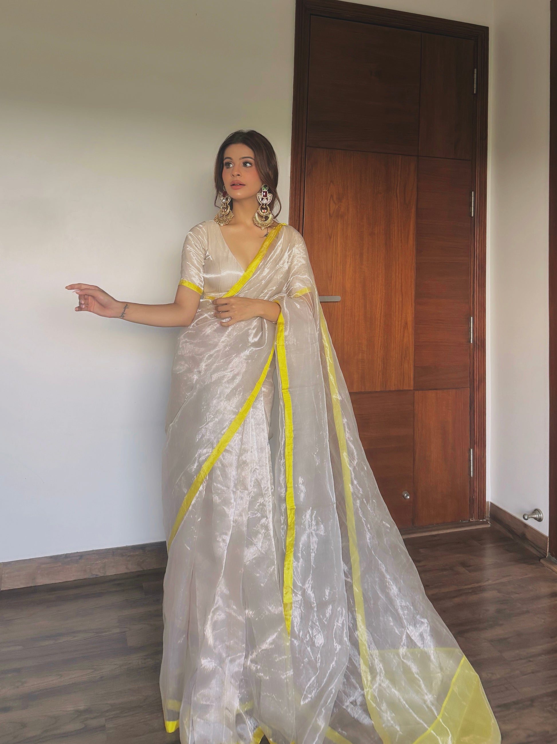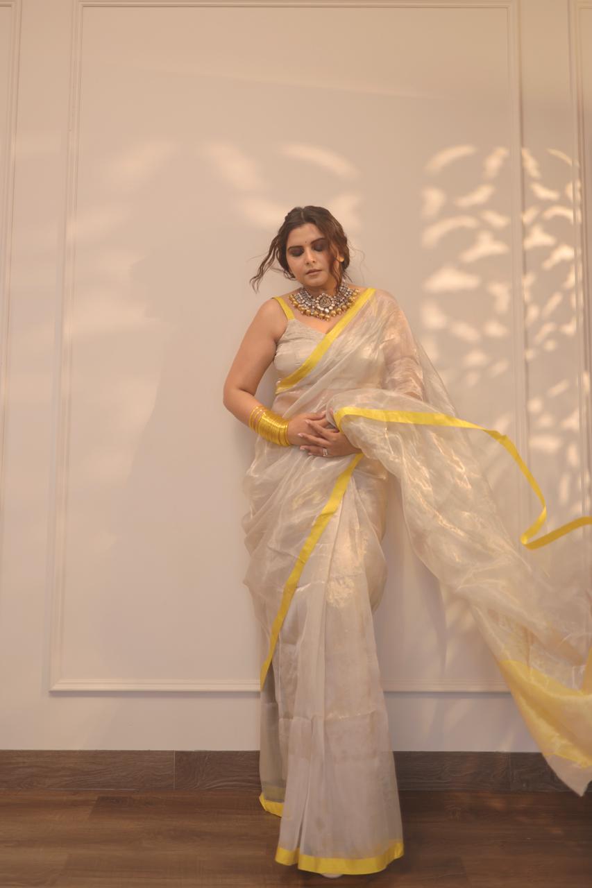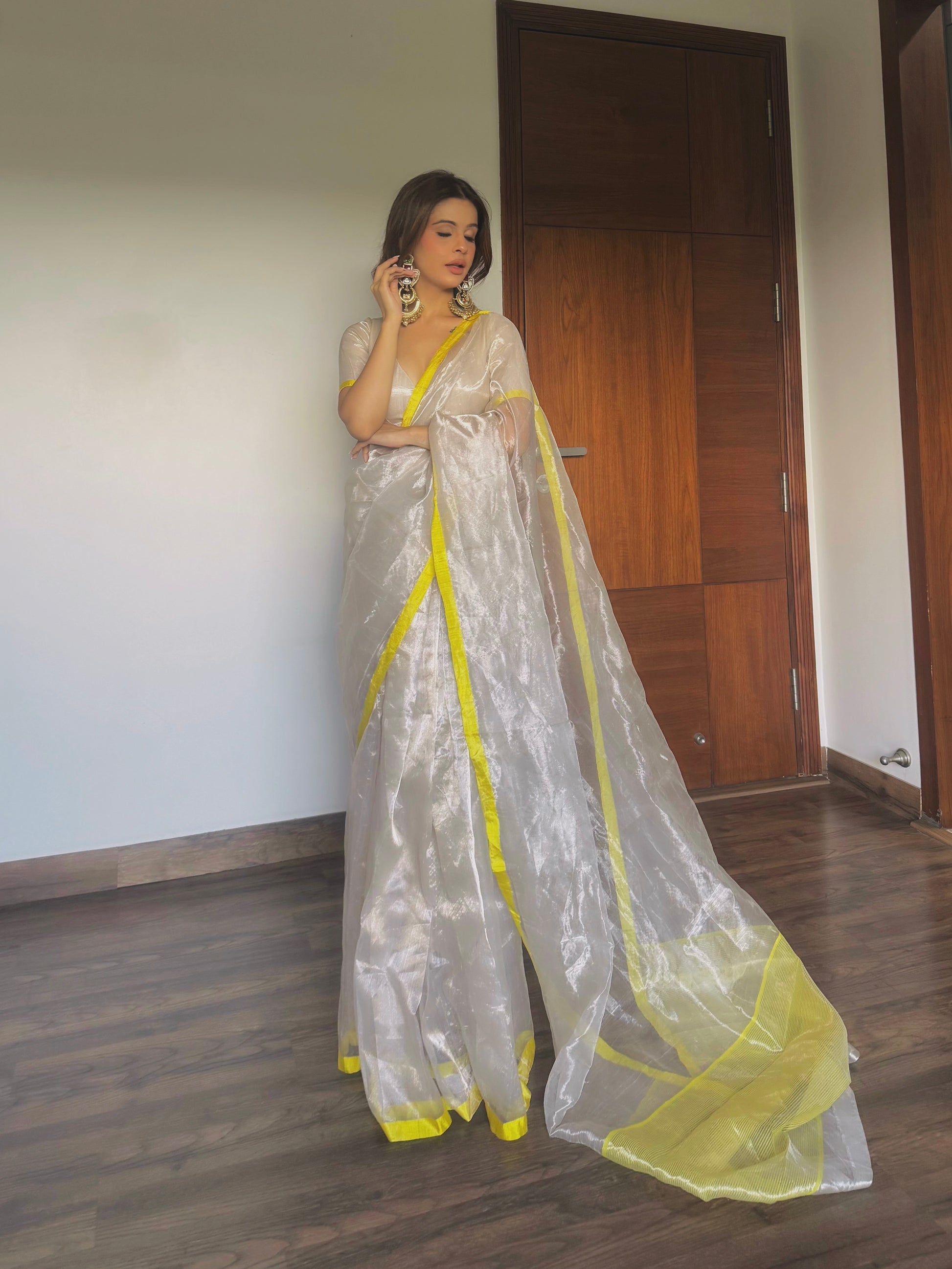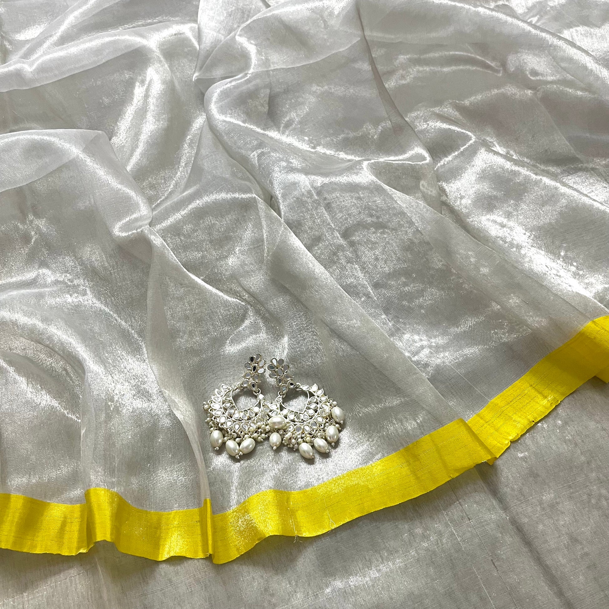 The saree has a lemon silk border and zari lines on pallu. It comes with a running blouse piece. Fabric of the saree is chanderi tissue silk
