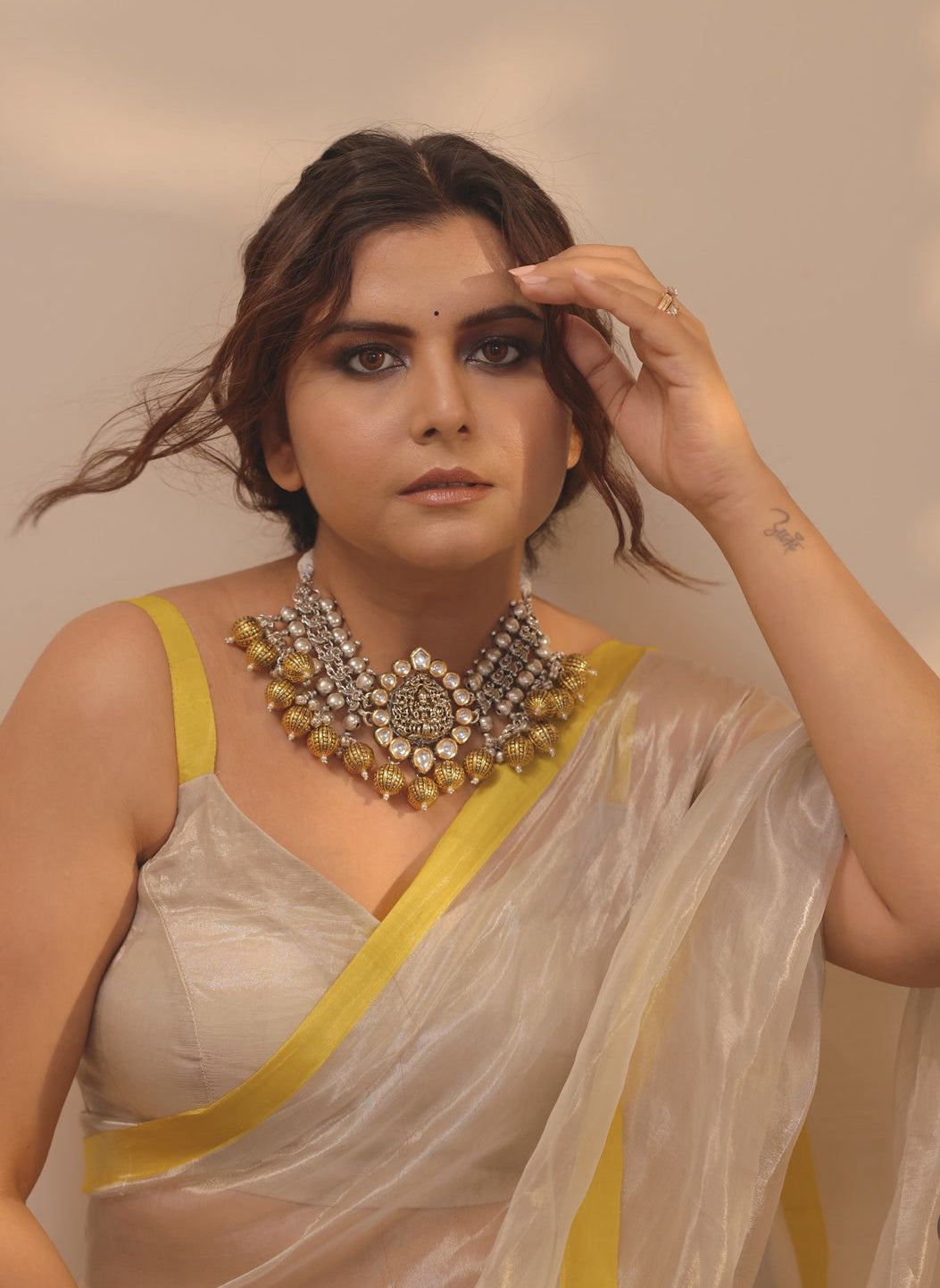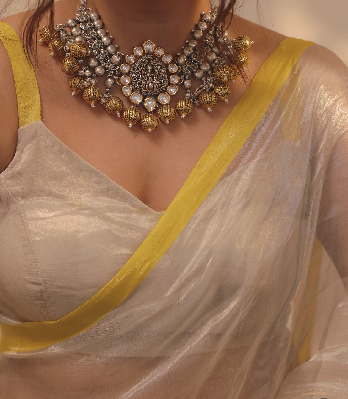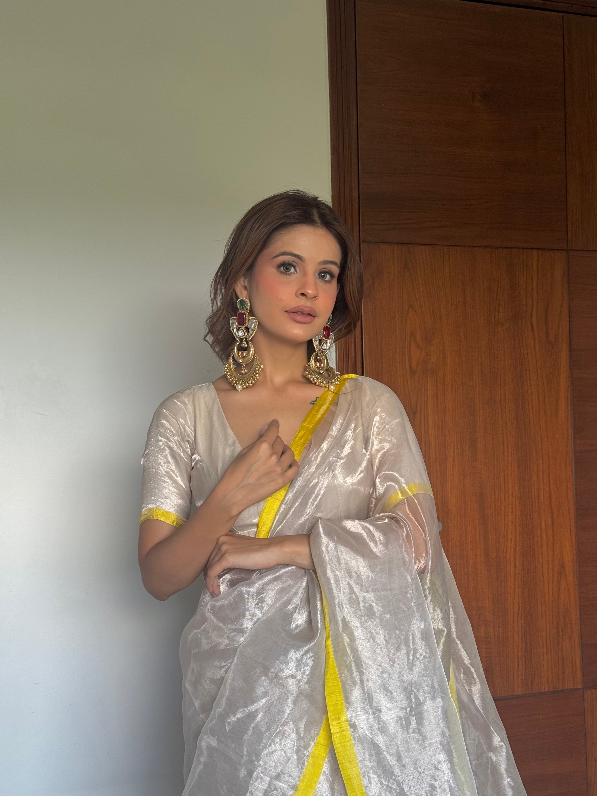 The saree has a lemon silk border and zari lines on pallu. It comes with a running blouse piece. Fabric of the saree is chanderi tissue silk