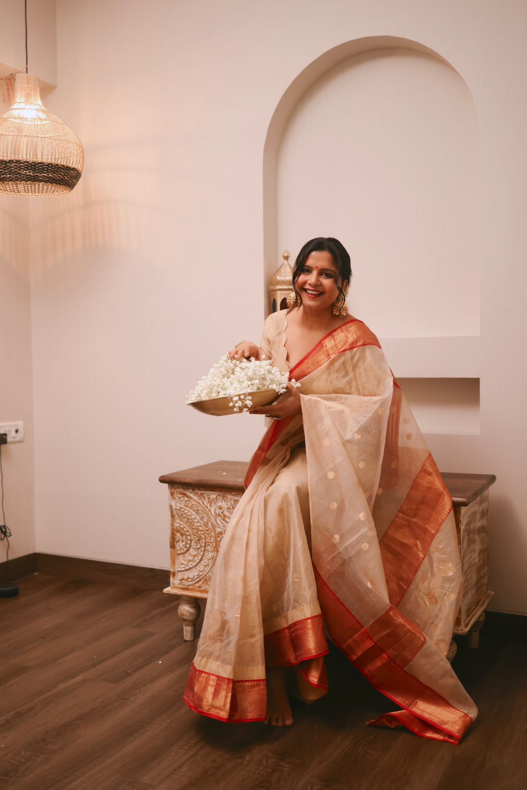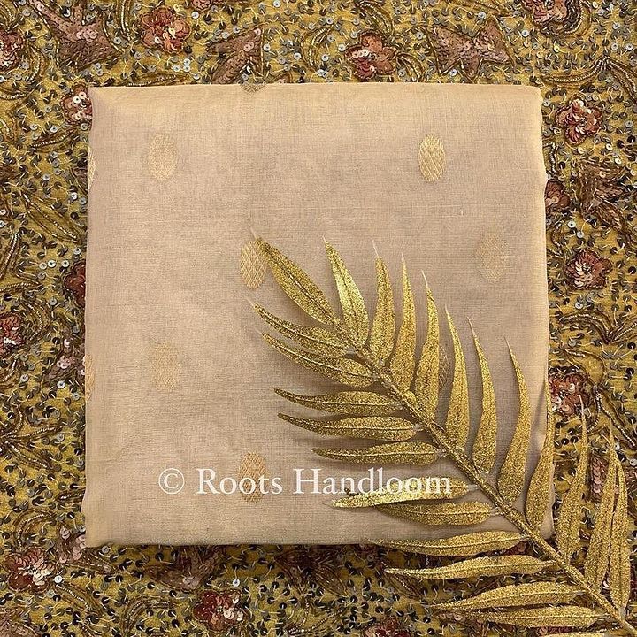 Gold Beige & Red Chanderi Silk Saree with Zari bootis all over