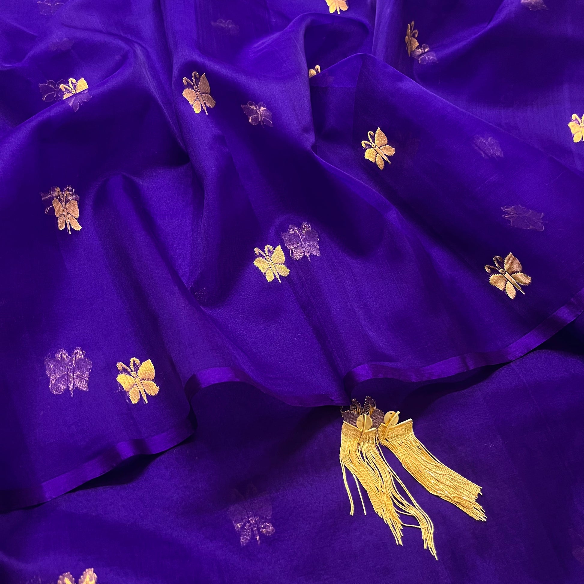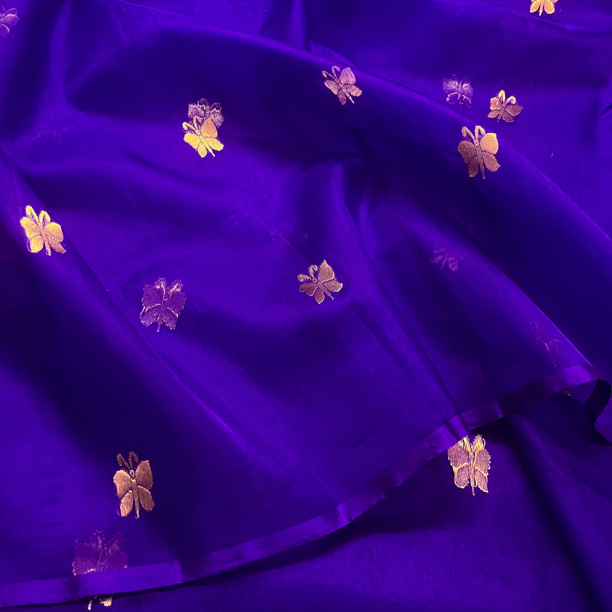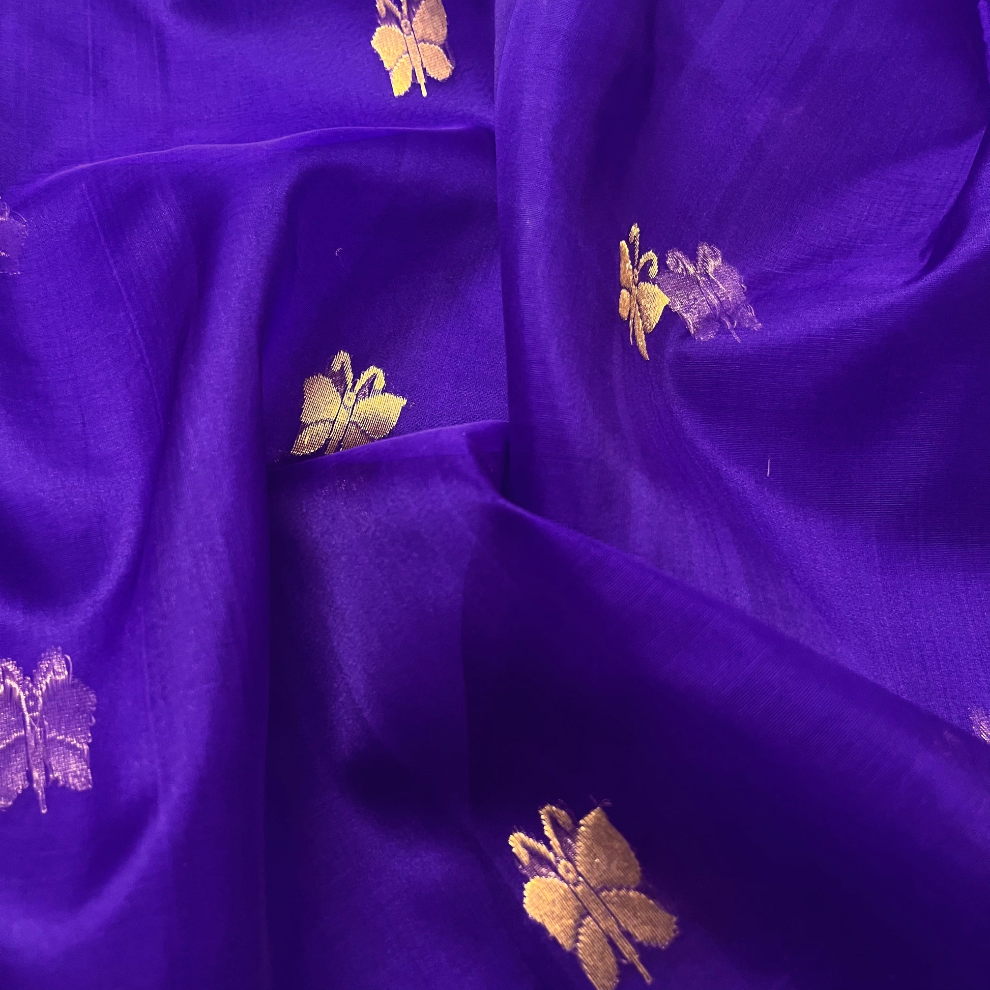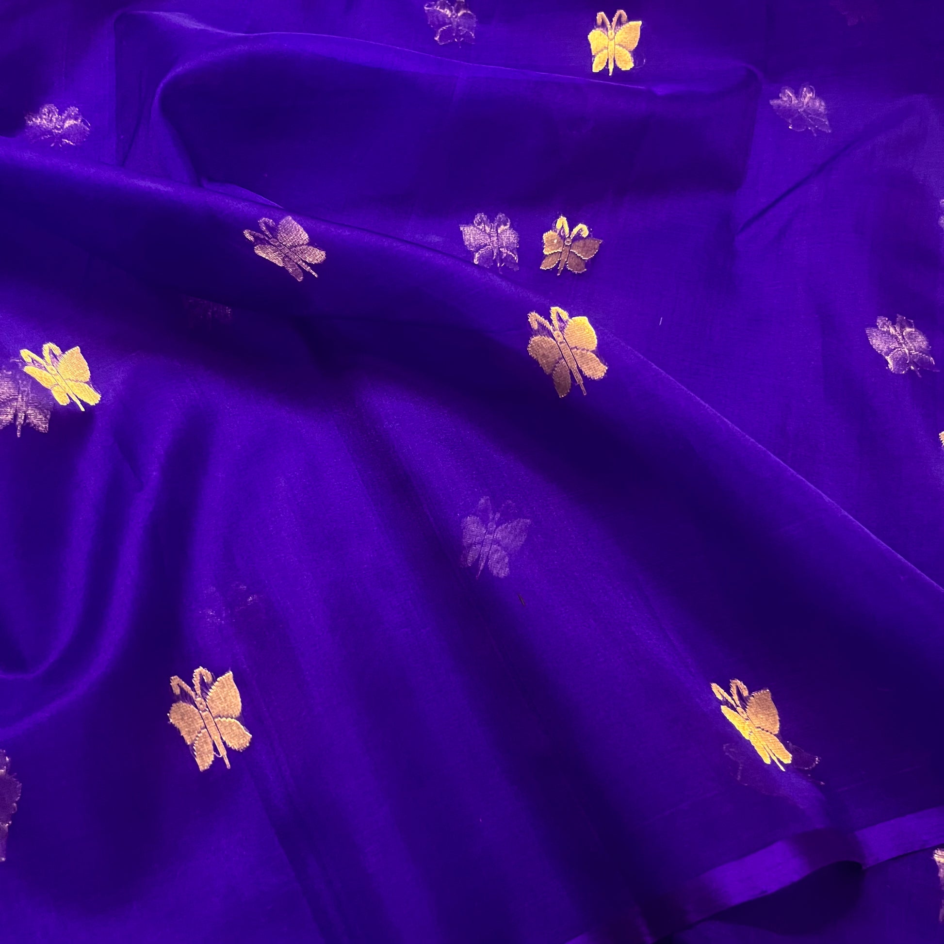 Dark purple chanderi organza silk saree with butterfly motifs all over