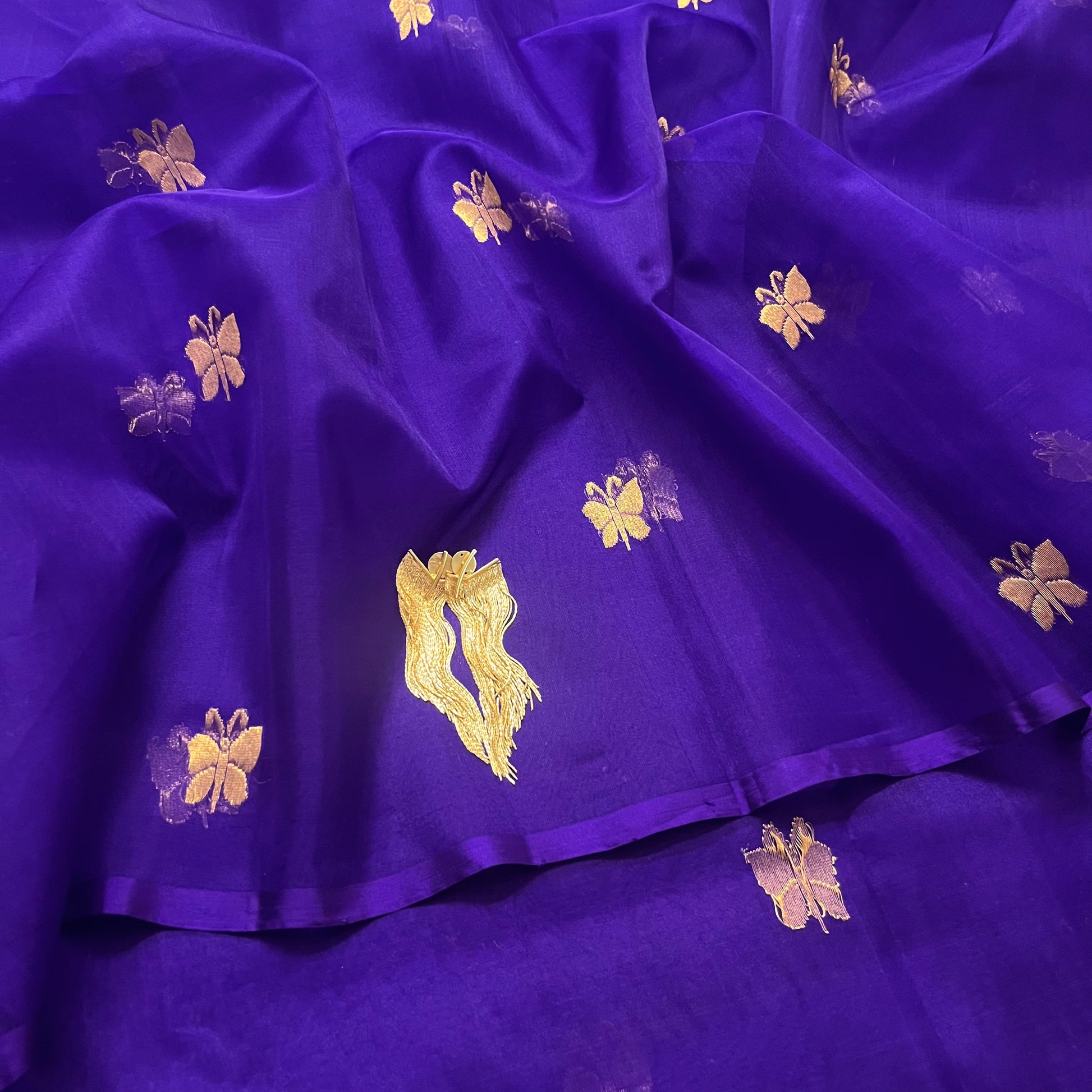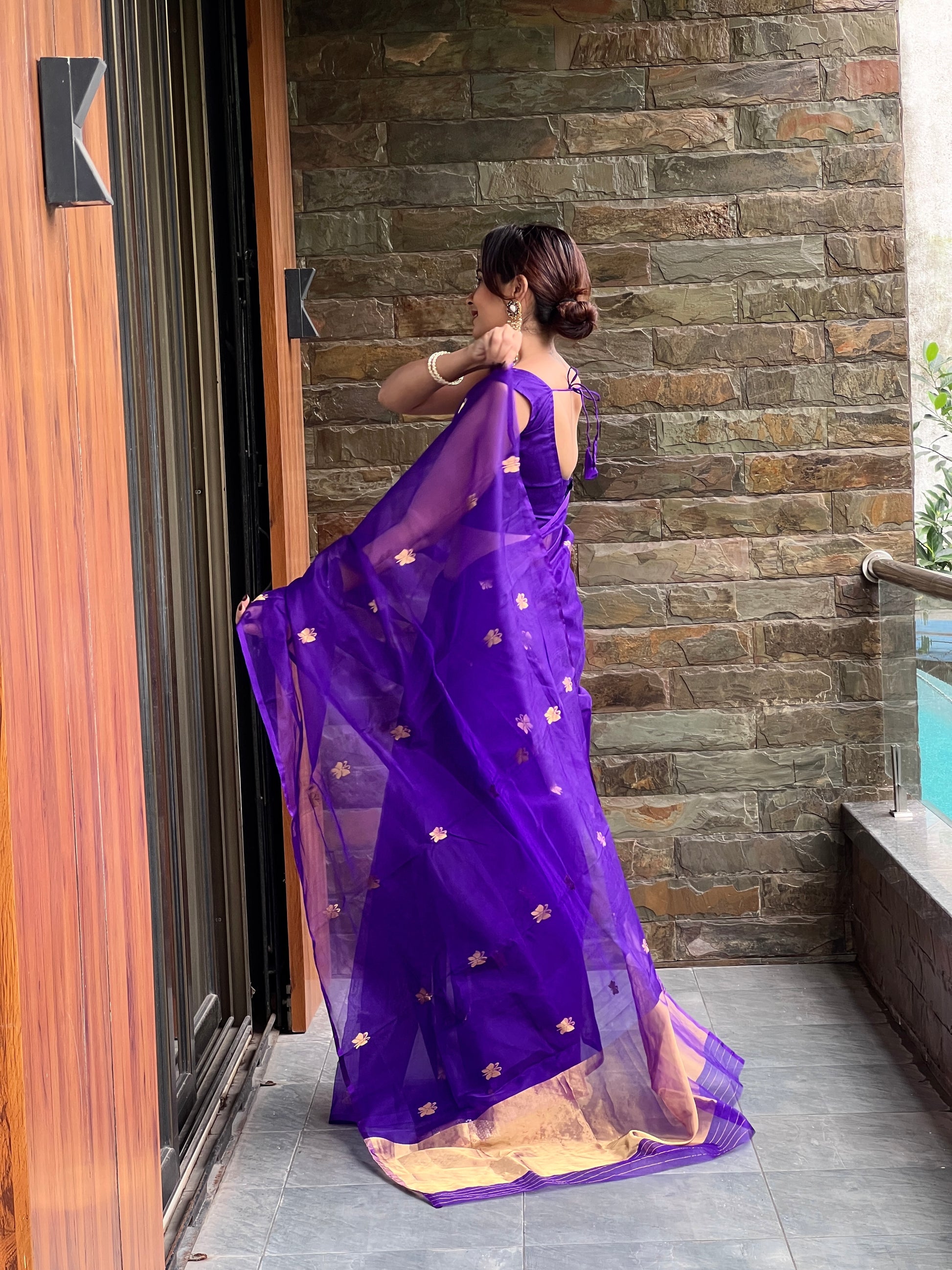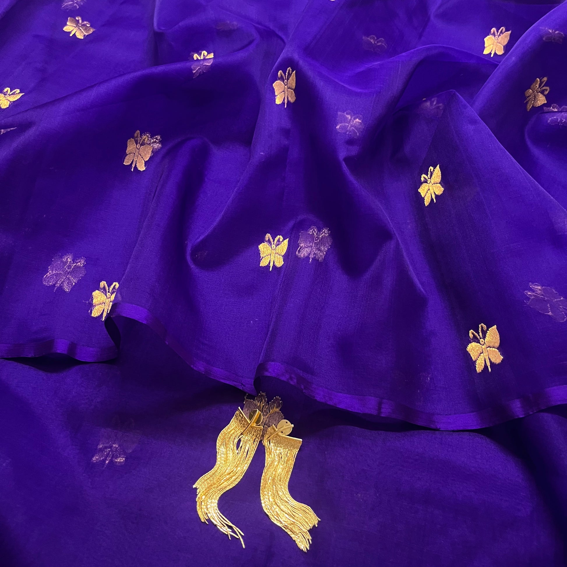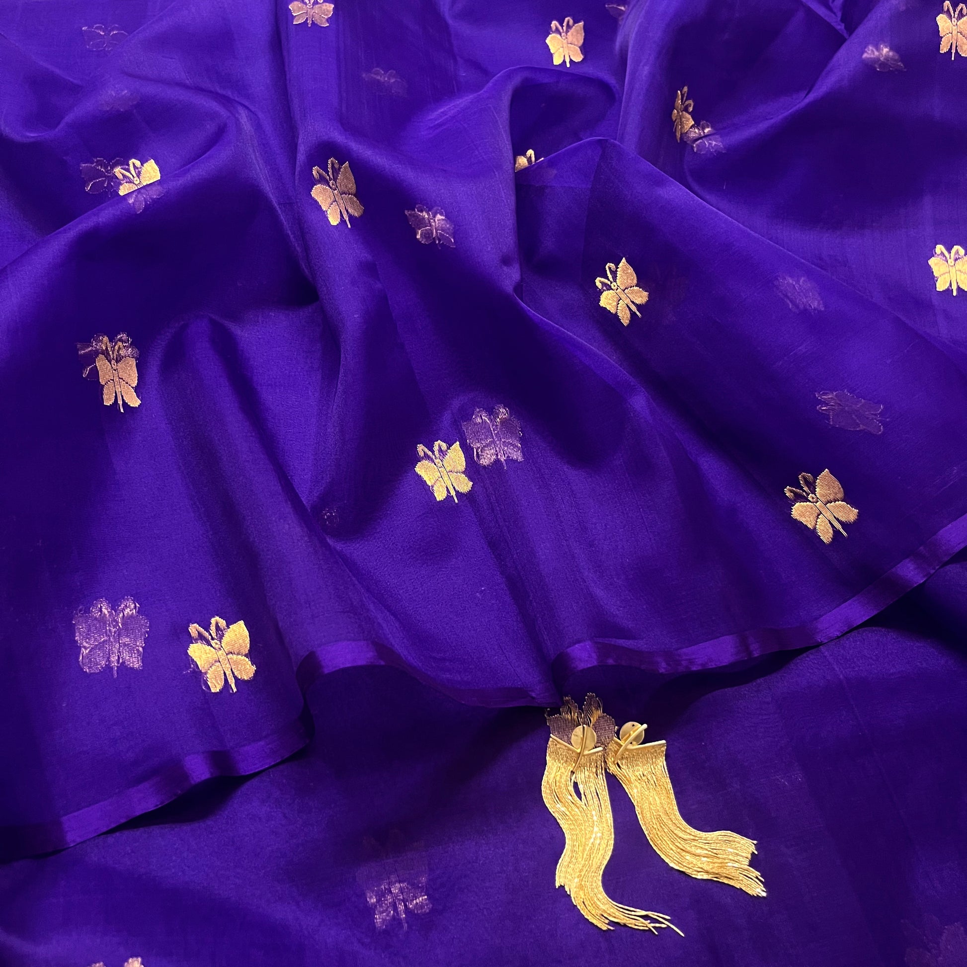 Dark purple chanderi organza silk saree with butterfly motifs all over