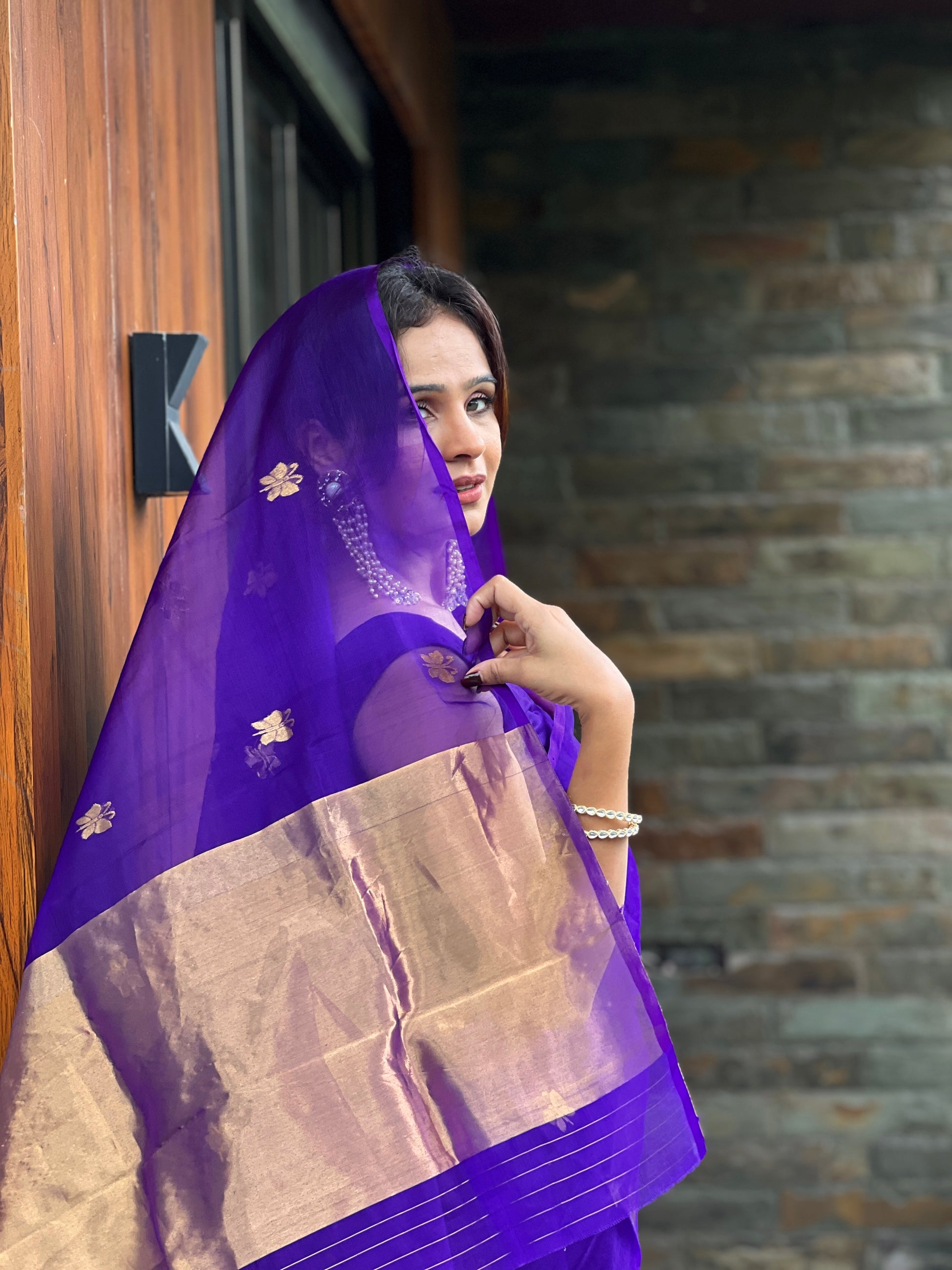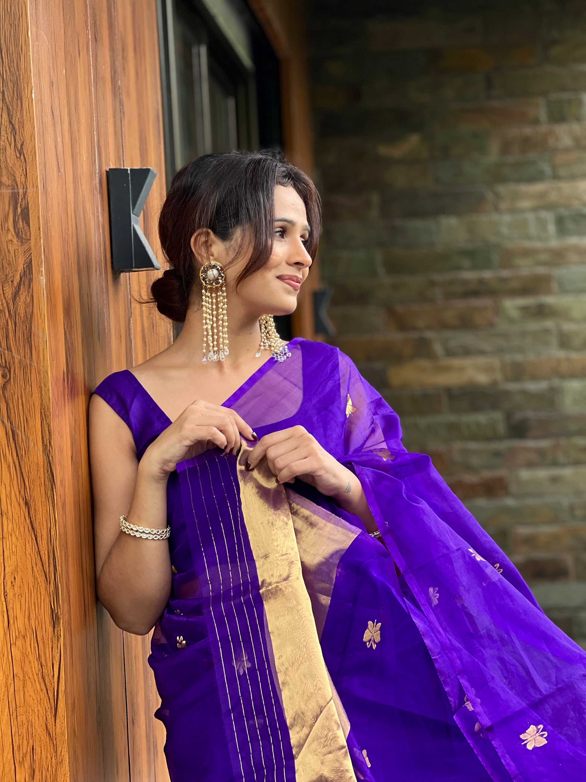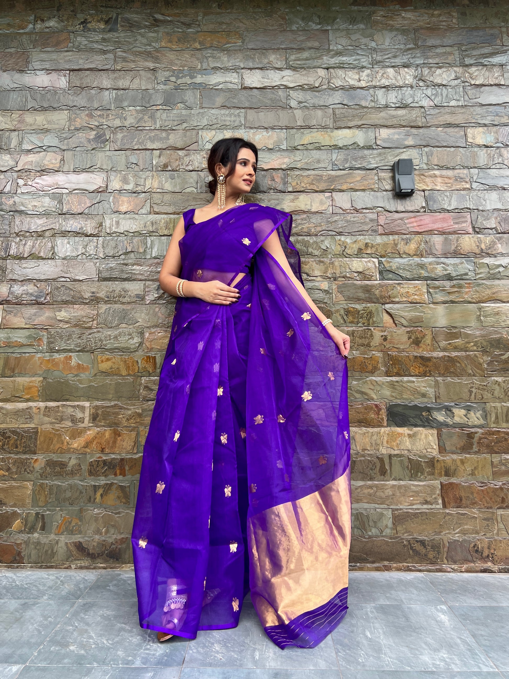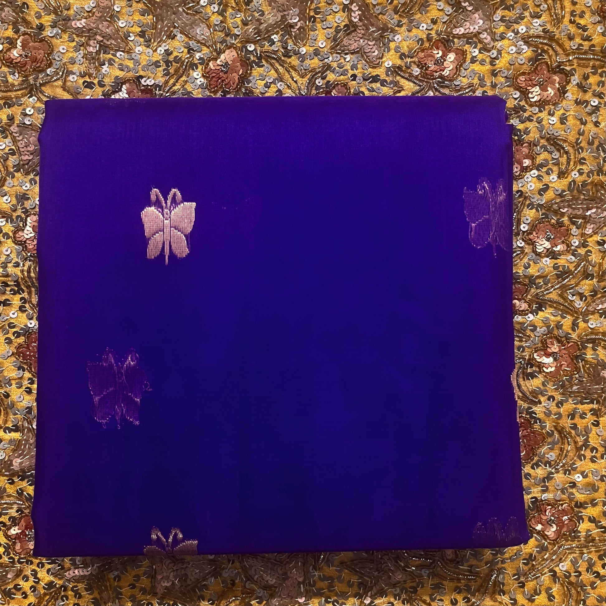 Dark purple chanderi organza silk saree with butterfly motifs all over