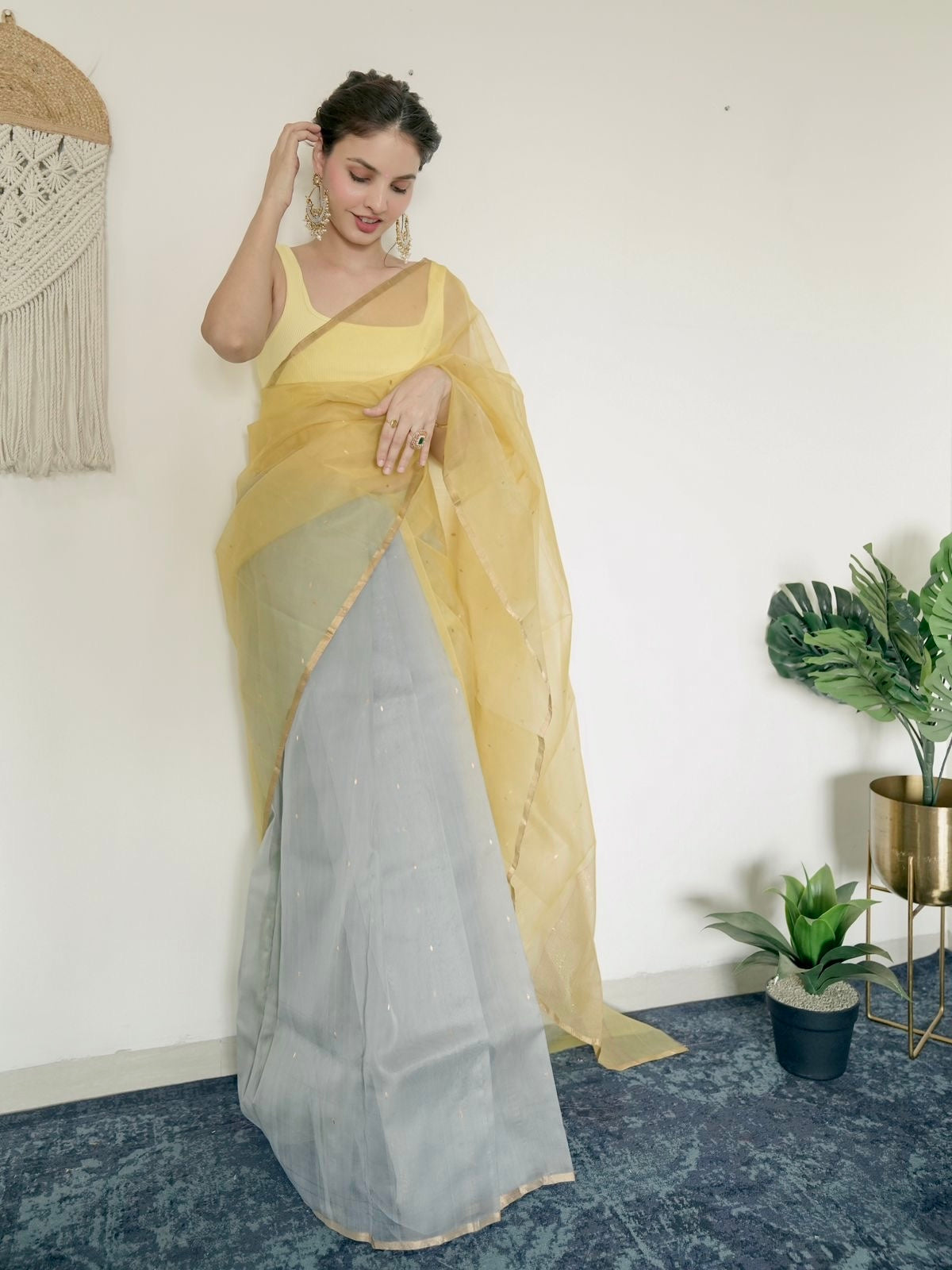 Gold Olive & Grey Chanderi Organza Silk Saree with Zari Bootis all over