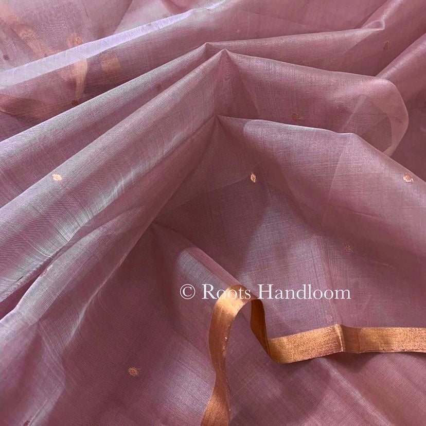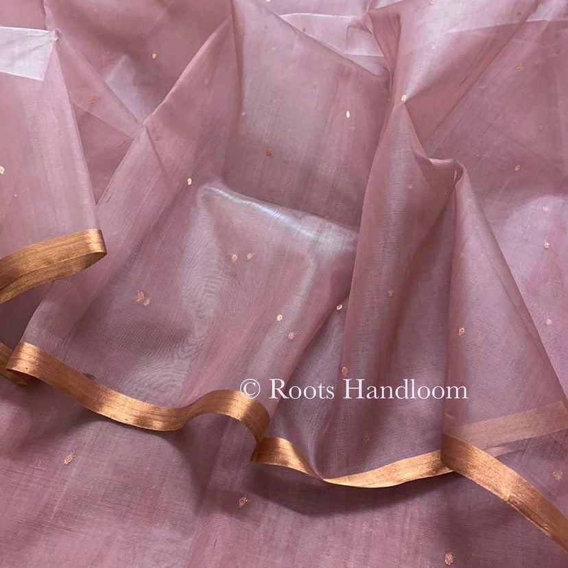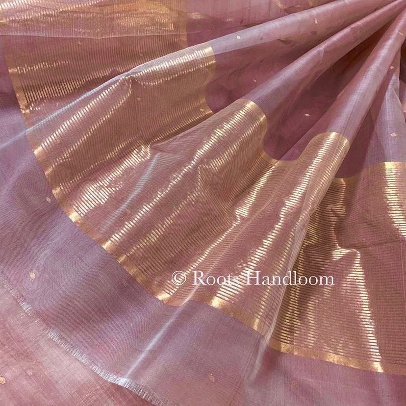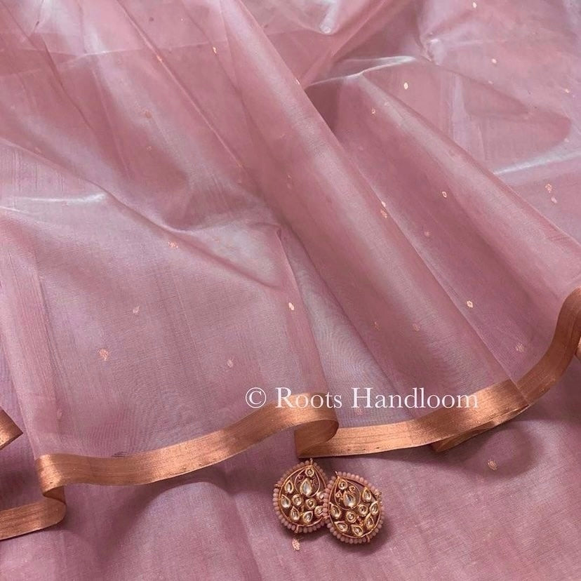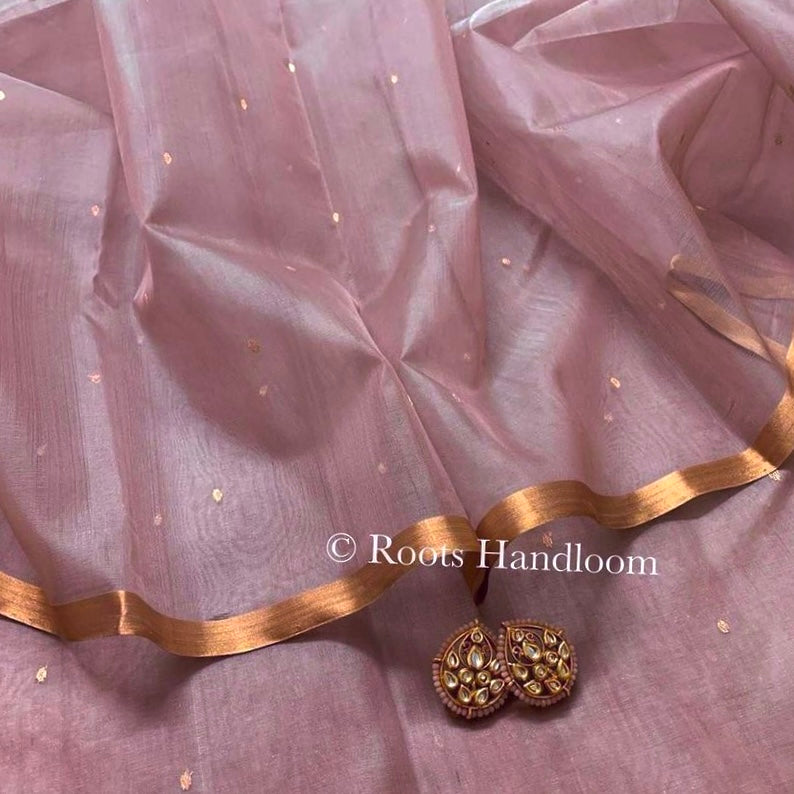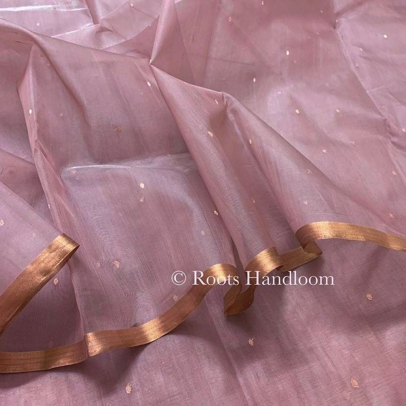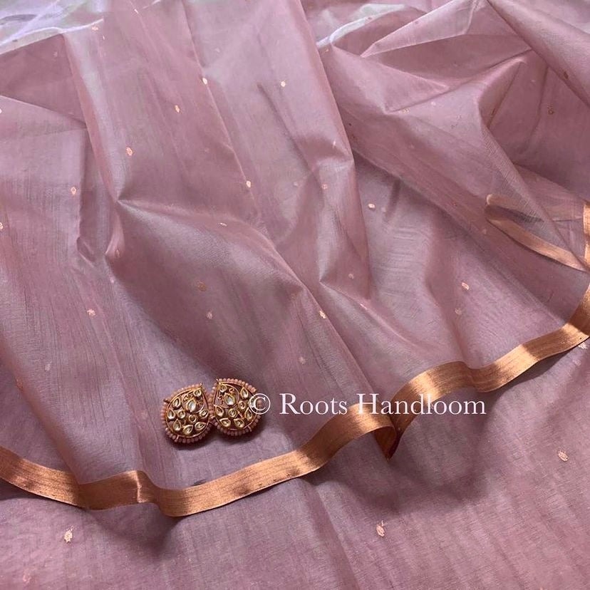 The saree has Zari border with Zari Bootis all over. It comes with a running blouse piece. Fabric of the saree is Chanderi Silk