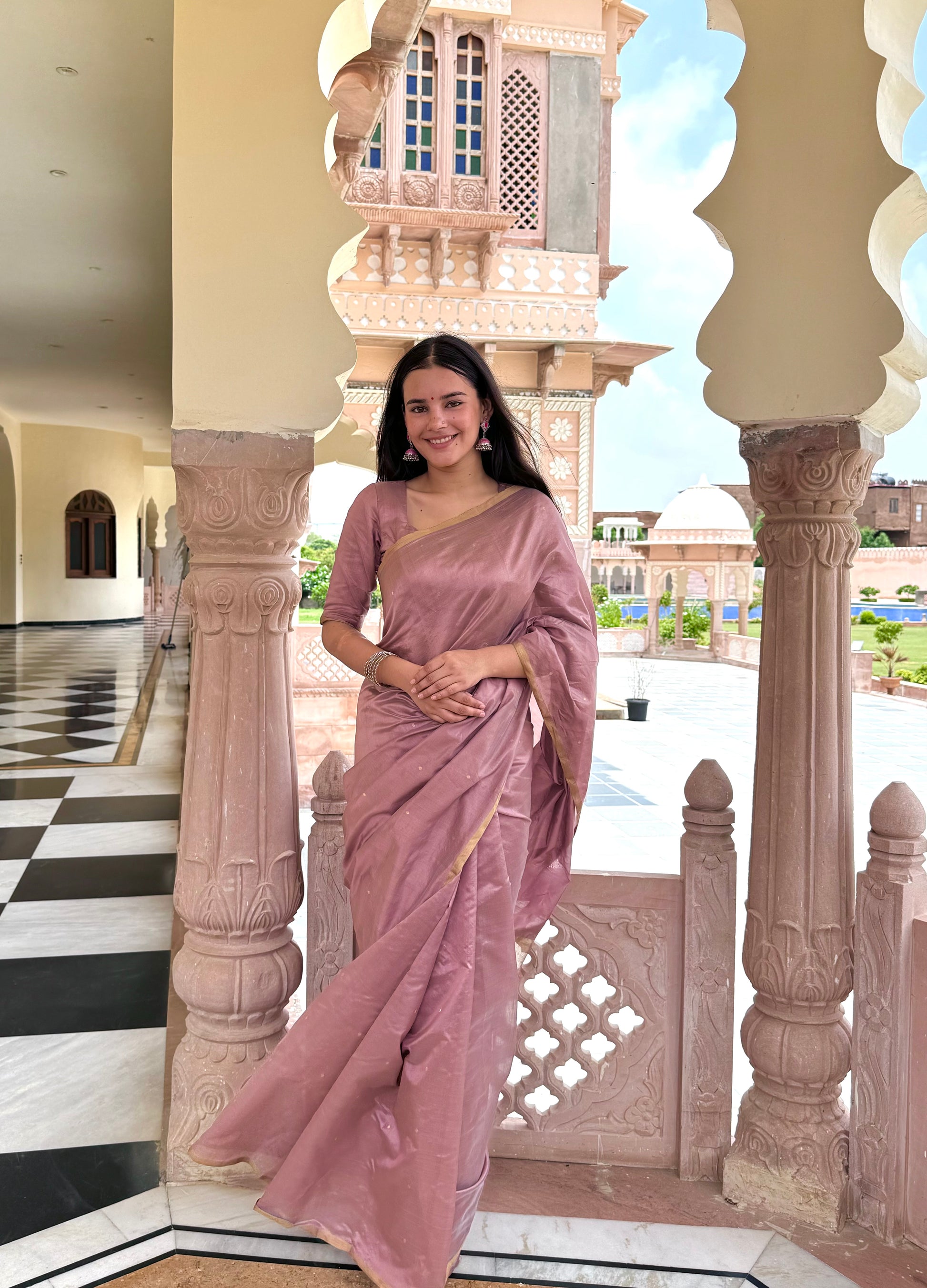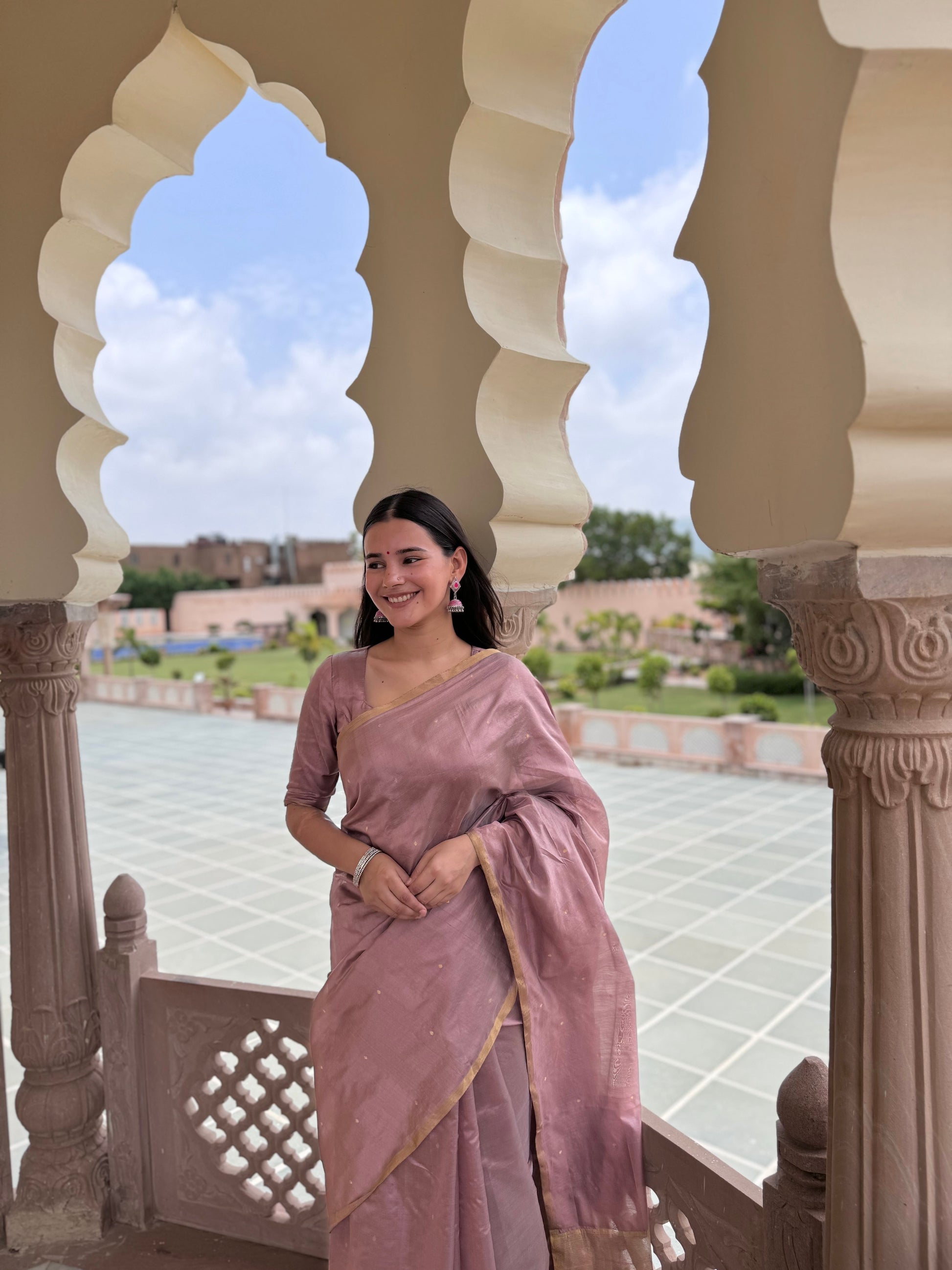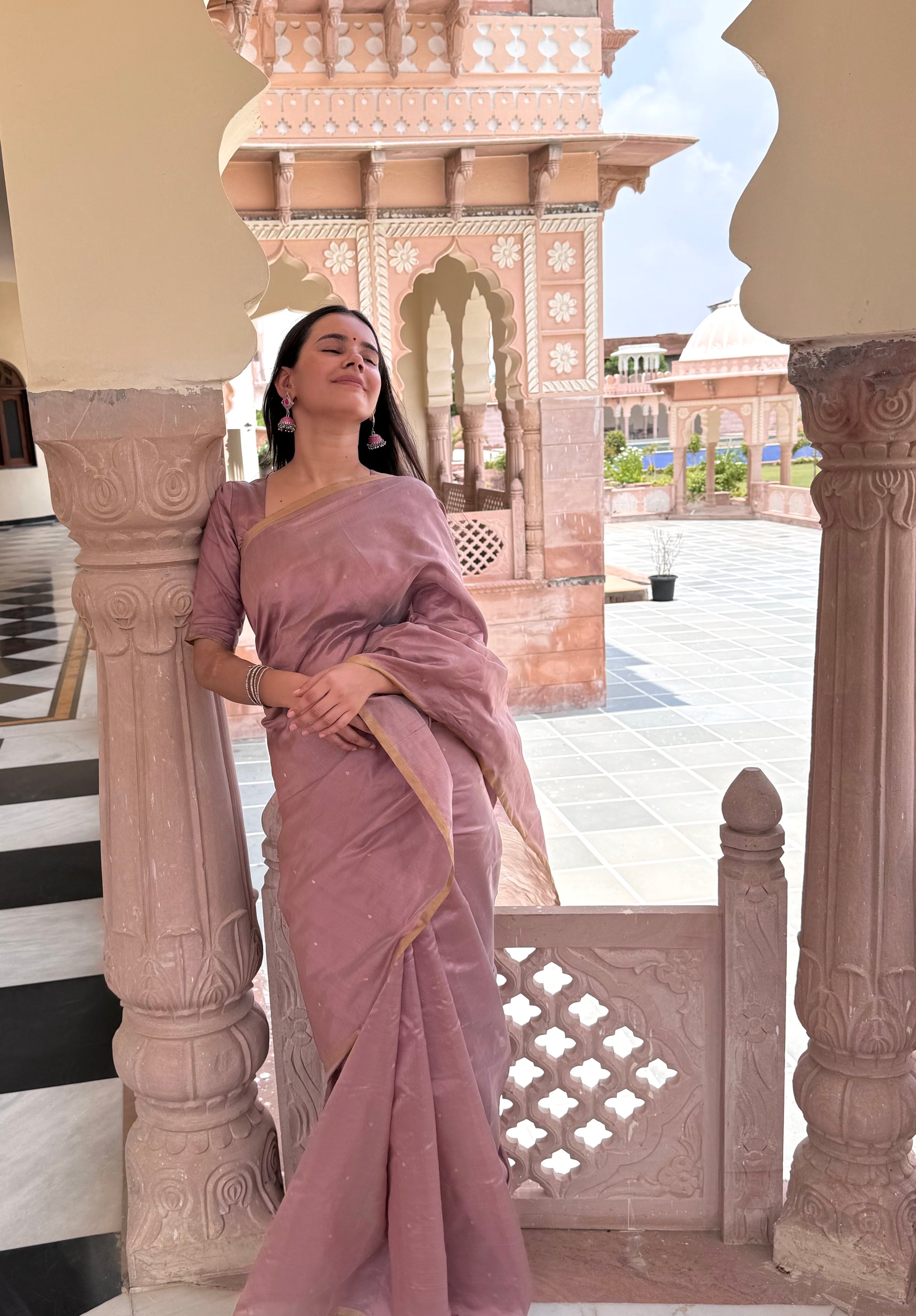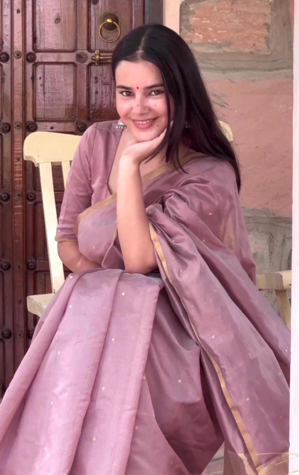 The saree has Zari border with Zari Bootis all over. It comes with a running blouse piece. Fabric of the saree is Chanderi Silk