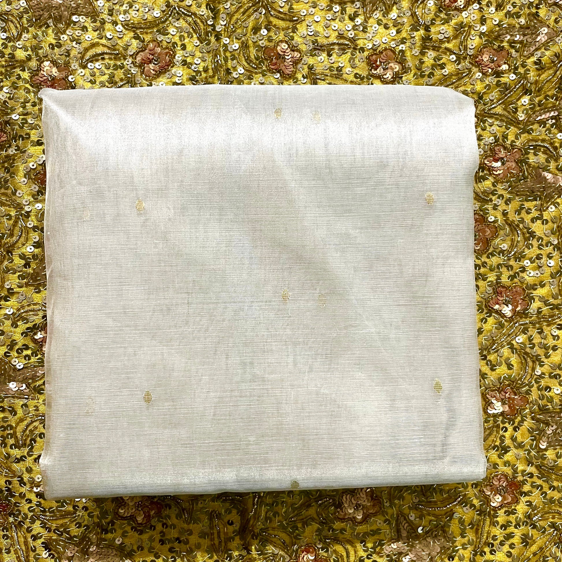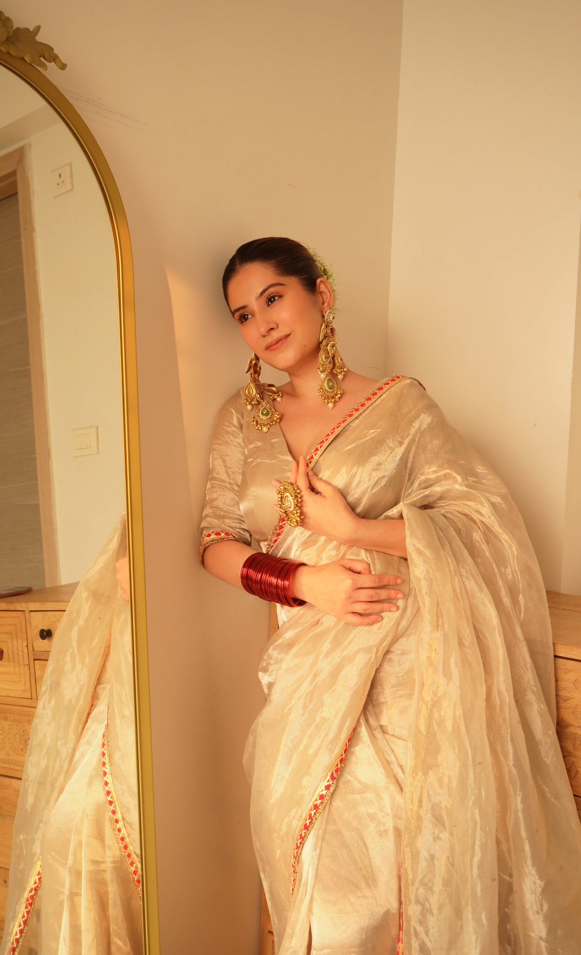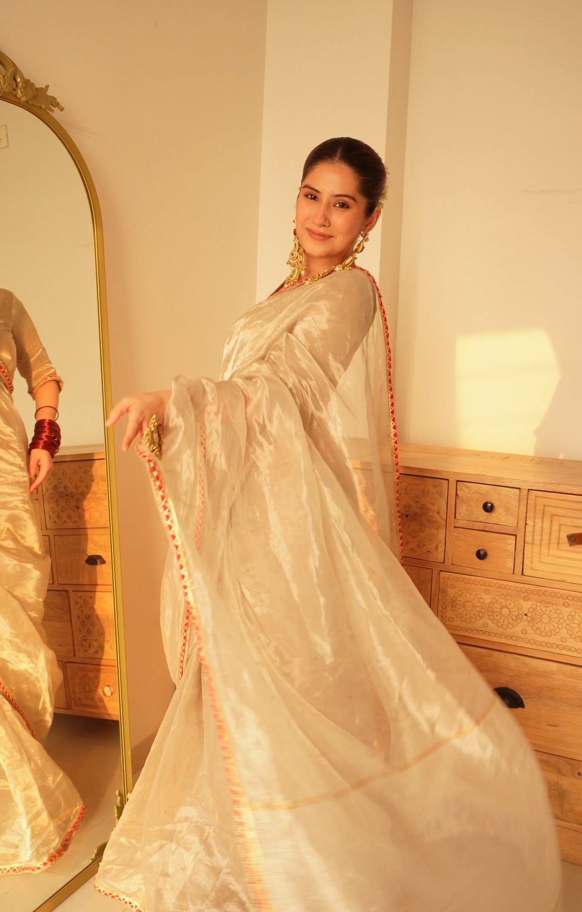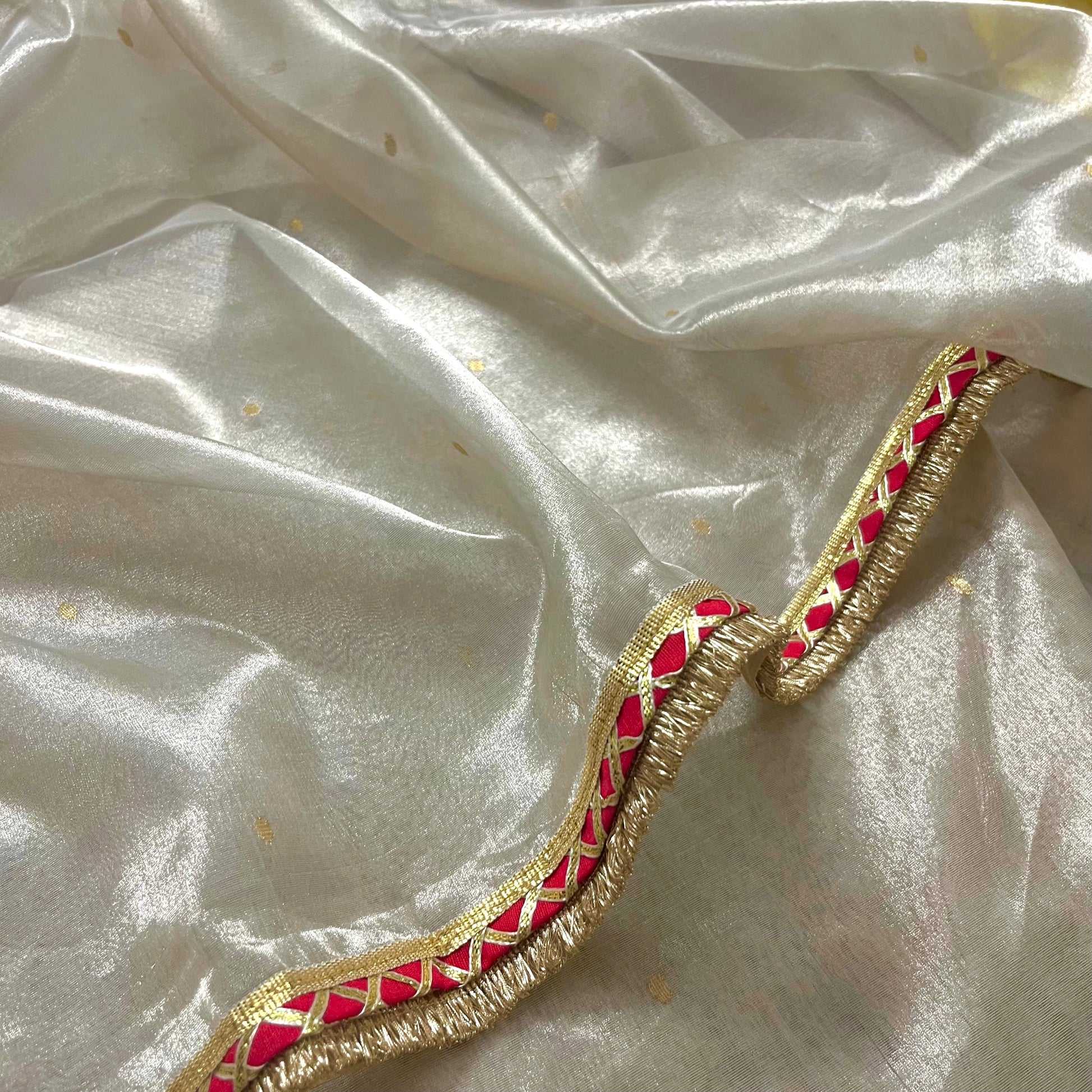 Chantilly cream and red Chanderi tissue silk saree with zari bootis all over