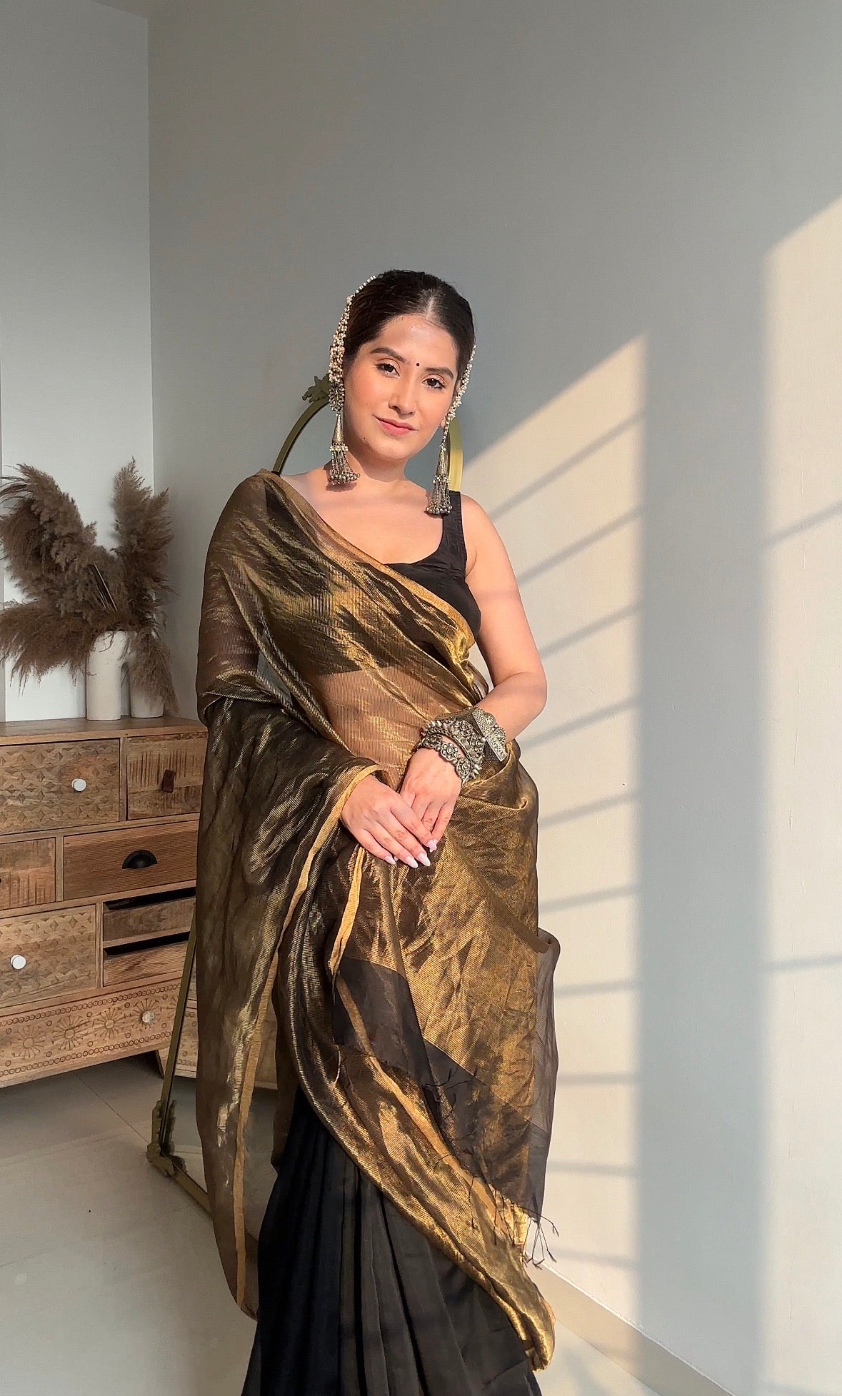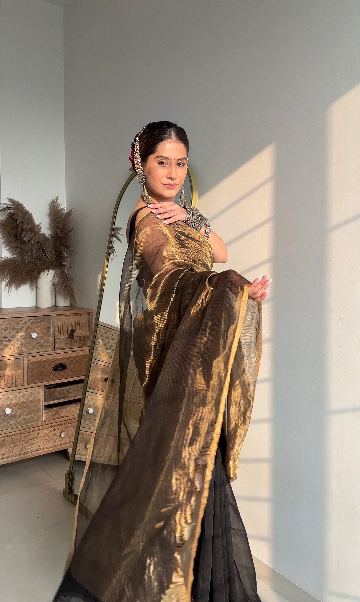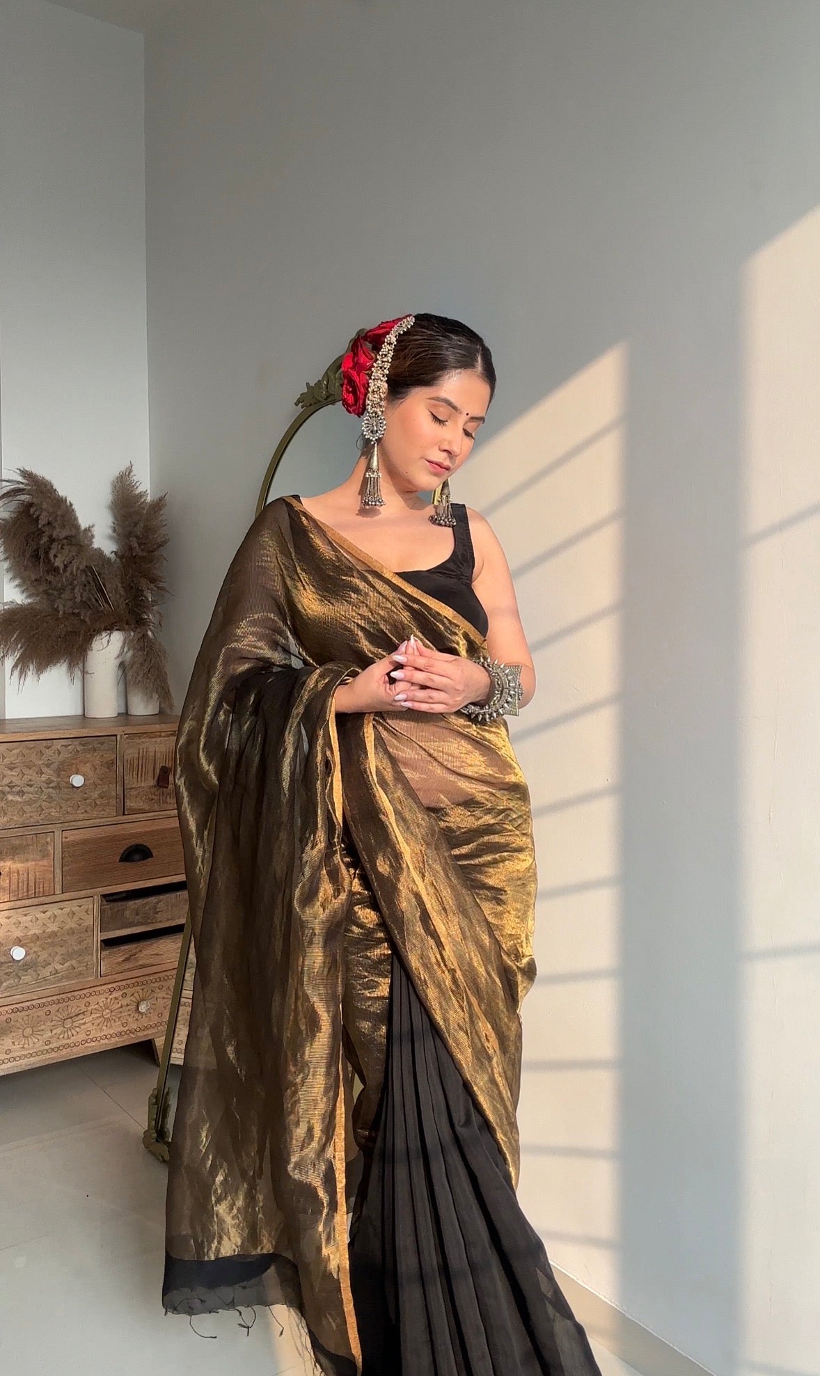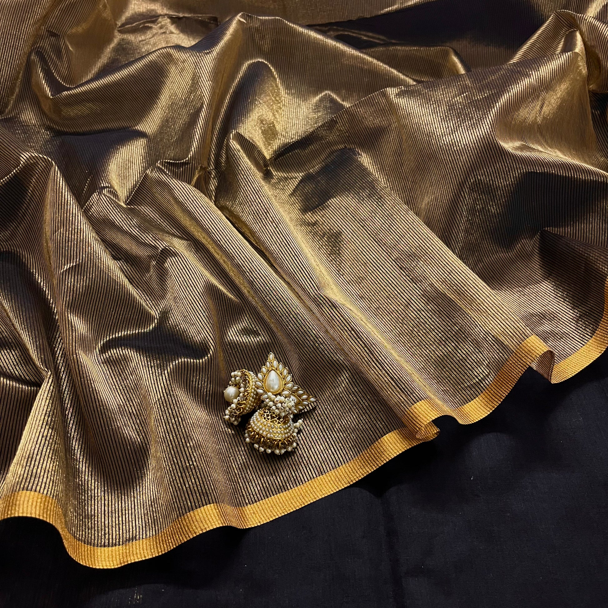 The saree has zari border with gold zari lines on the upper half. It comes with a running blouse piece in black colour. Fabric of the saree is maheshwari cotton silk
