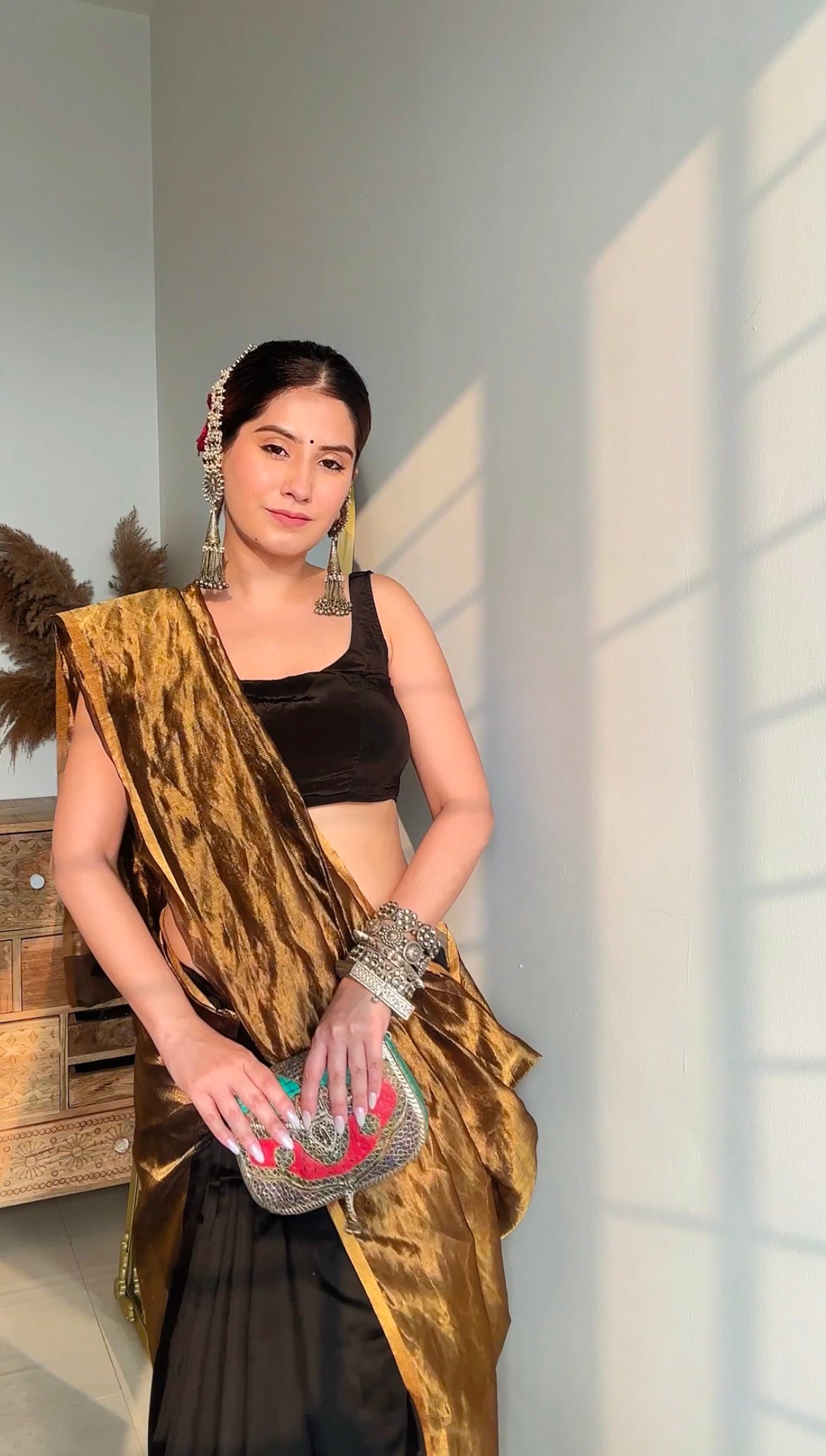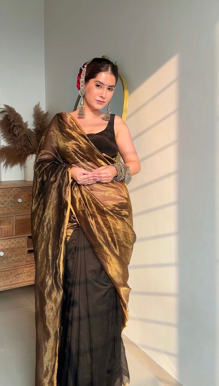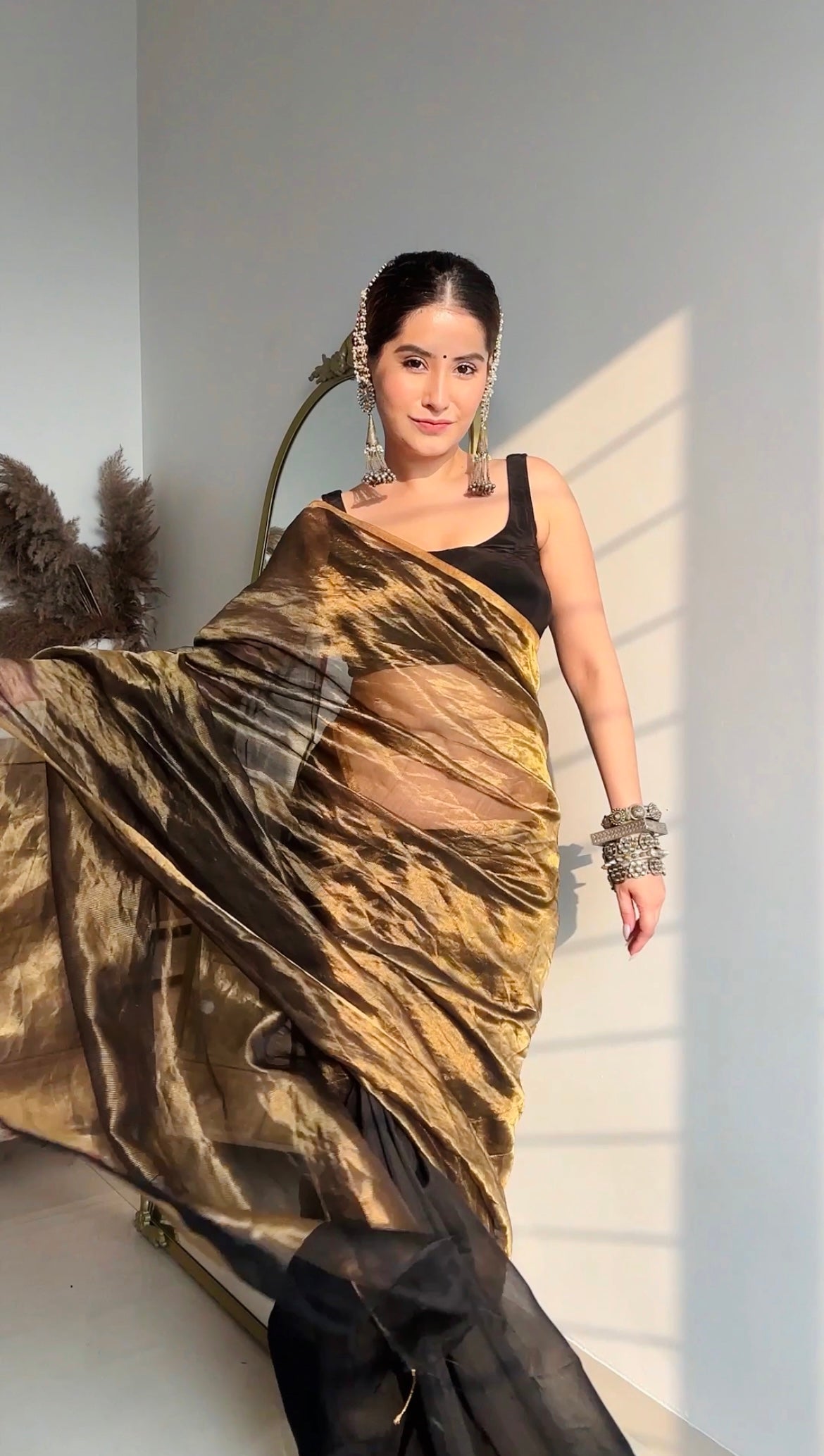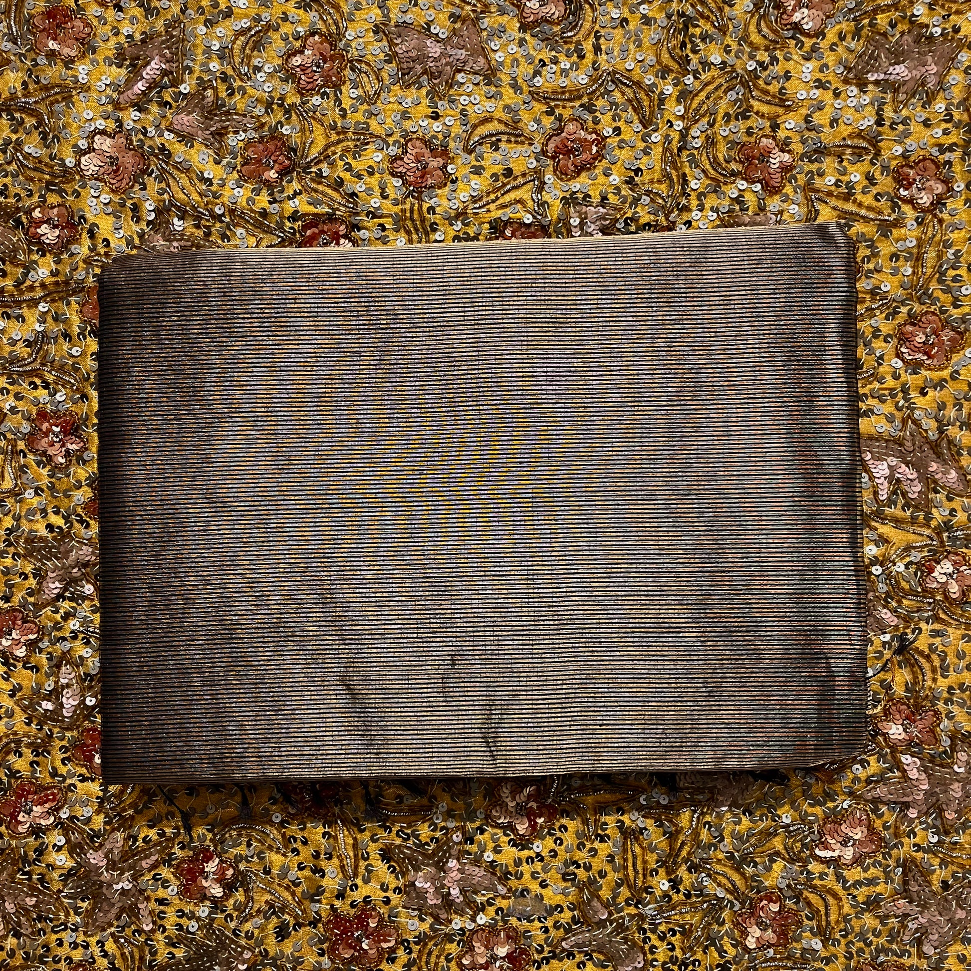 The saree has zari border with gold zari lines on the upper half. It comes with a running blouse piece in black colour. Fabric of the saree is maheshwari cotton silk