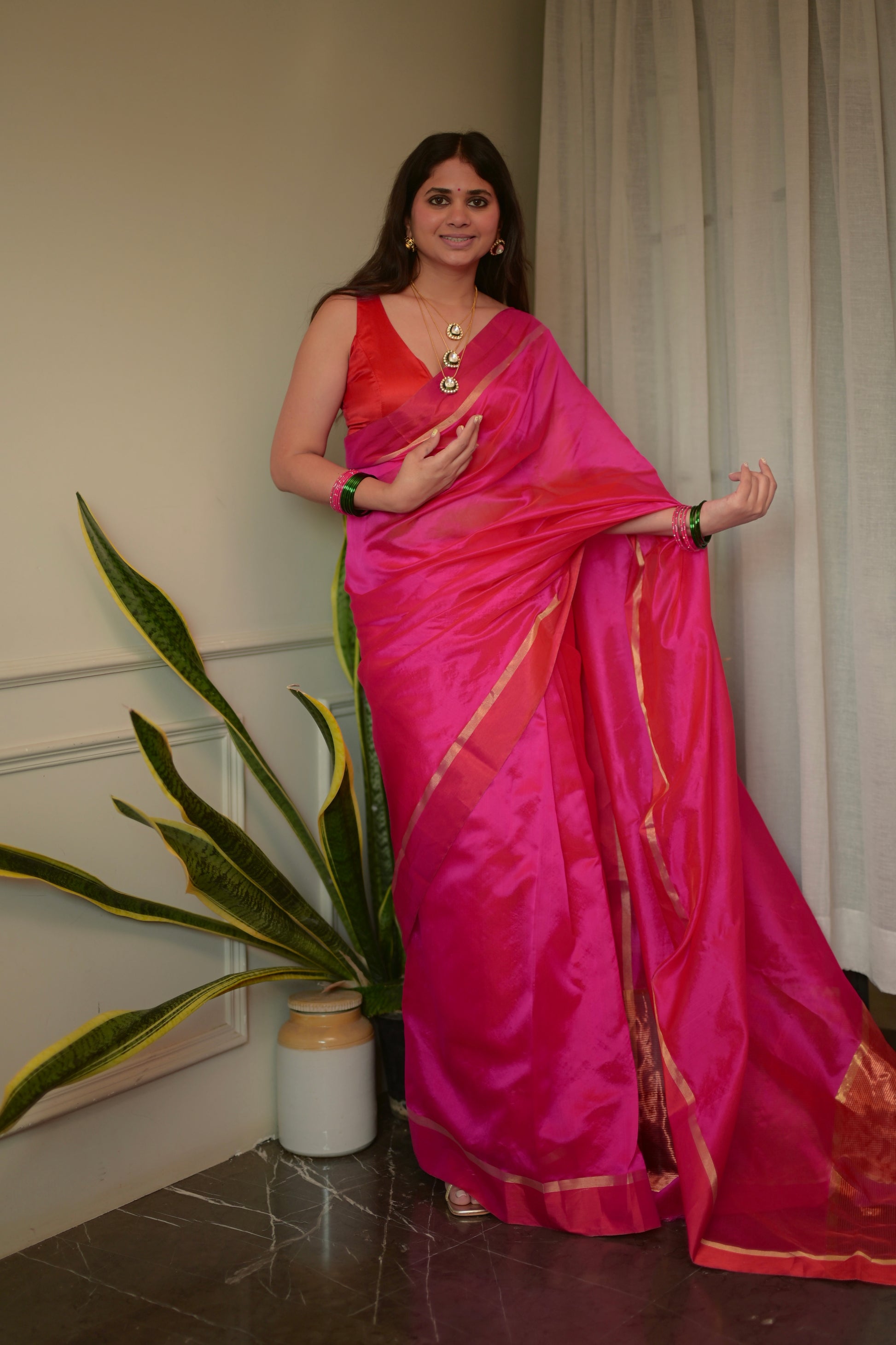 The saree has a silk border and zari lines on pallu. It comes with a contrast blouse piece in red. Fabric of the saree is chanderi pattu silk.