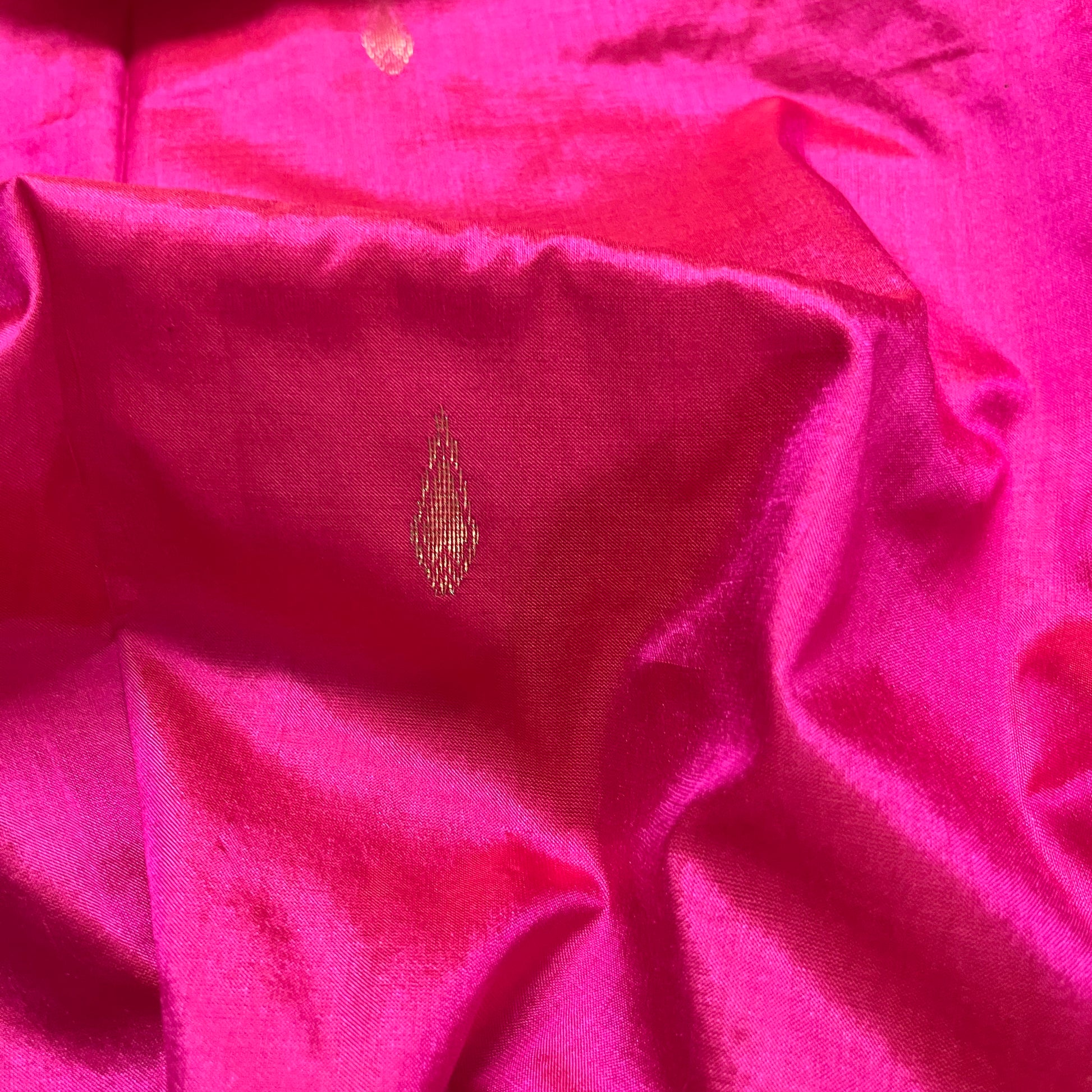 Rani pink Maheshwari silk saree with zari motifs on pallu