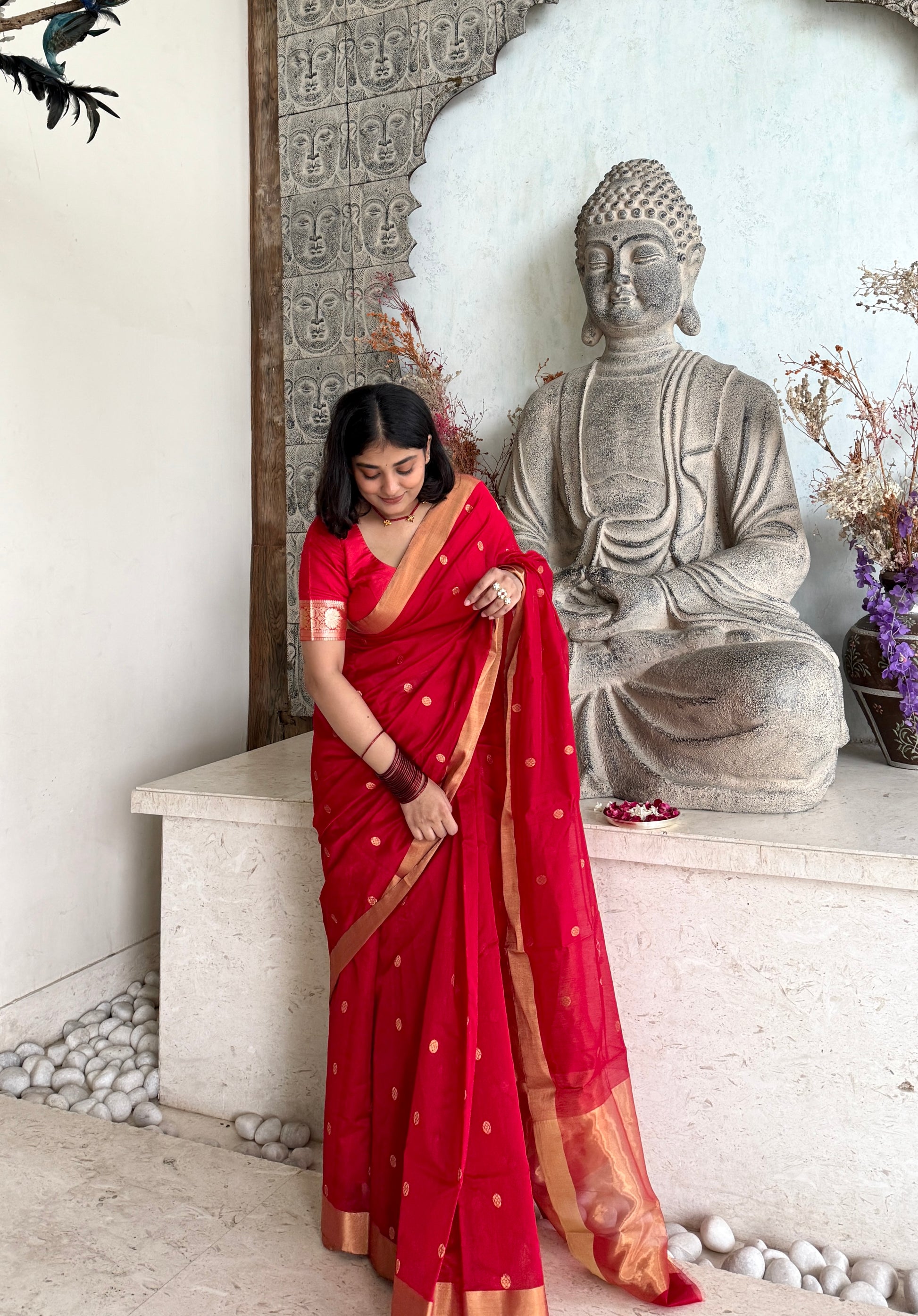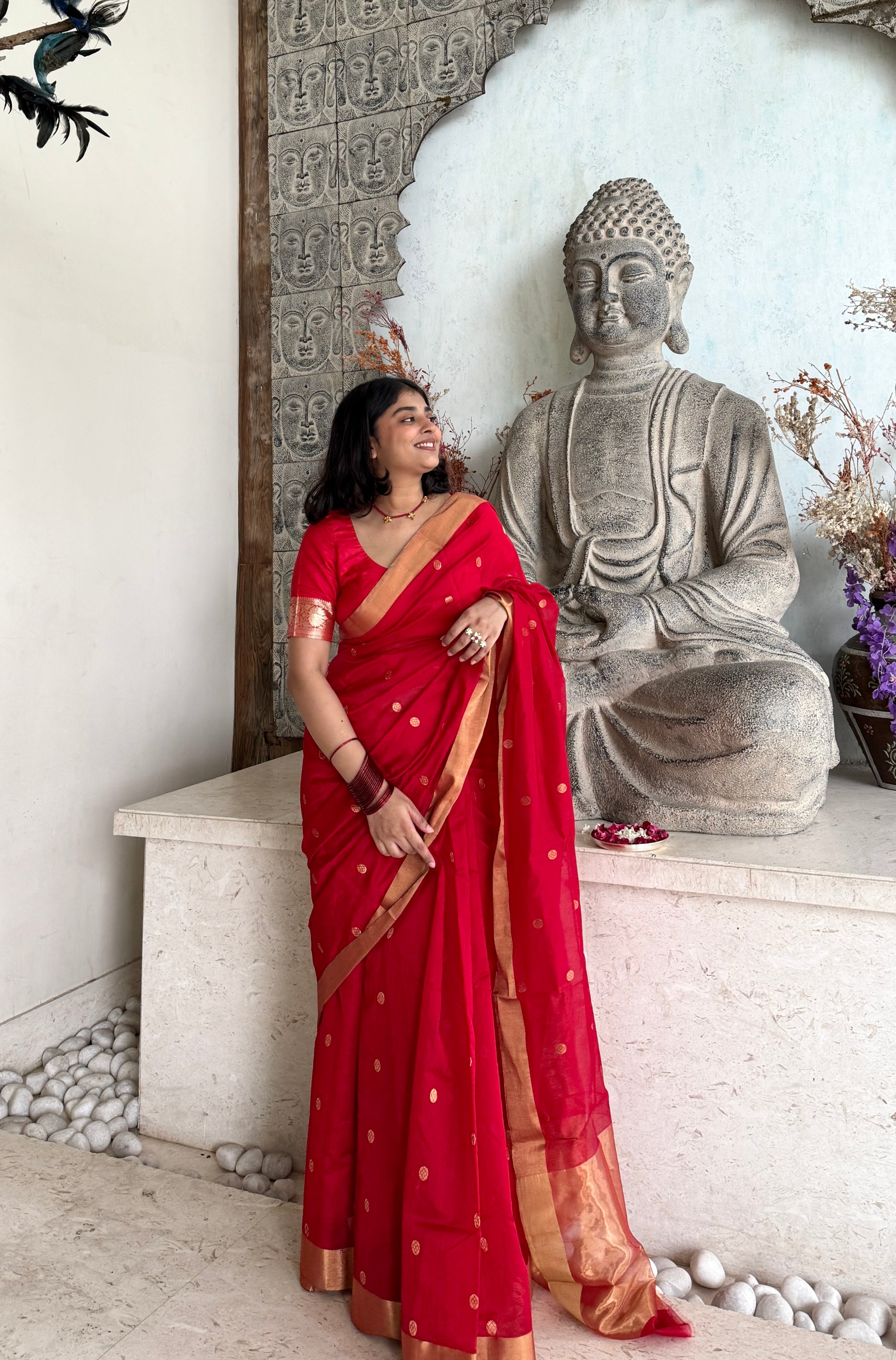 The saree has a zari a border with zari bootis all over. It comes with a Zari Pallu and running blouse piece. Fabric of the saree is Chanderi Cotton Silk